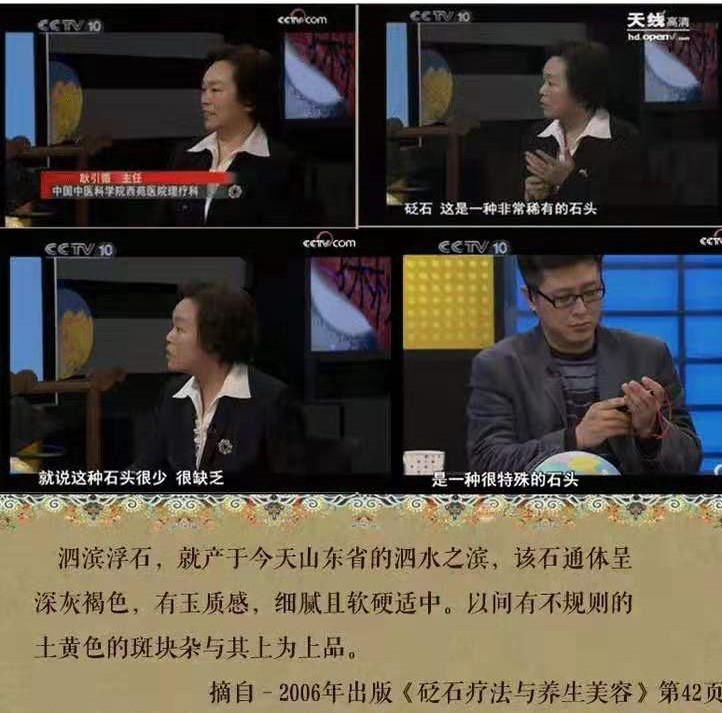 20世纪90年代,泗滨砭石再次被发现。用现代医学手段检测,泗滨砭石可以发出许多对人 体有益的远红外射线和超声波脉冲,相当于远红外治疗仪 + 超声波治疗仪。