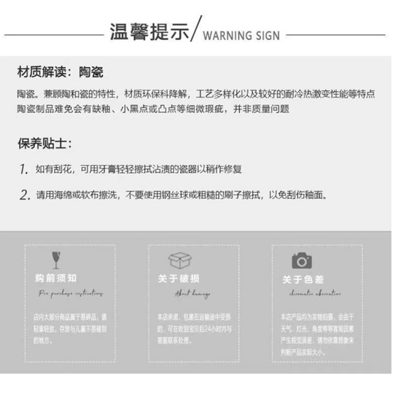 2.陶瓷制品因为工艺问题和高温烧制过程,偶尔会存在某处细微缺瓷或者黑白小点杂质、细小凸起等现象,不影响美观和使用