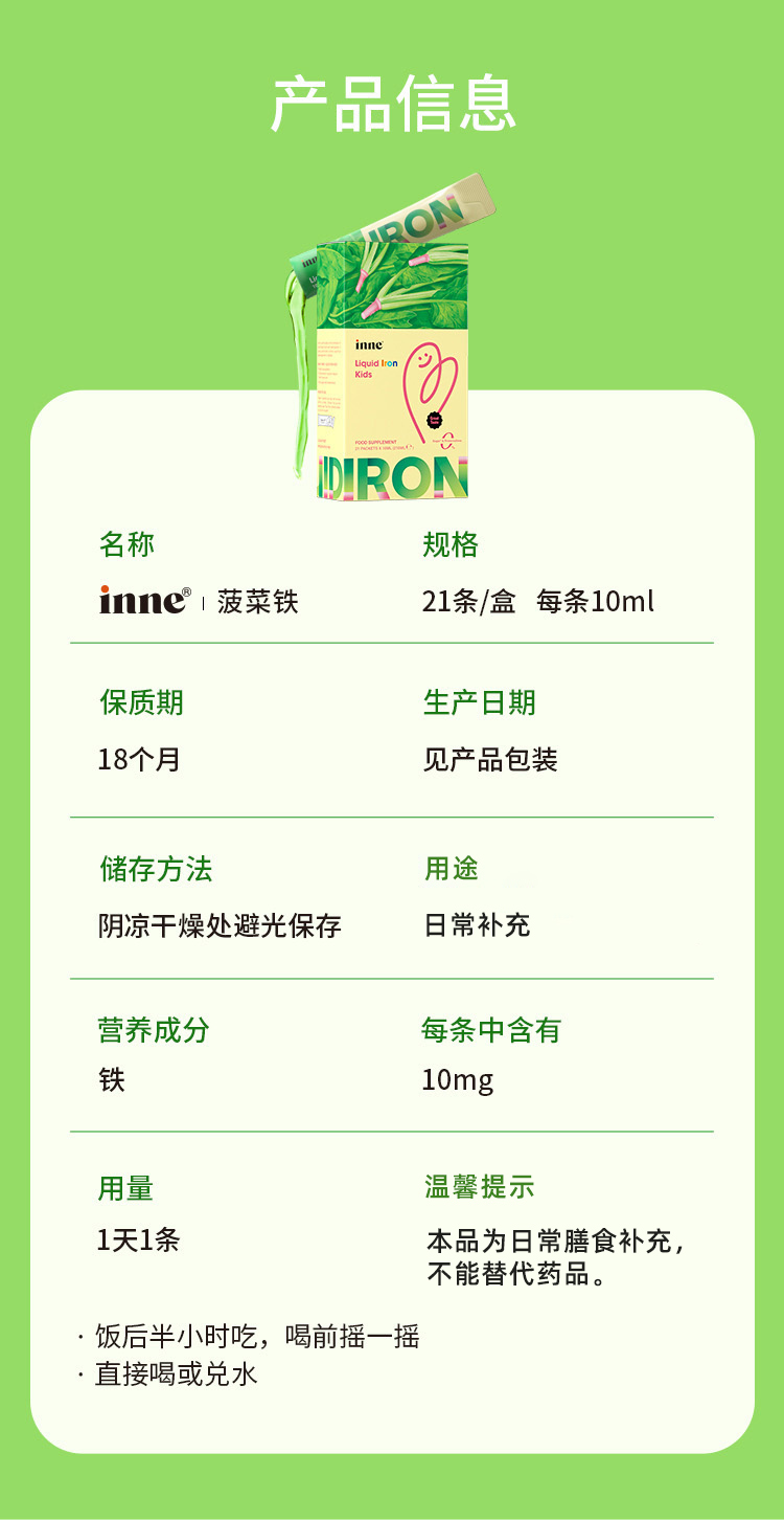 (含税)新包装童年Inne菠菜铁婴幼儿儿童铁剂补铁10ml*21条