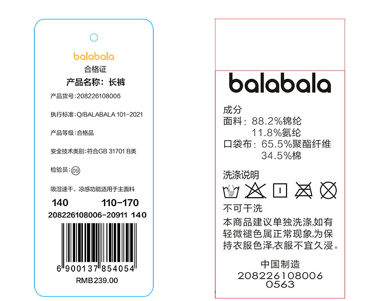 【balaOne】巴拉巴拉童装儿童裤子女童长裤夏装薄款2026新款速干