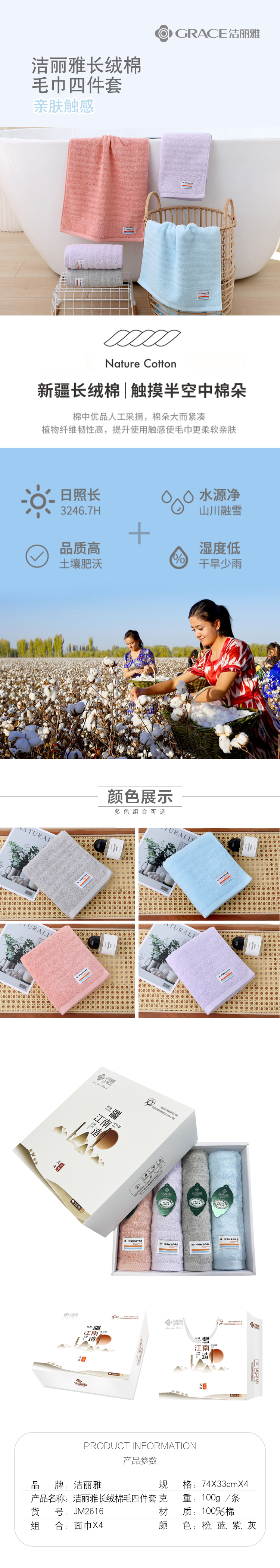 洁丽雅(grace)长绒棉毛巾四件套JM2616(发货颜色随机)
