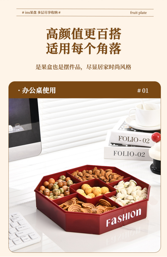 这款干果盒按格分装零食,收纳整洁有序。无论摆在家里还是送给亲朋好友,都会给人一种温暖、亲切的感觉。