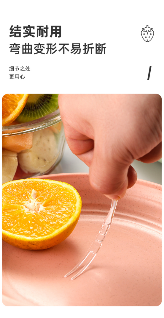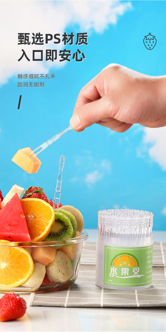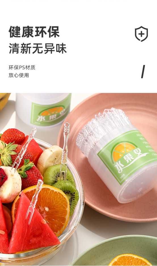 🛒水果叉采用优质食品级PS材质制作,无异味可与食物直接接触, 密封可回收利用的瓶装,干净卫生,拿取方便快捷 手柄的长度刚刚好,符合人体手部曲线设计, 手柄处特别添加了花纹设计,防滑好拿捏🤏不易掉落