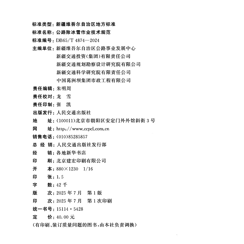 书名:公路除冰雪作业技术规范(DB65/T 4874—2024 )