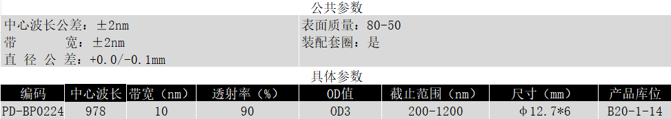 BP978/10K OD3@200-1200 T>90% Φ12.7*6 带通滤光片 (带套圈)