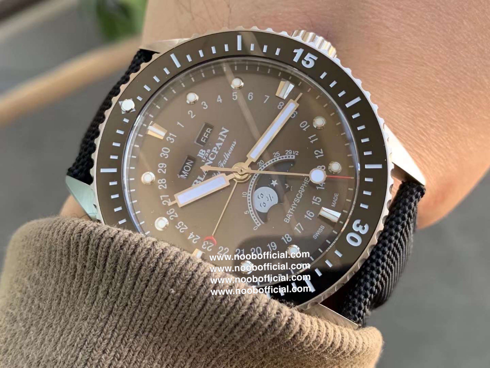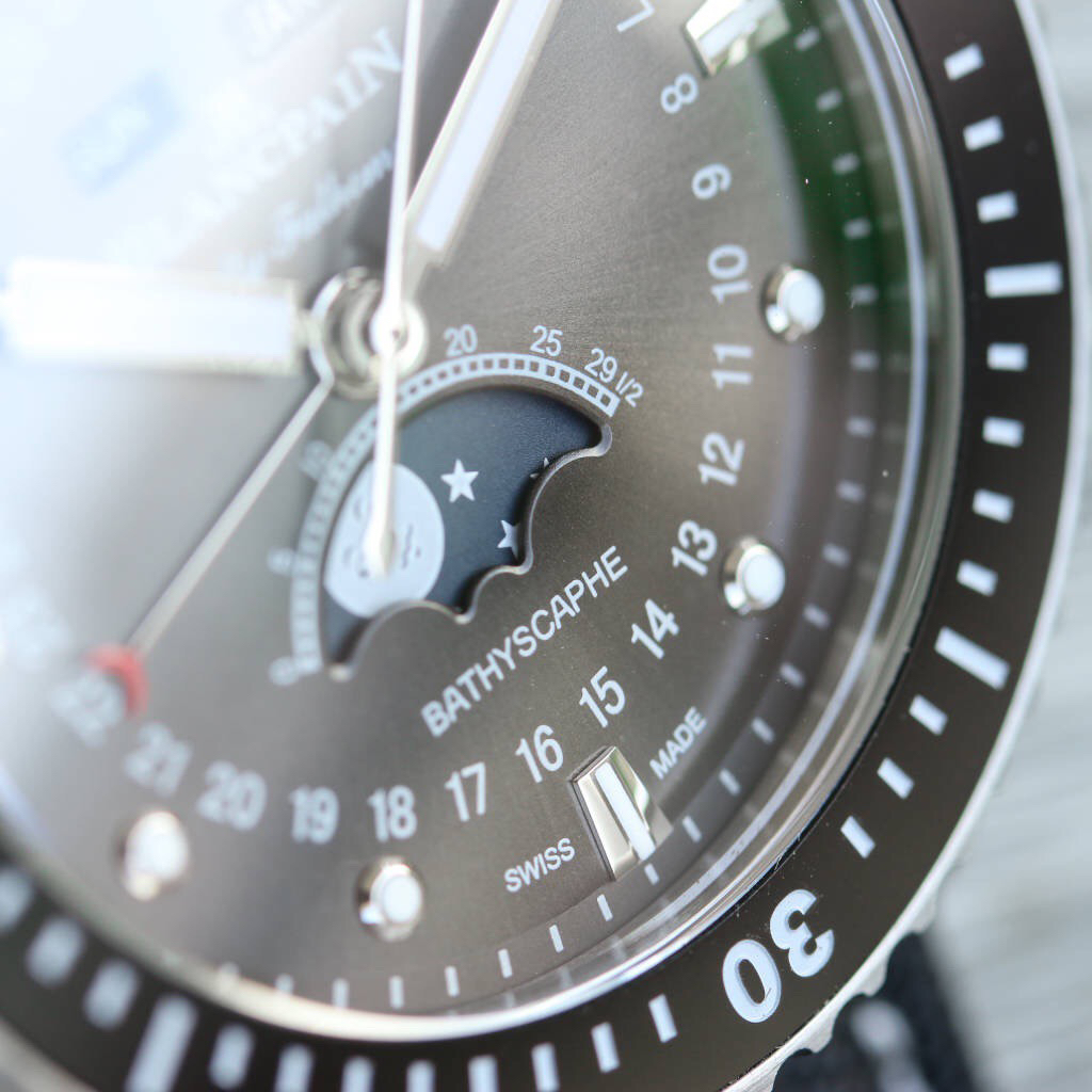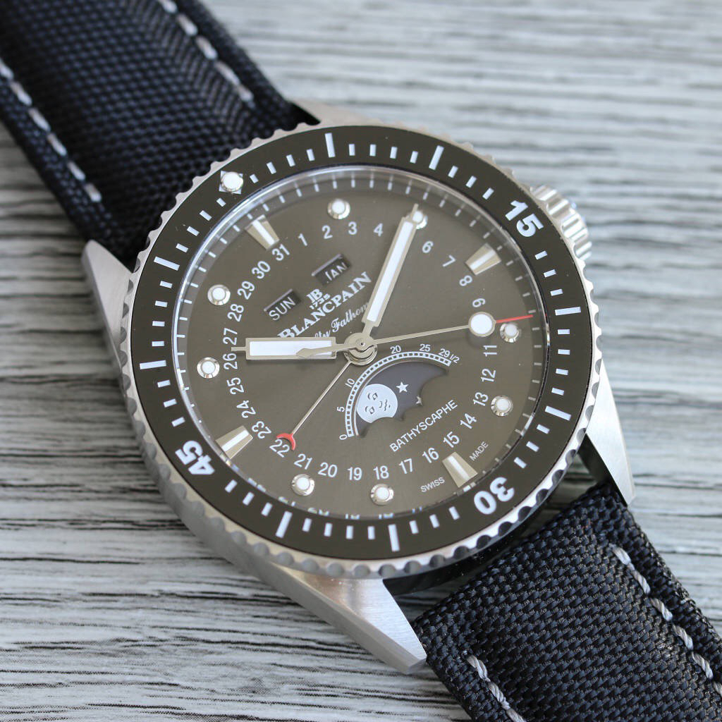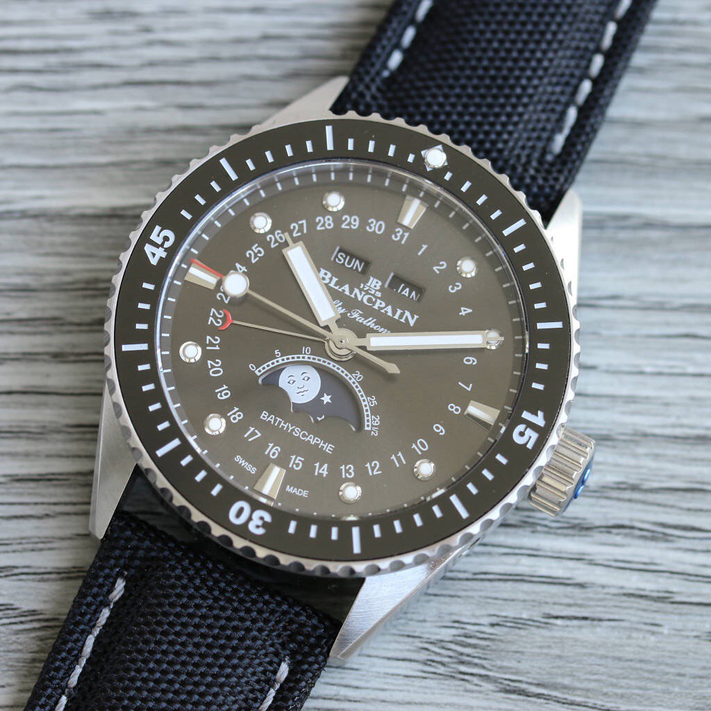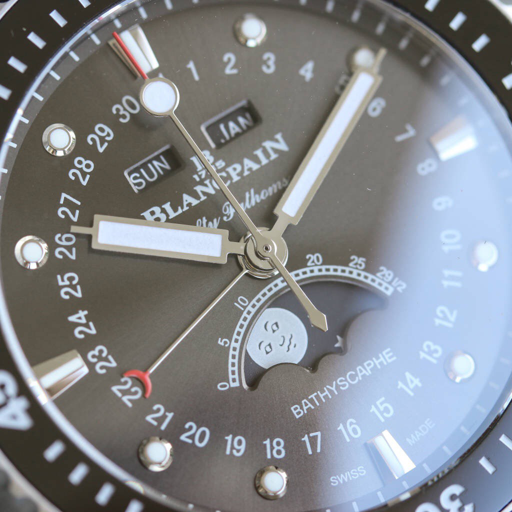 TW新力作 宝珀五十寻系列,5054-1110-B52A。压轴巨献,大三针夜光设计,直径43毫米!搭载6654.P自动机械机芯,具备星期显示,日期显示。月份显示,年份显示,月相显示