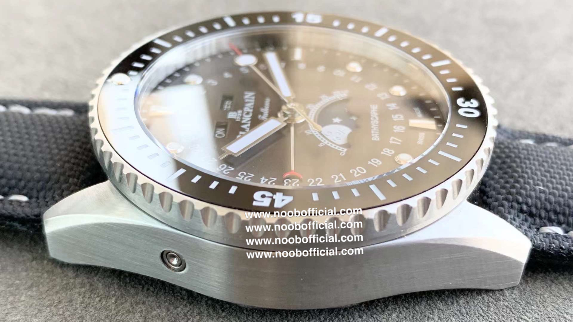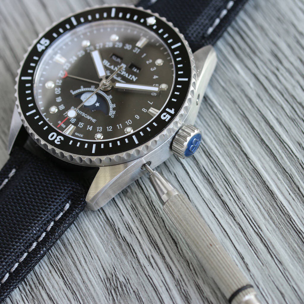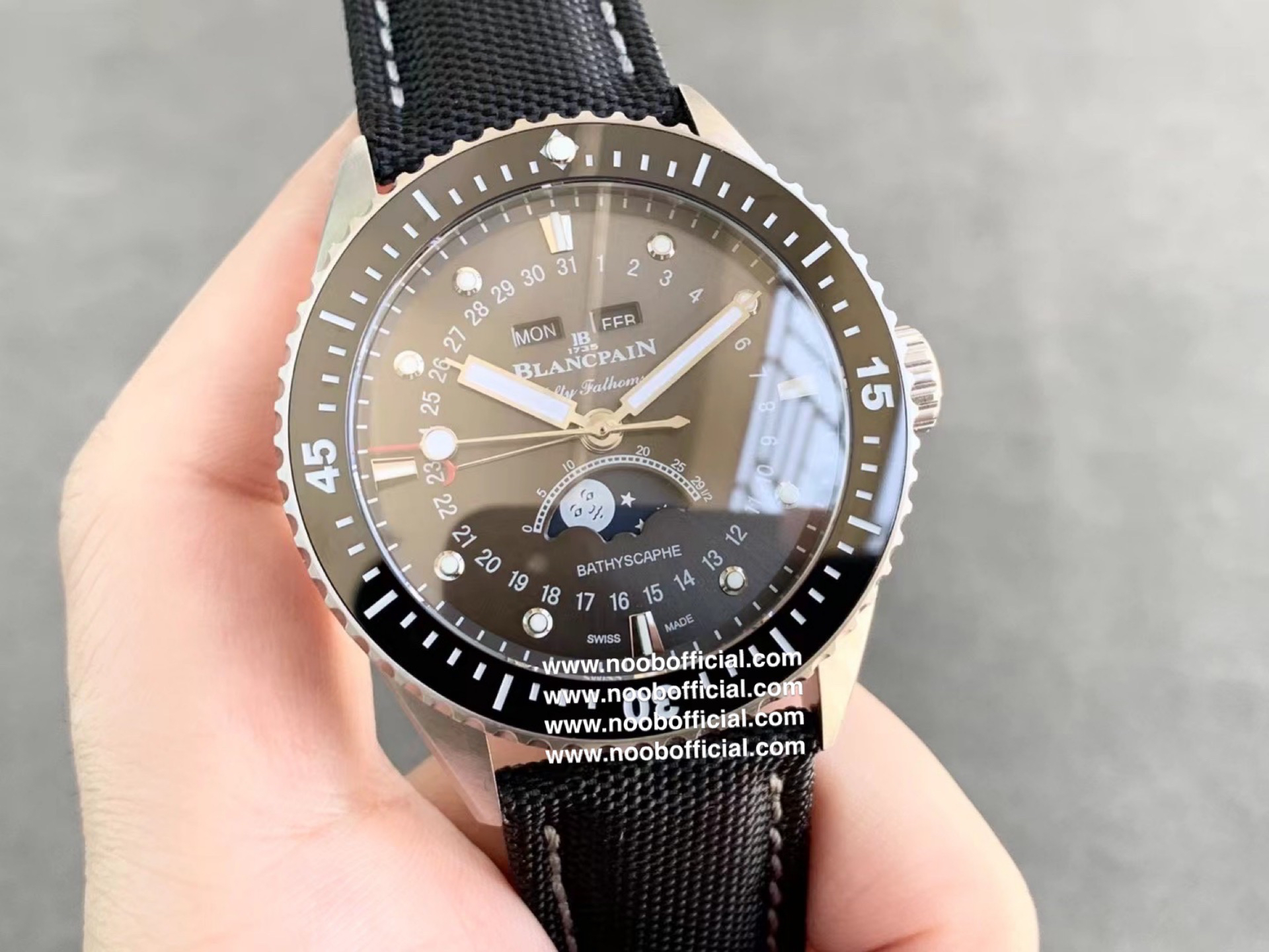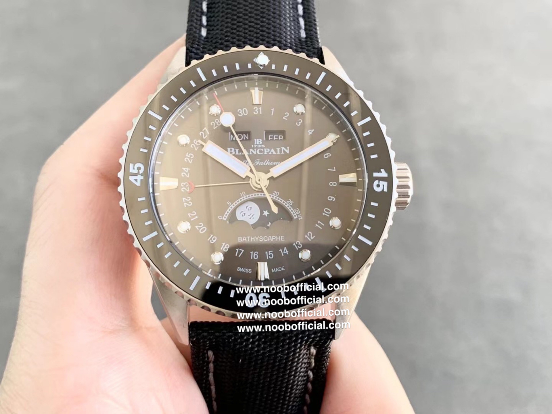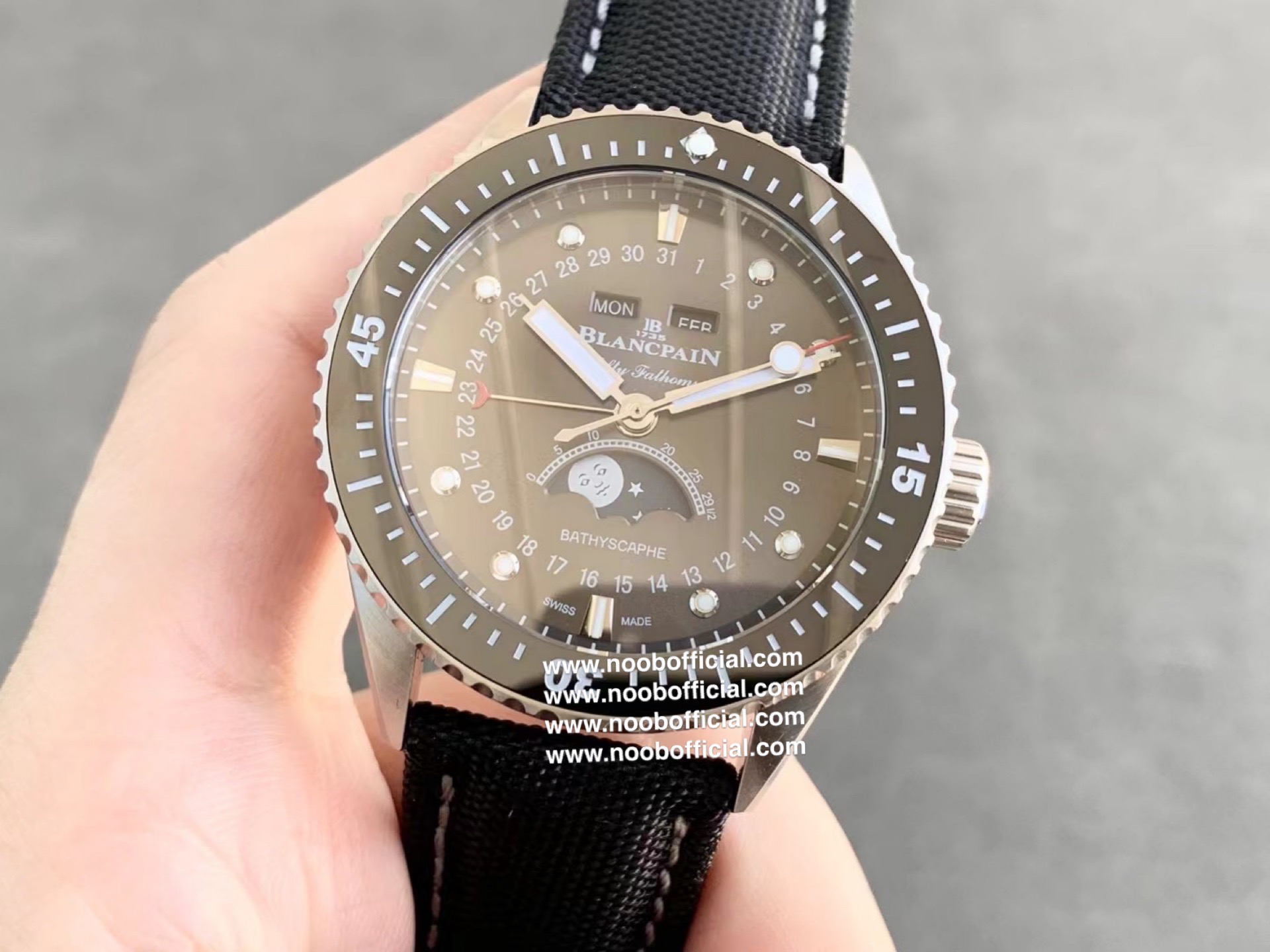 TW新力作 宝珀五十寻系列,5054-1110-B52A。压轴巨献,大三针夜光设计,直径43毫米!搭载6654.P自动机械机芯,具备星期显示,日期显示。月份显示,年份显示,月相显示