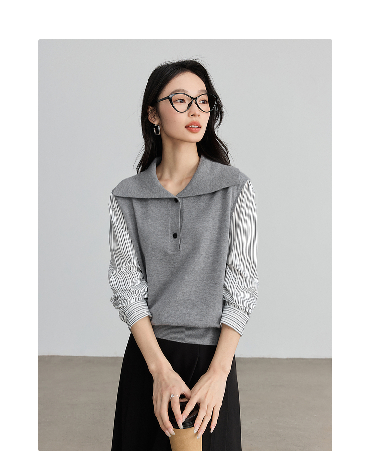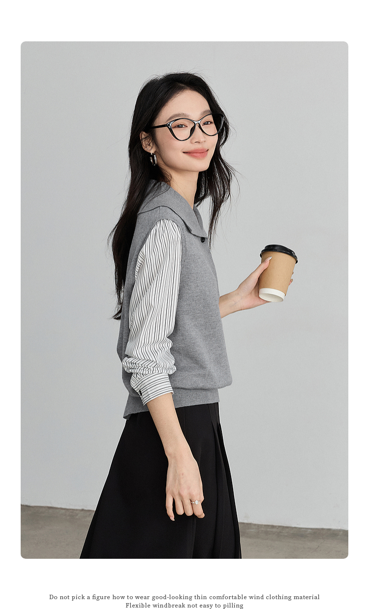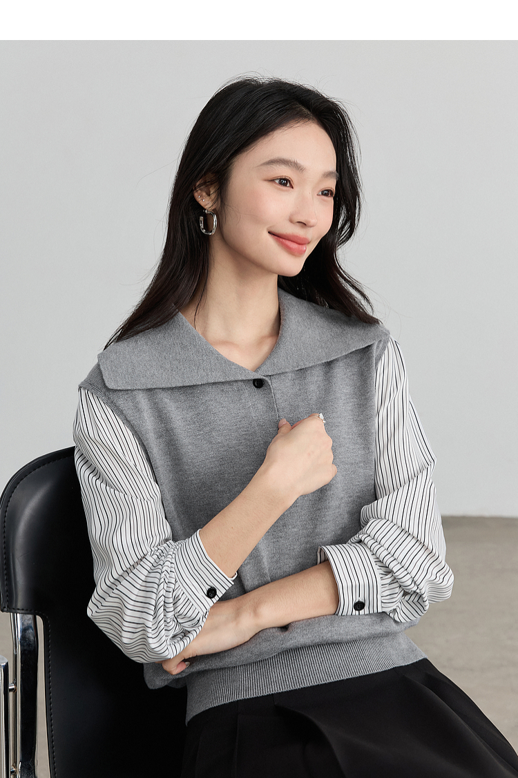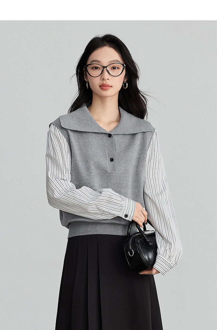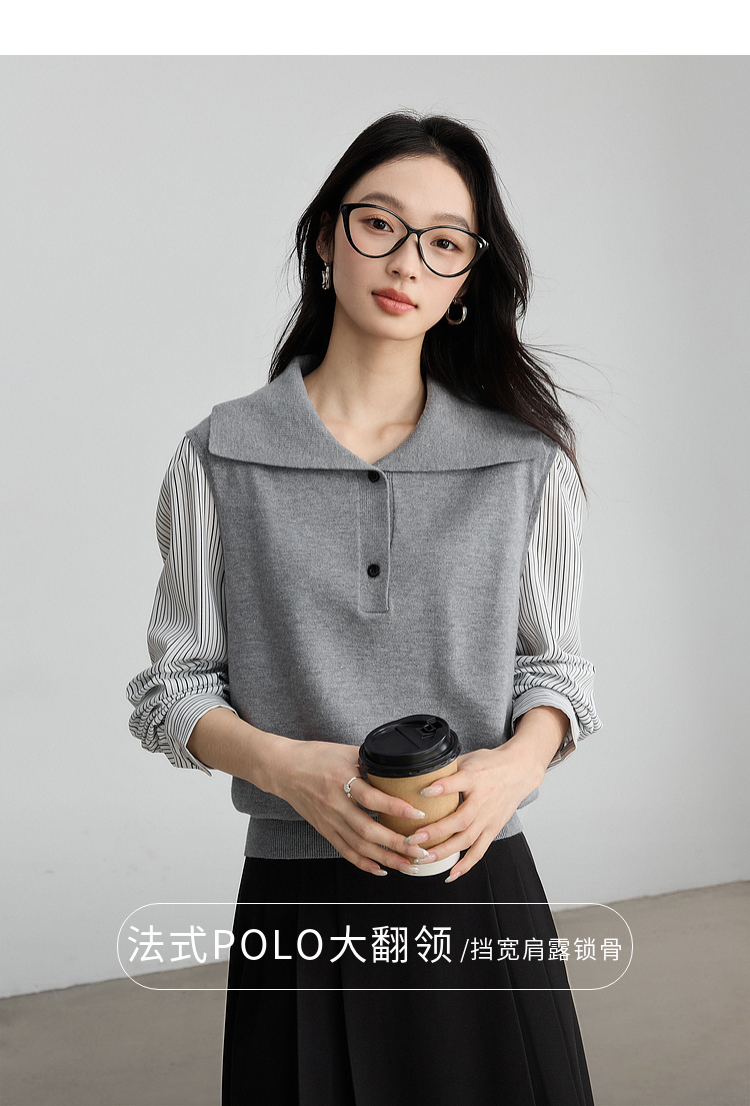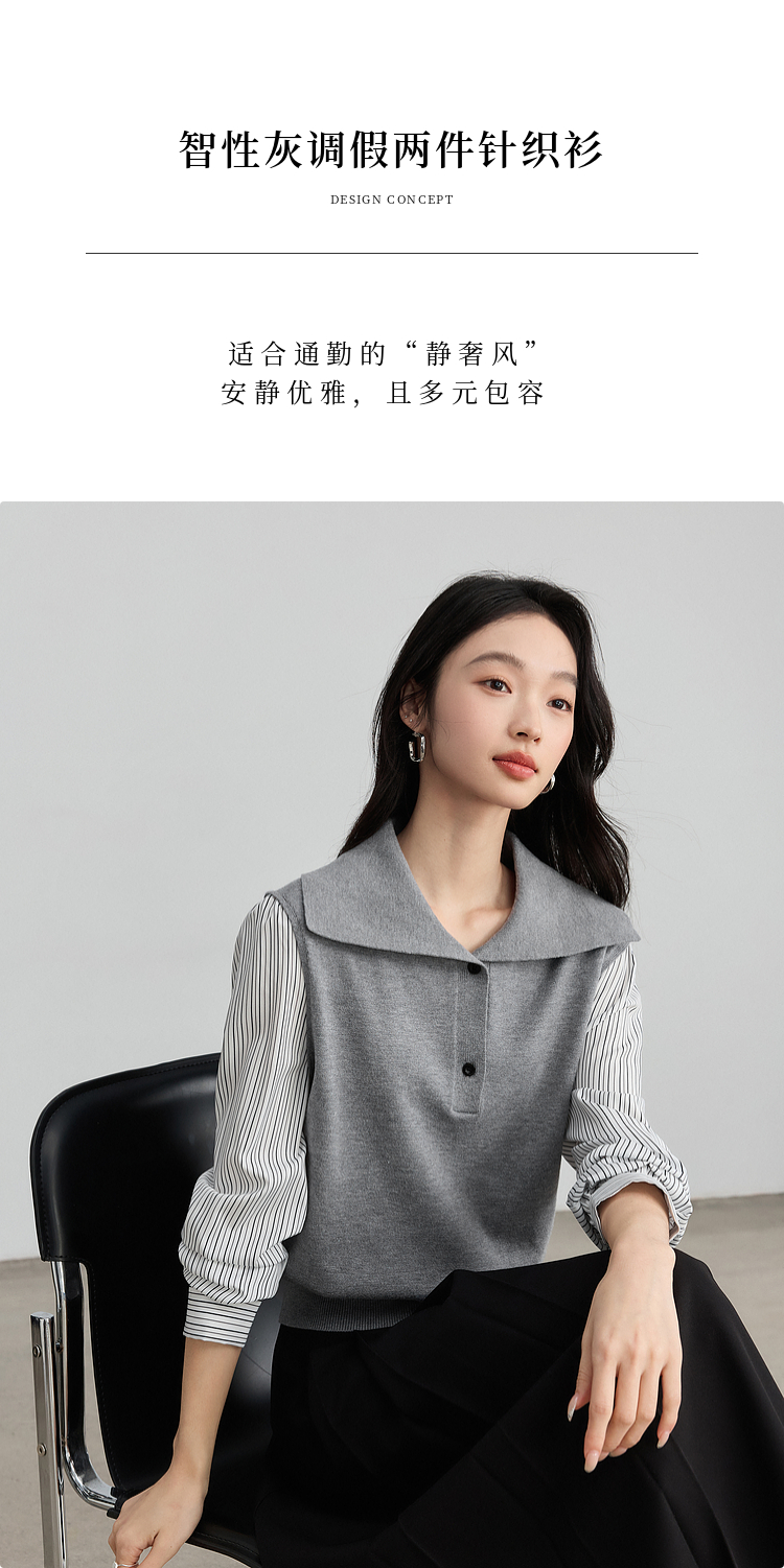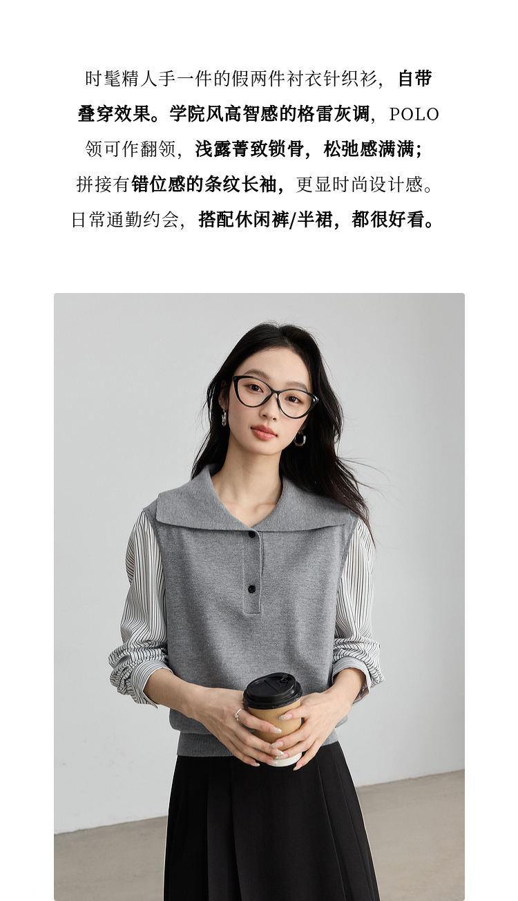 【1件75折】熙世界法式学院风假两件针织衫女2025春新款条纹长袖拼接翻领上衣