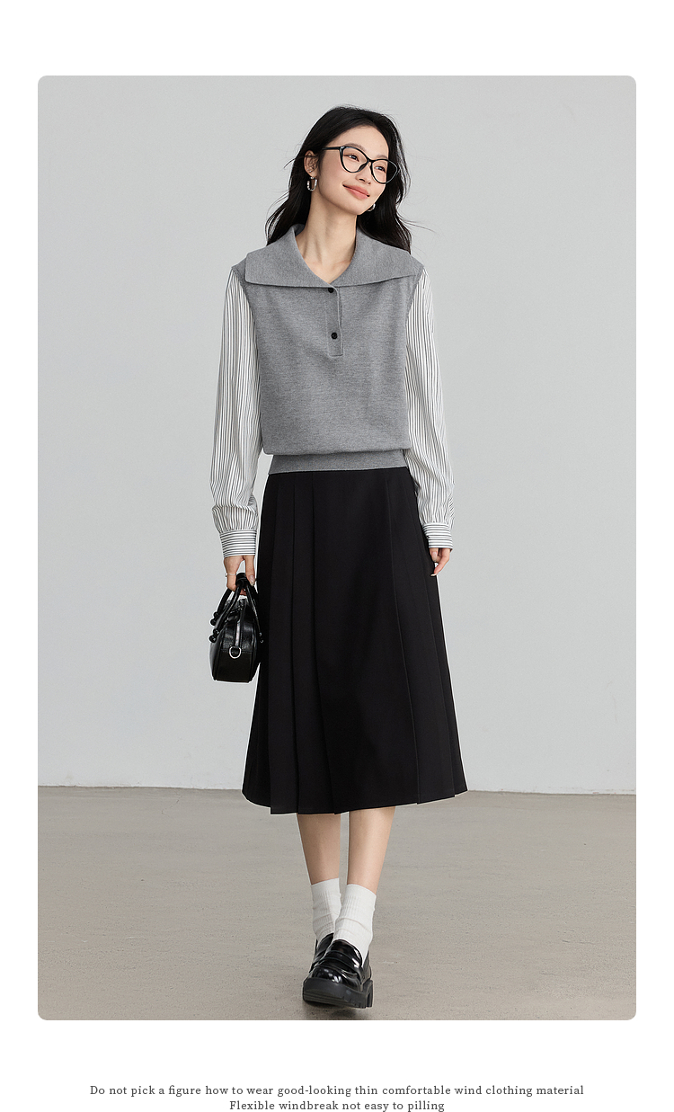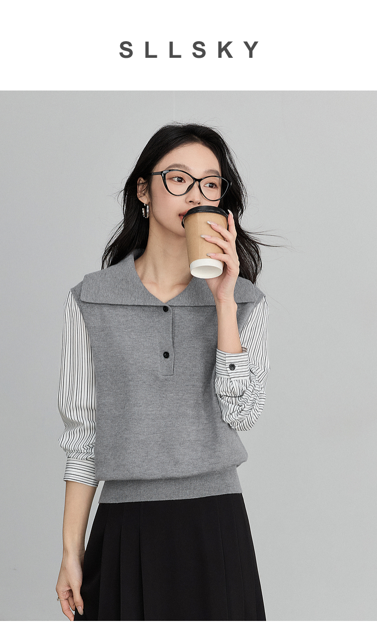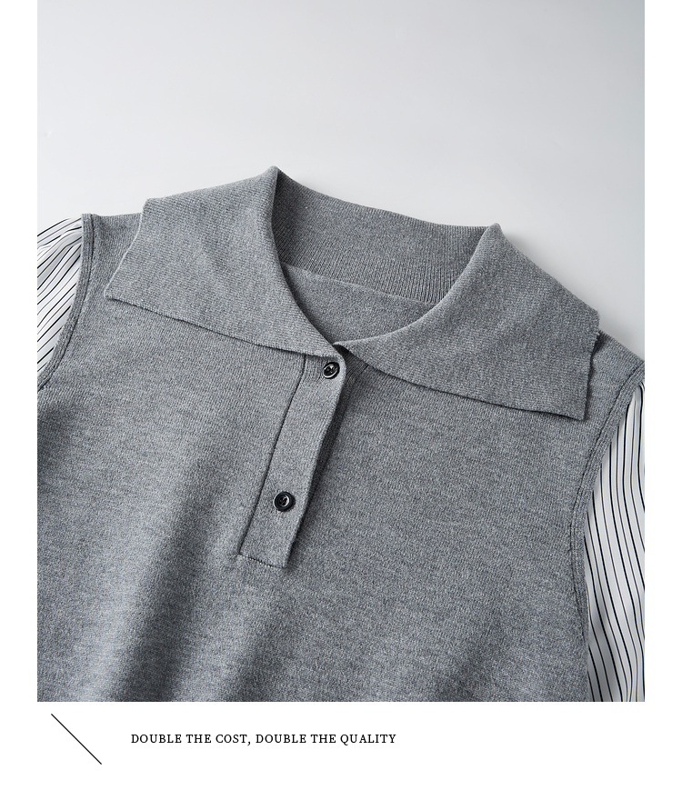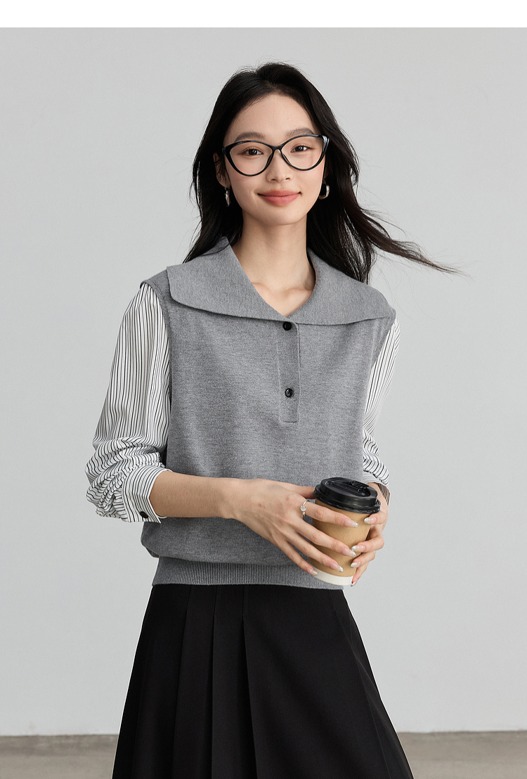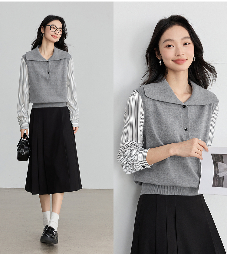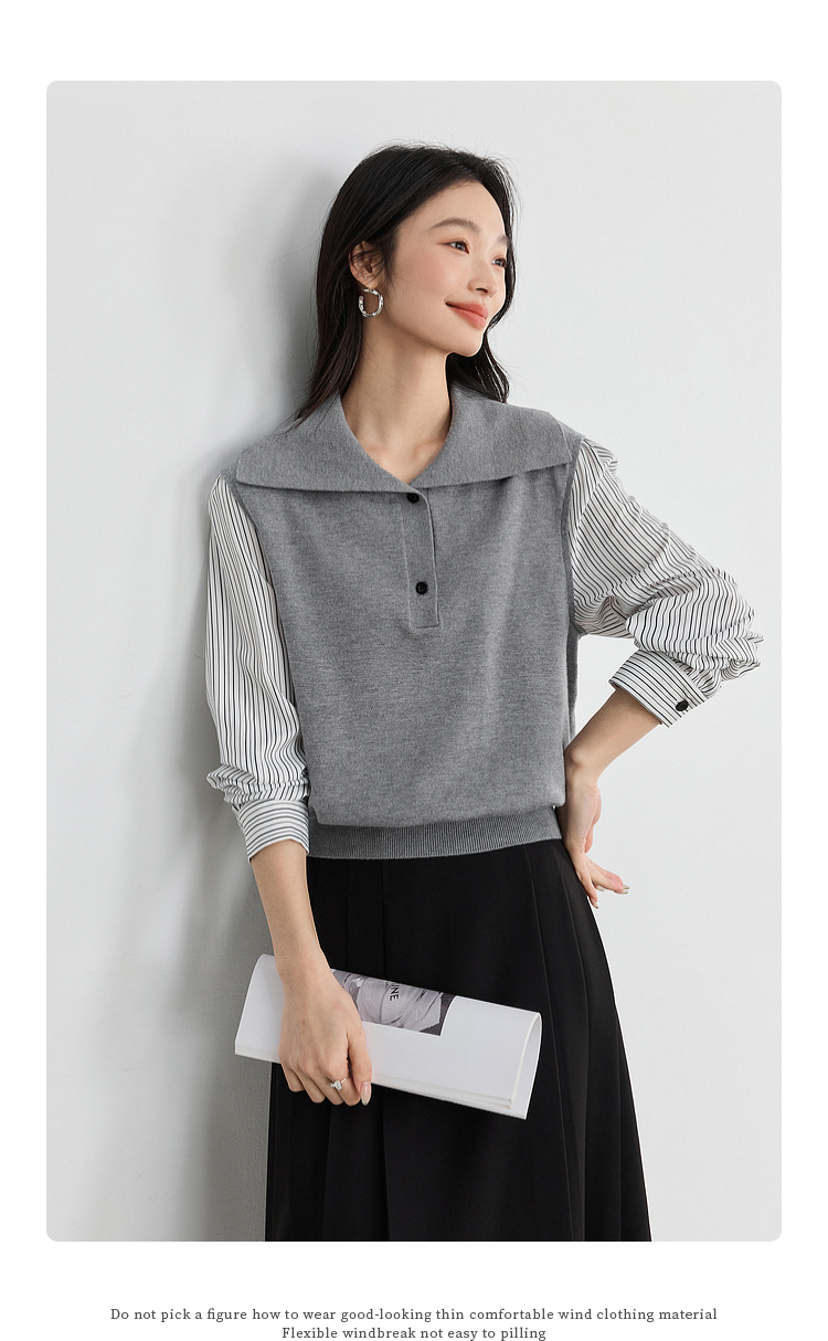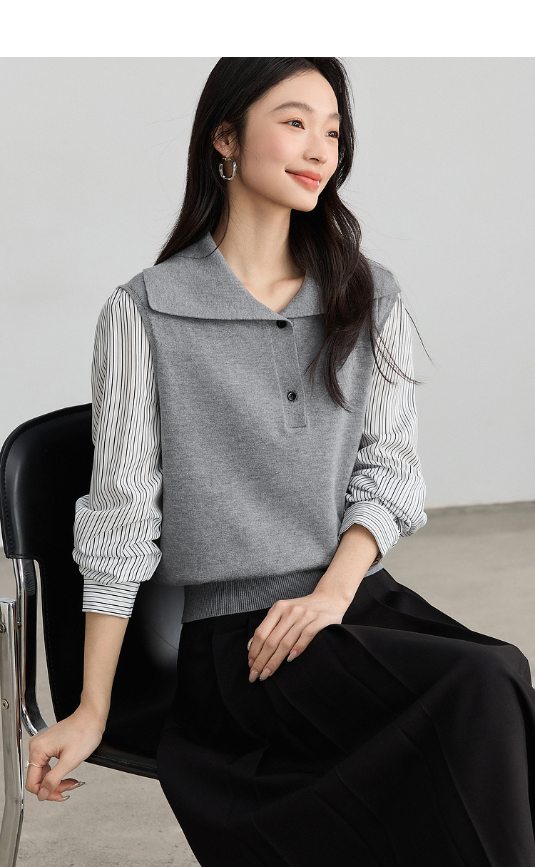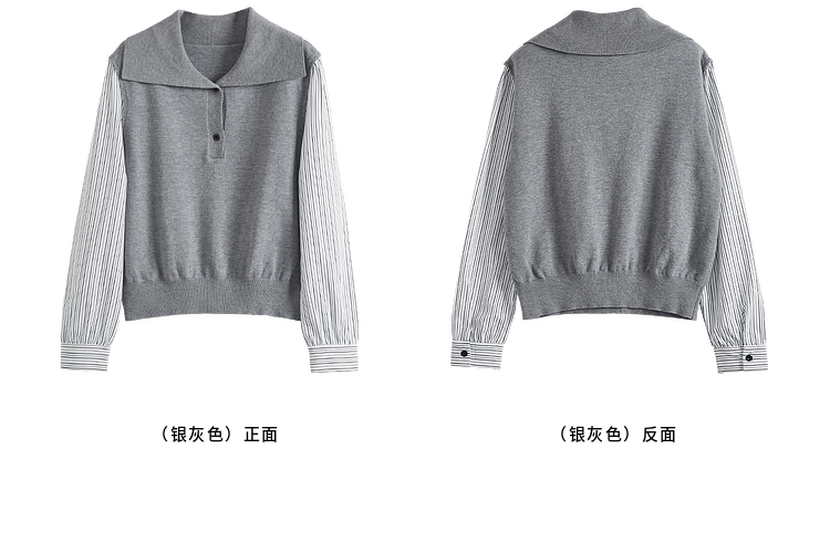 【1件75折】熙世界法式学院风假两件针织衫女2025春新款条纹长袖拼接翻领上衣