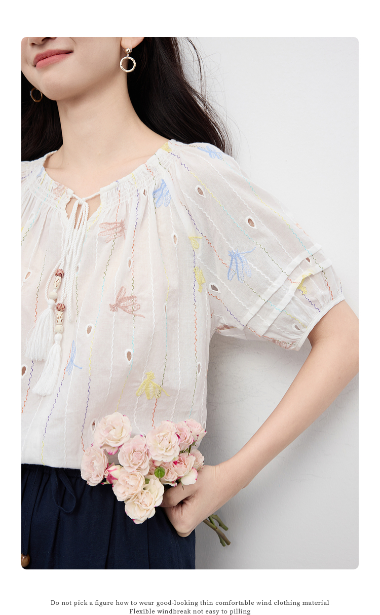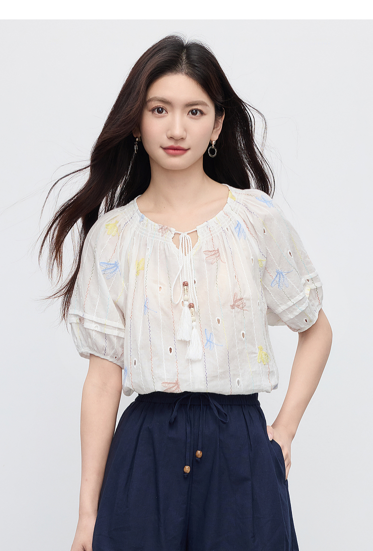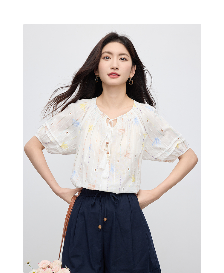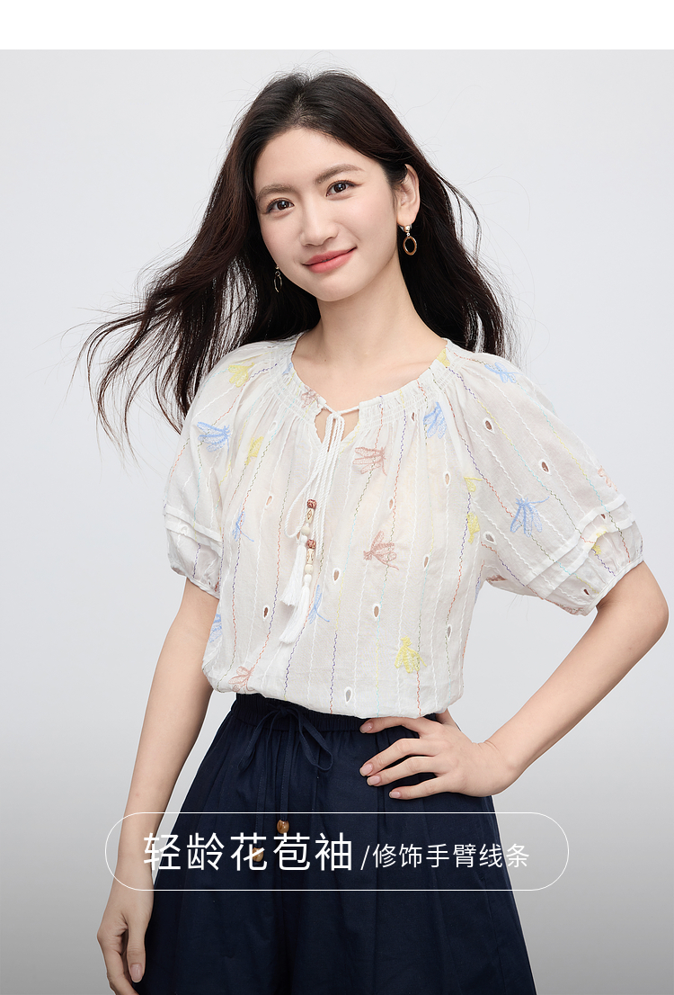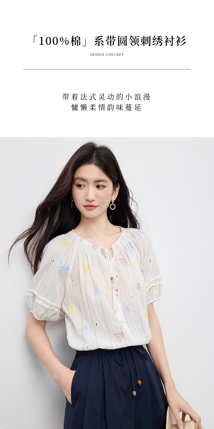 【夏日新品】熙世界泡泡袖刺绣衬衫女夏季新款法式系带圆领休闲100%棉宽松上衣
