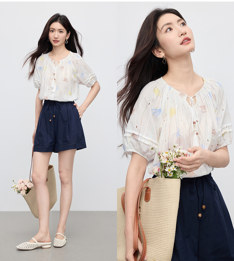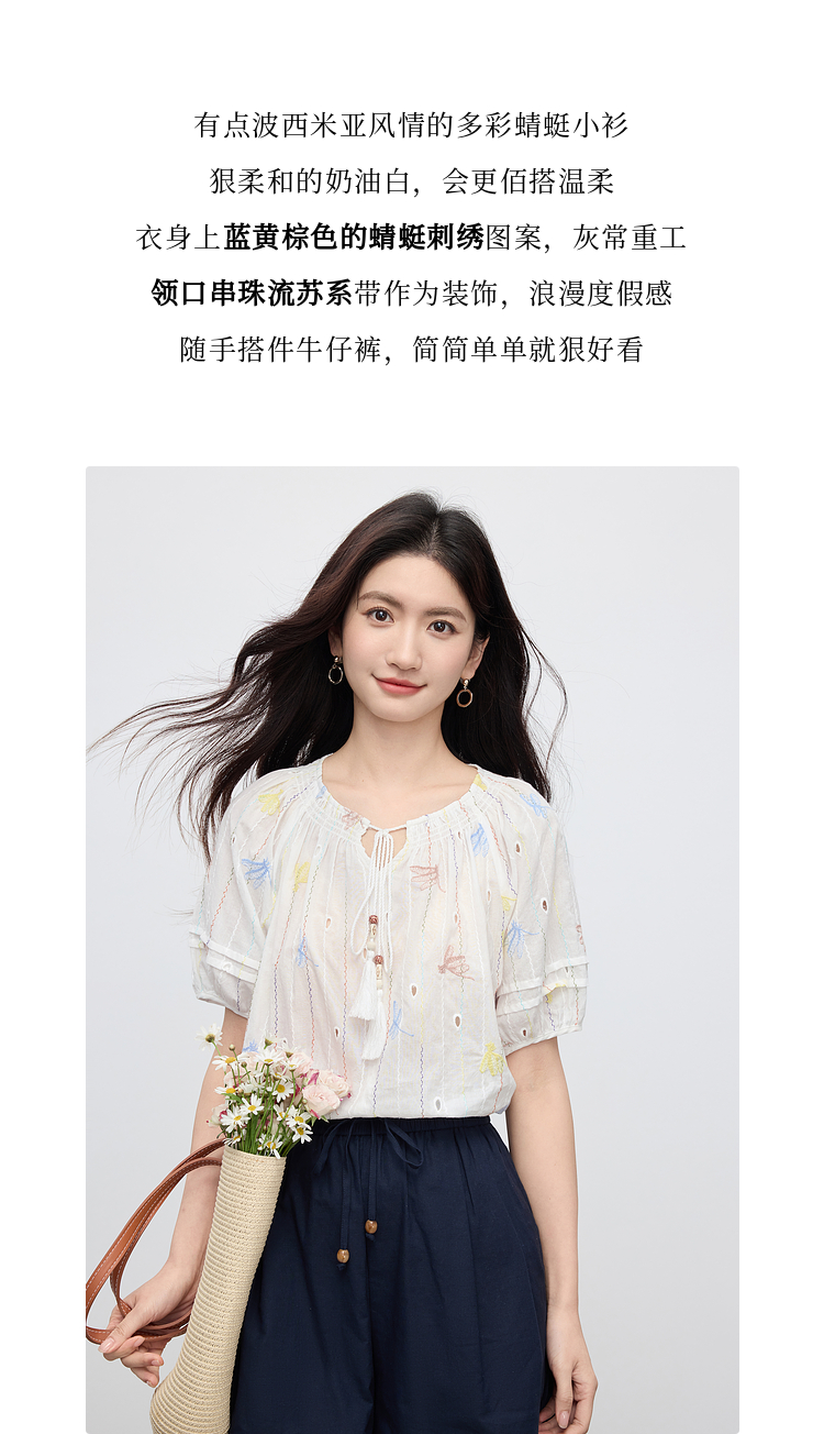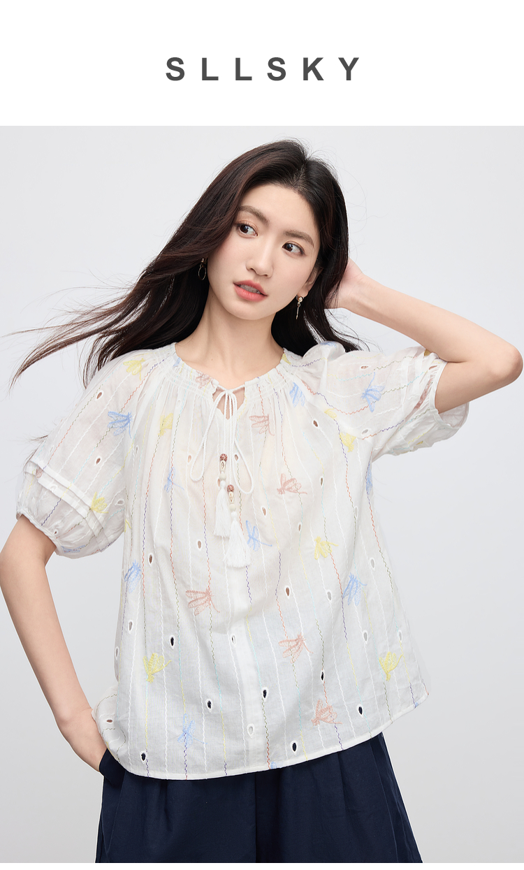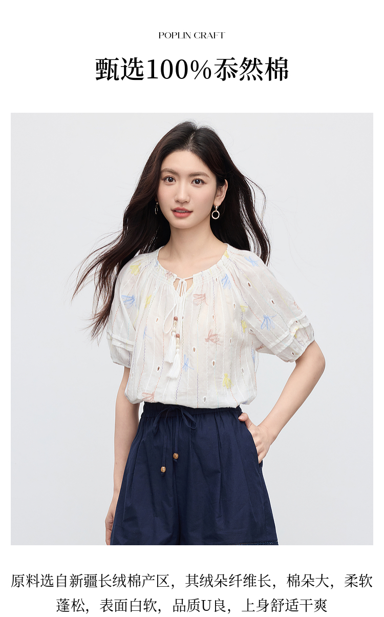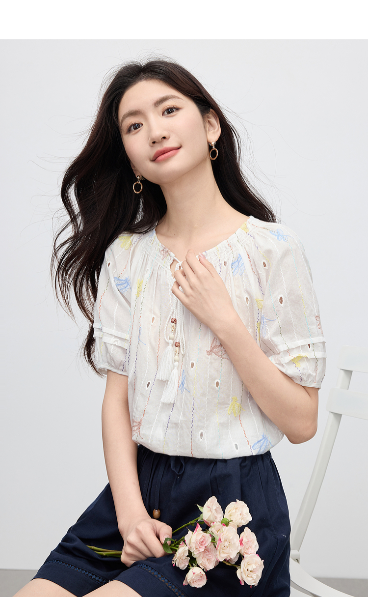 【夏日新品】熙世界泡泡袖刺绣衬衫女夏季新款法式系带圆领休闲100%棉宽松上衣