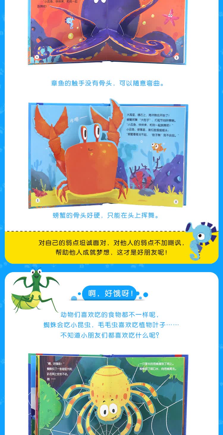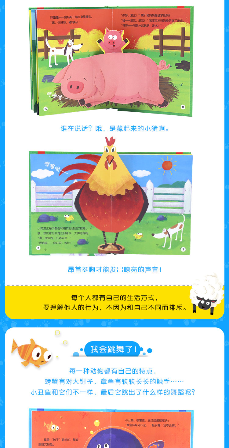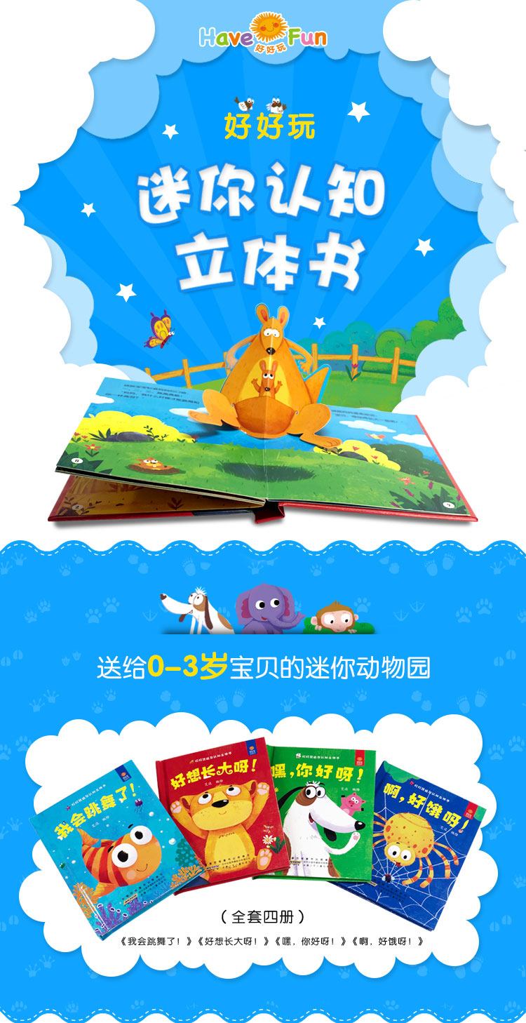 本套书共4册,适合0-3岁宝宝阅读。图书内页精心设计了立体纸艺,饱满的色彩搭配和有趣的动态纸艺如孩子的玩教具一样,让角色更生动,能激发宝宝的好奇心和探索欲。图书围绕日常礼仪、成长渴望、动物的食物、友谊互助这几个主题展开故事,用宝宝易理解的生动语言表述,是0-3岁宝宝成长必备的迷你玩具书系