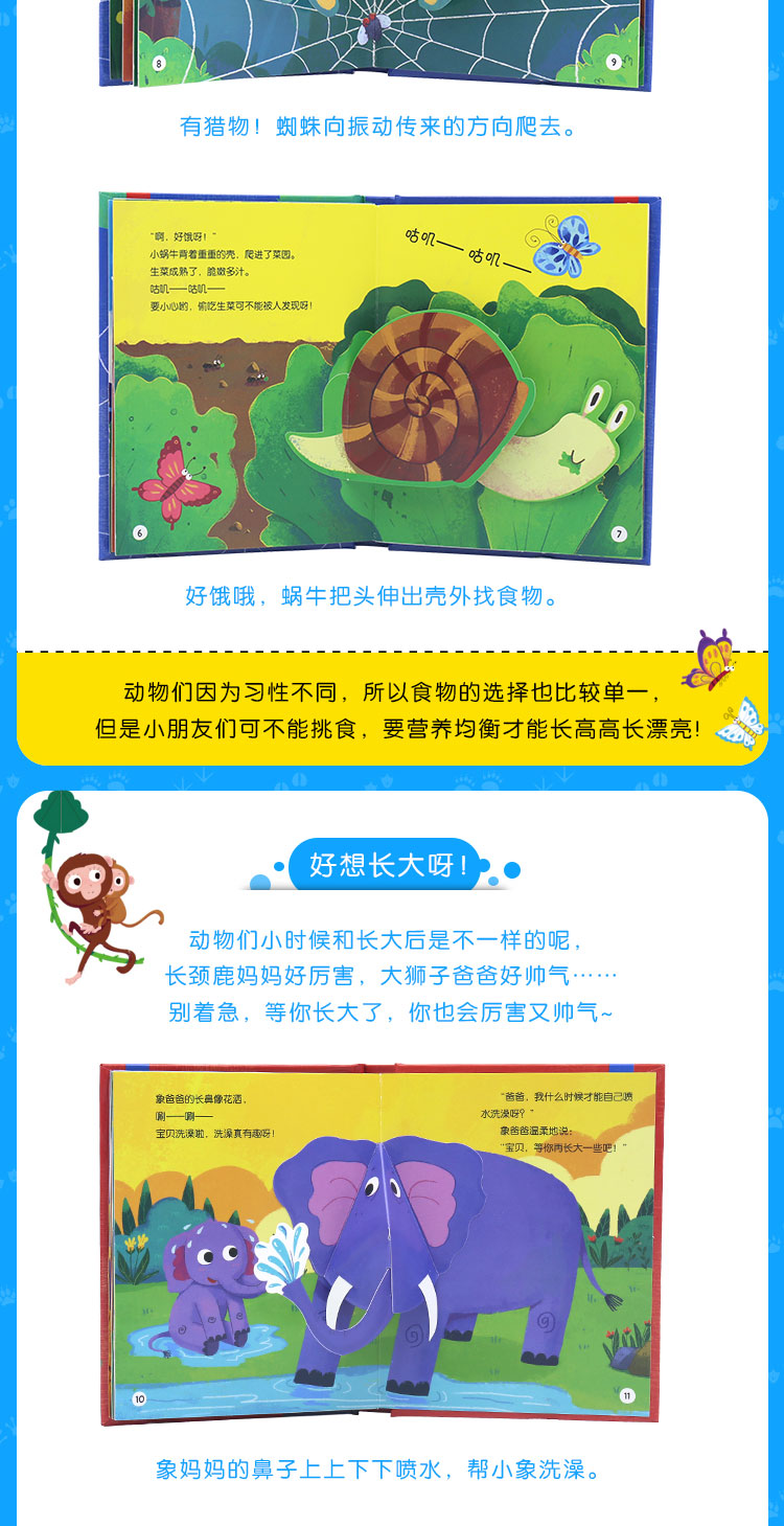 《好想长大呀!》的主题是成长渴望,内容讲述的是,森林里的动物宝宝正在和爸爸妈妈玩耍,小狮子为什么没有“大围巾”,小长颈鹿够不到高高的树叶……面对这些疑惑,动物爸妈总是有办法回答。