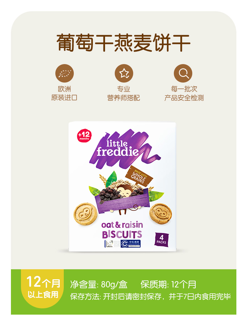 英国Little Freddie 小皮全谷物燕麦葡萄饼干80g/盒 宝宝婴幼儿零食磨牙 1岁+
