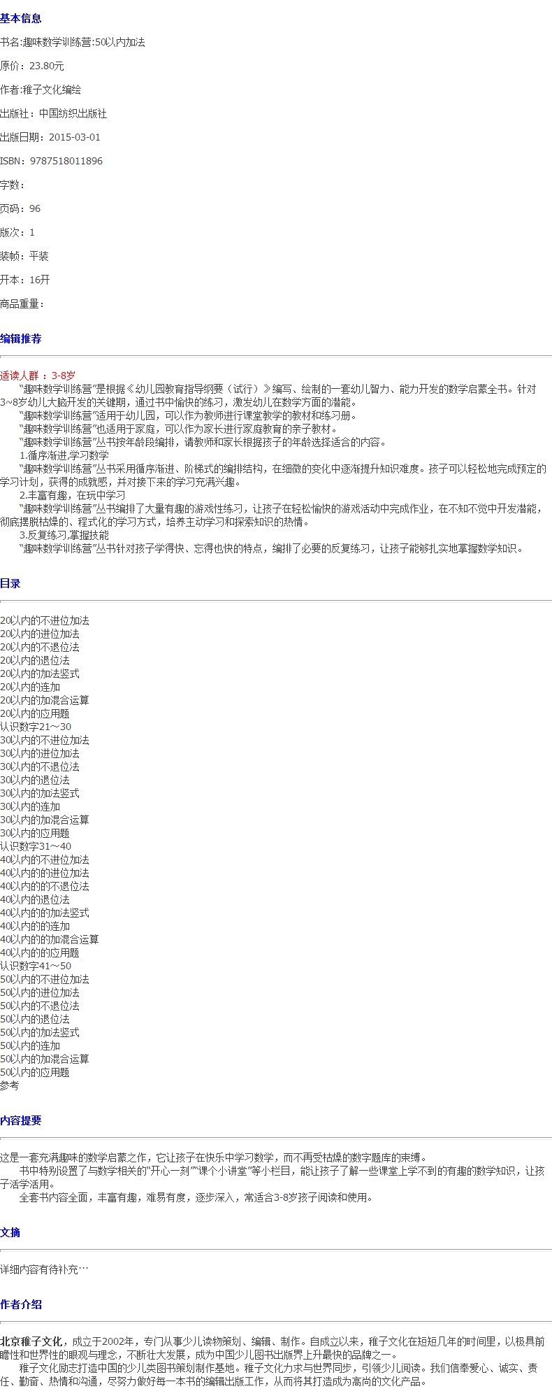 正版包邮.趣味数学训练营:50以内加减法|9787518011896|稚子文化编绘|中国纺织出版社|定价23.80元