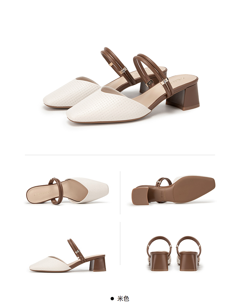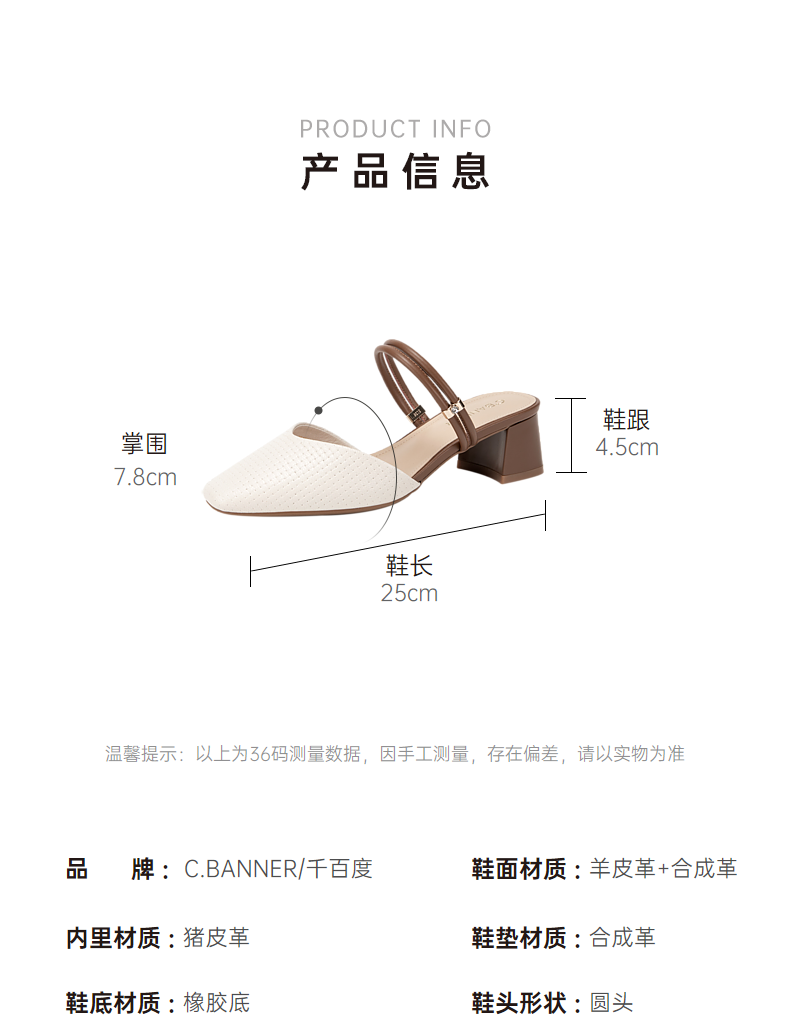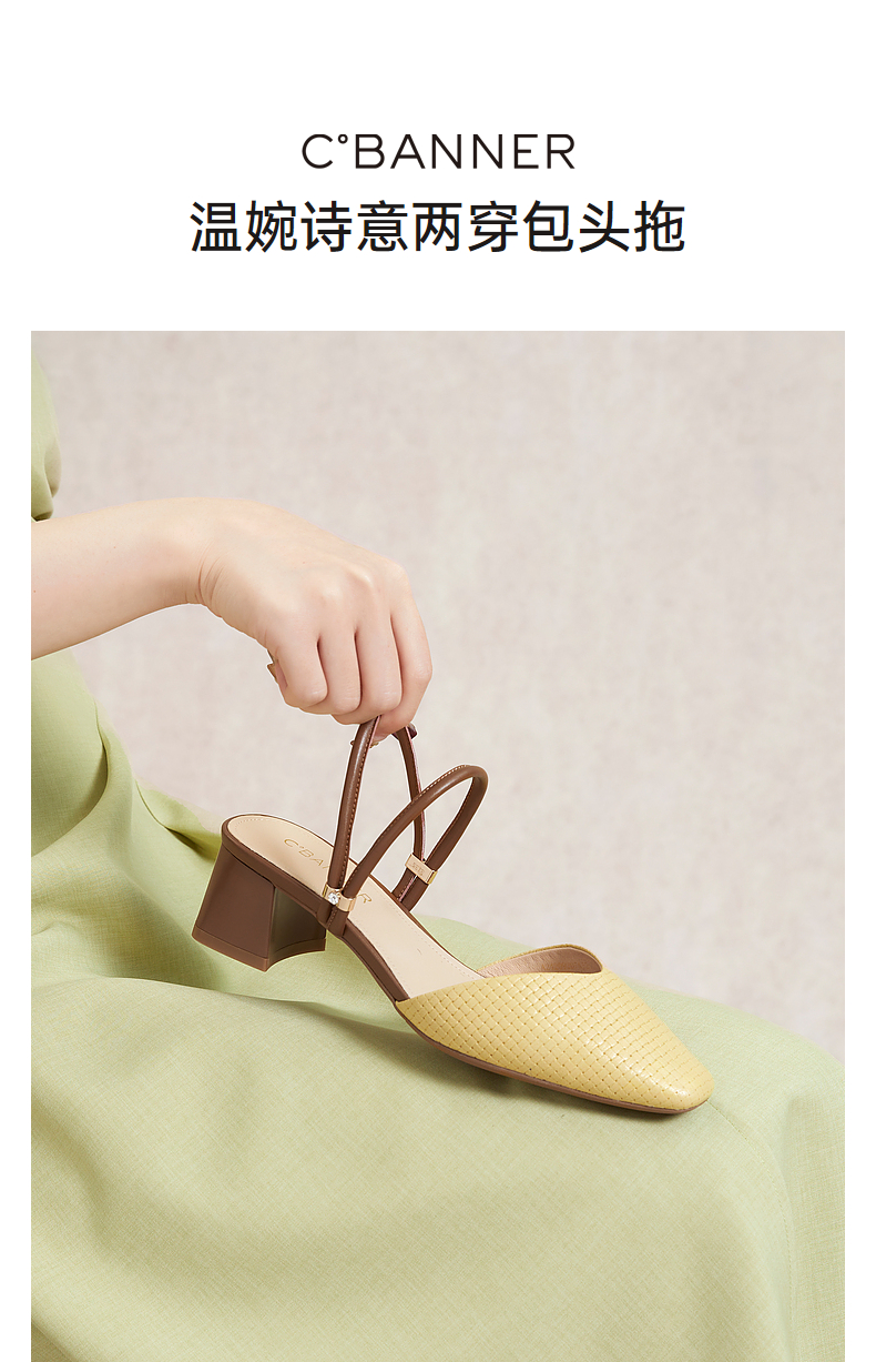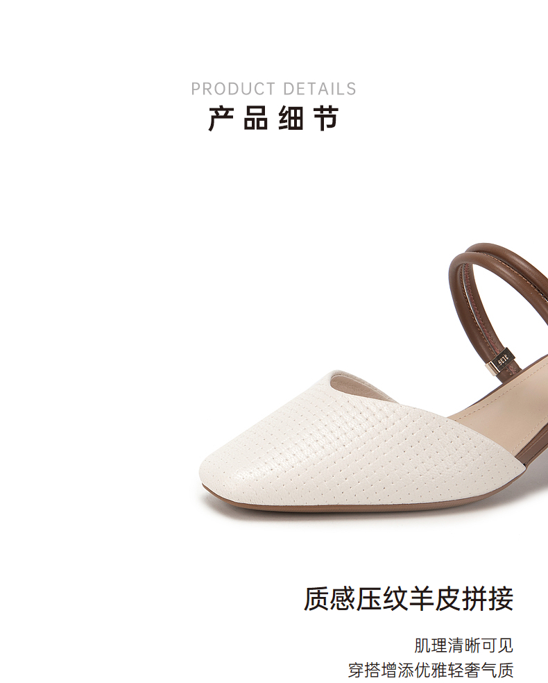 千百度羊皮时尚包头拖女款夏季粗跟尖头通勤凉拖鞋外穿A24209207