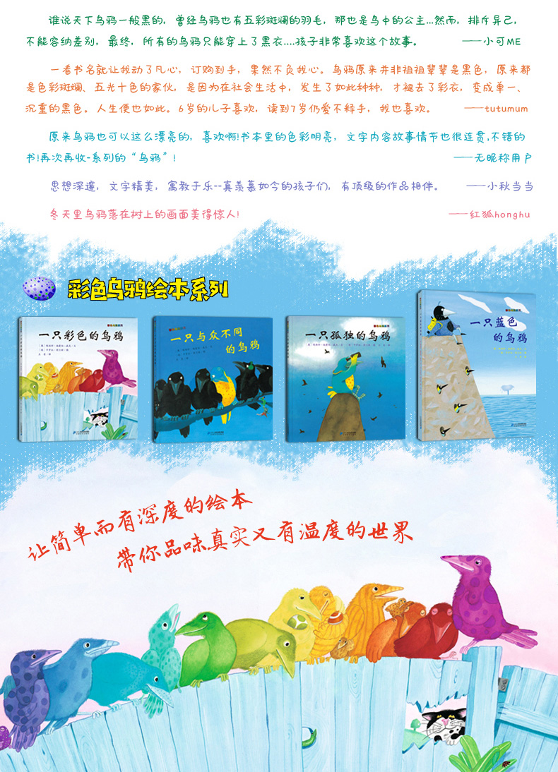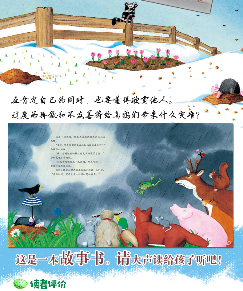 乌鸦曾经有五彩缤纷的羽毛,天下的乌鸦都很好看。不过,他们为了争论谁的颜色最好看,排斥异己,拉帮结派,以至相互厮杀。终于,一场黑雨平息了所有的争吵,上天把乌鸦全部变成了黑色----没有了差别就没有了冲突。