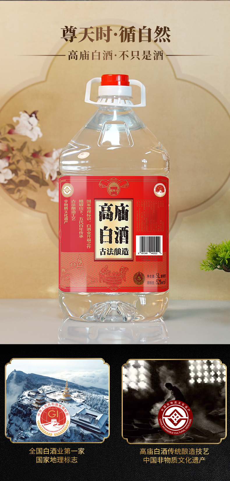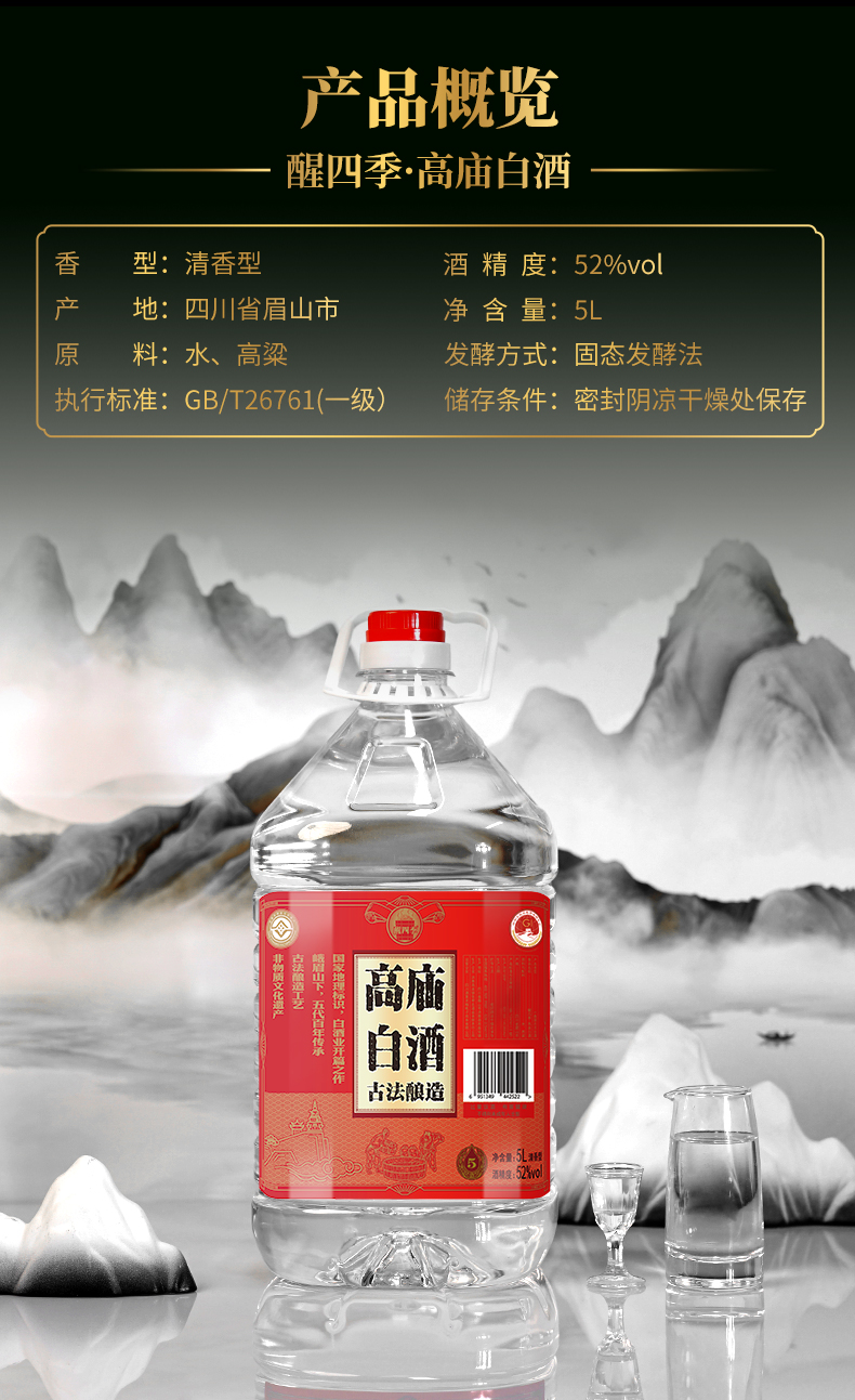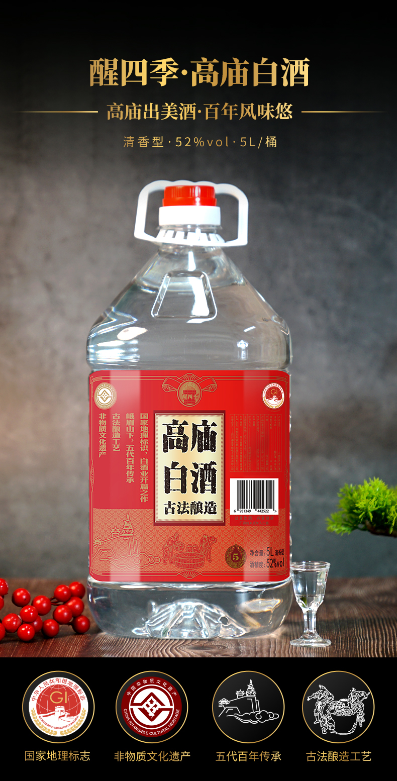 醒四季高庙白酒52度5L*1桶