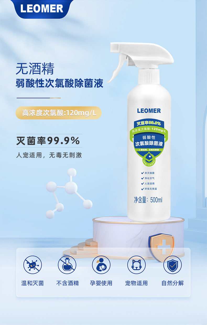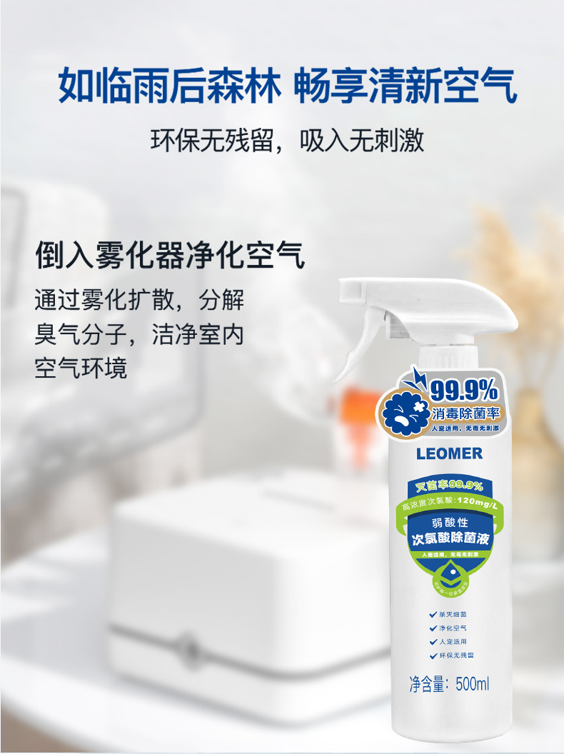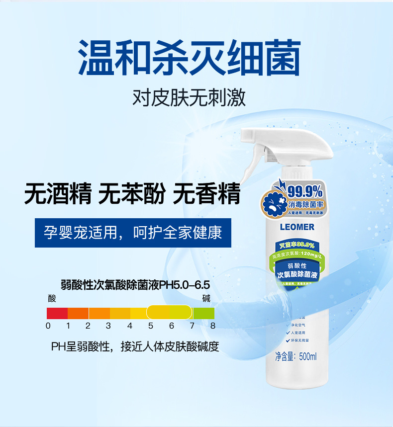 弱酸性次氯酸除菌液与传统的化学消毒、杀菌剂很大的不同,其含有的活性成分性质不稳定,与光、空气以及有机物等接触后,有效成分会逐渐分解,杀菌后氧化还原电位迅速下降,很快分解并还原为普通水,排放对环境没有任何污染,与传统化学消毒剂相比,具有安全、无残留、无污染的特点。