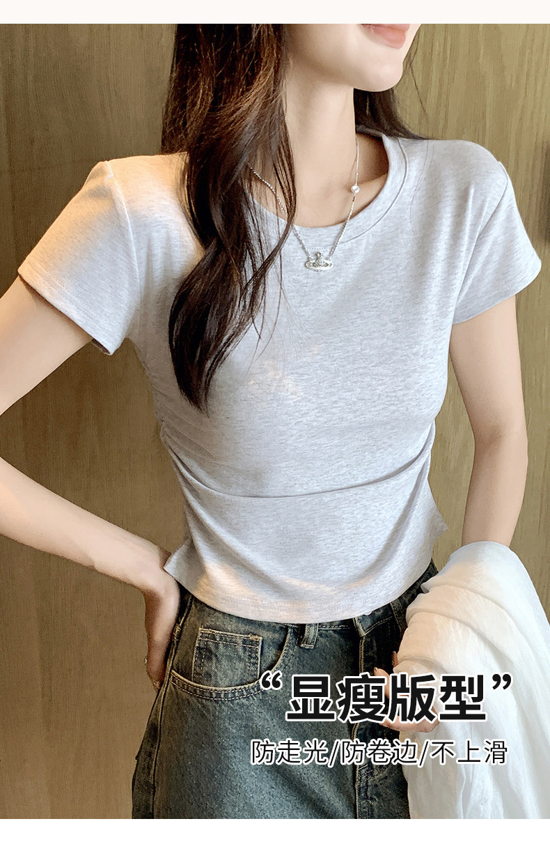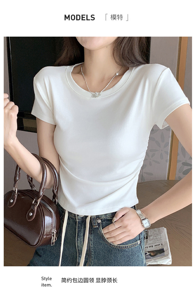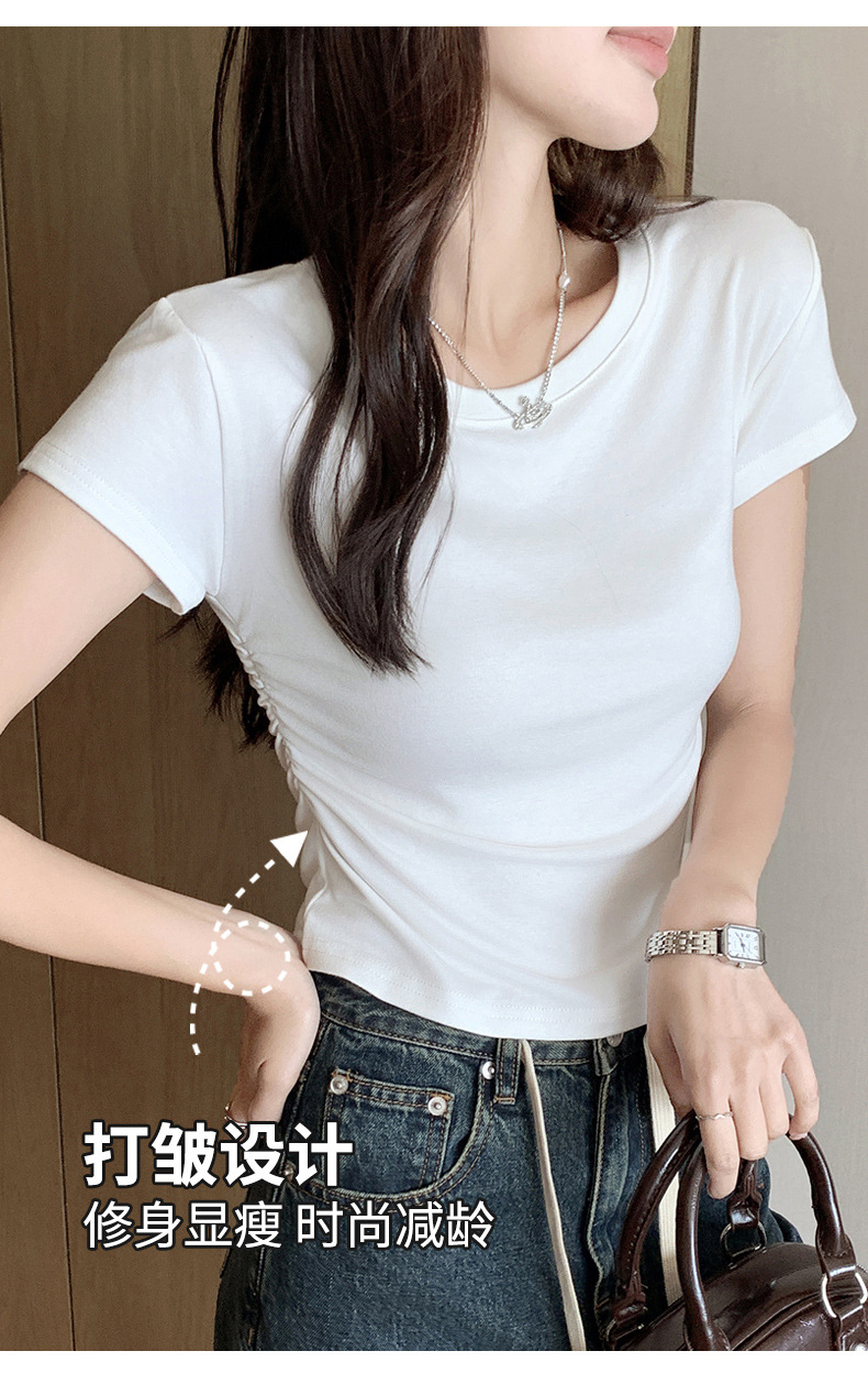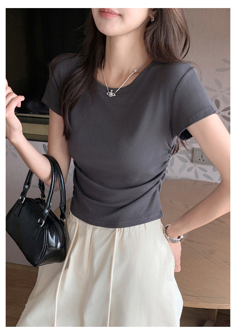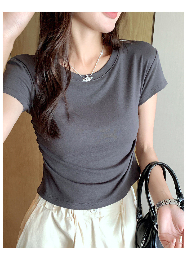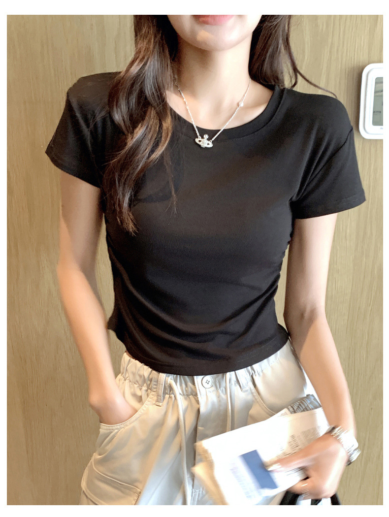H239圆领短袖T恤女夏季外穿修身显瘦打皱设计辣妹打底衫上衣