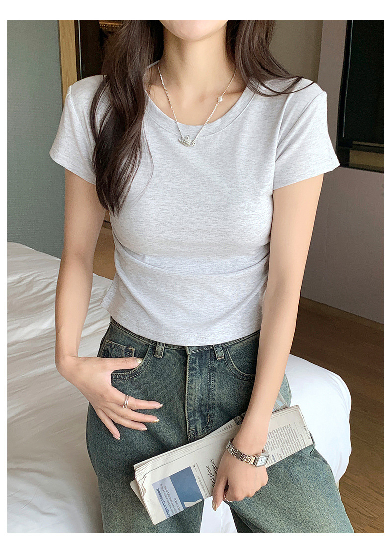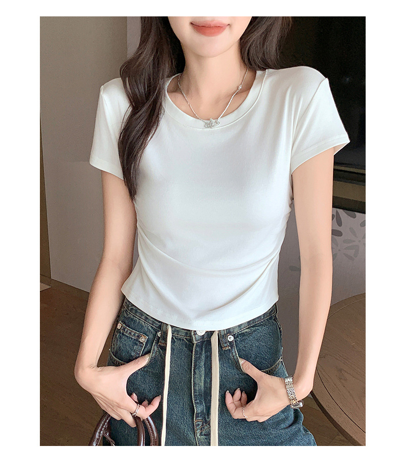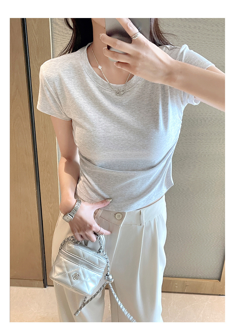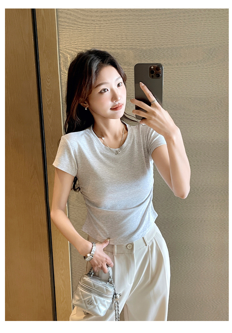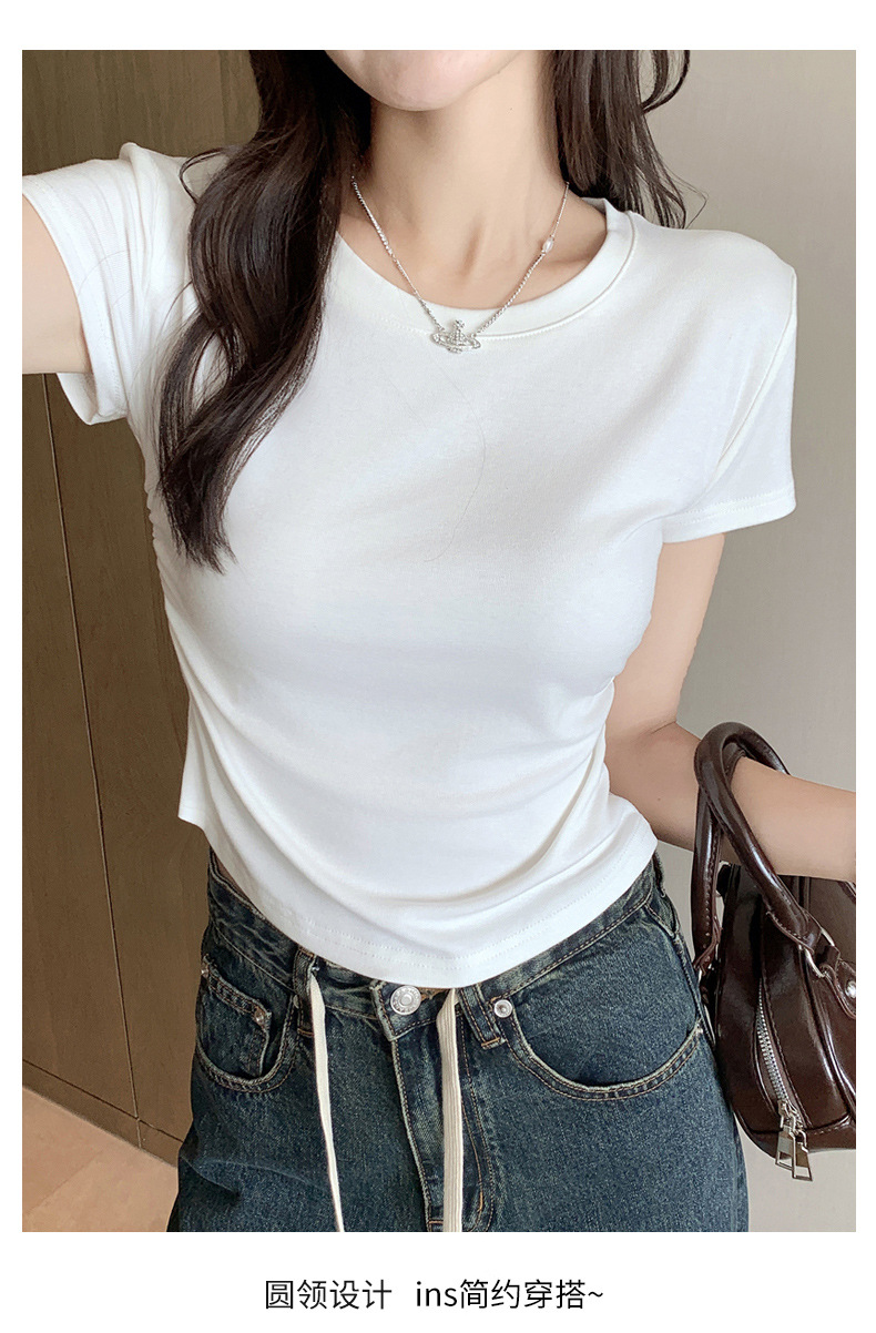 H239圆领短袖T恤女夏季外穿修身显瘦打皱设计辣妹打底衫上衣