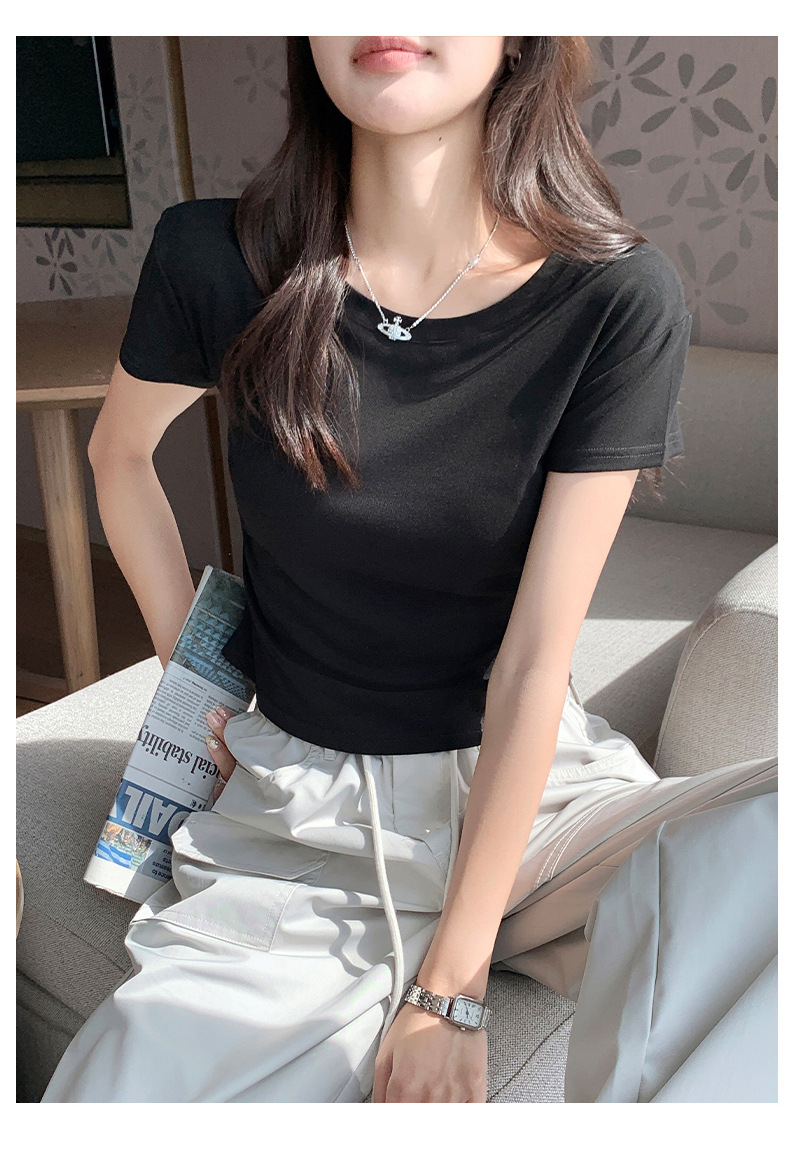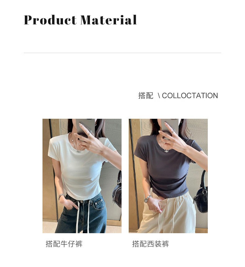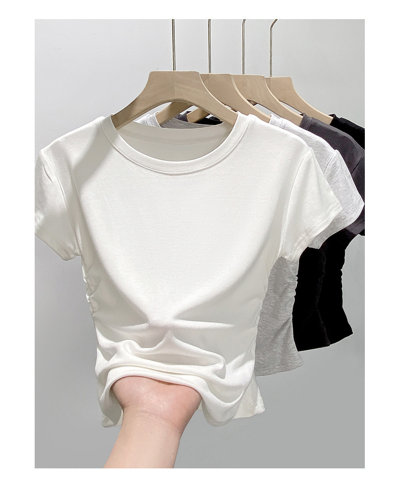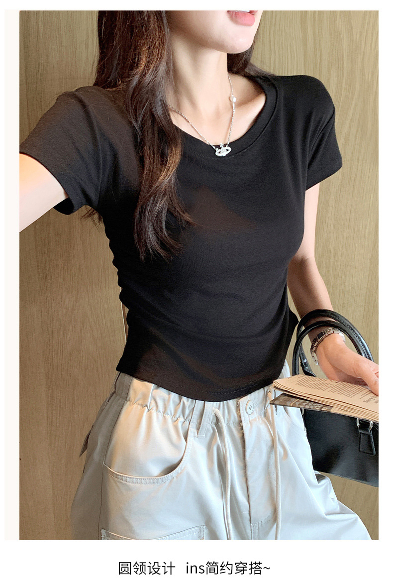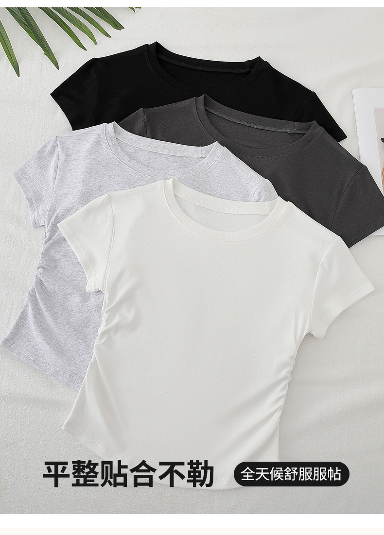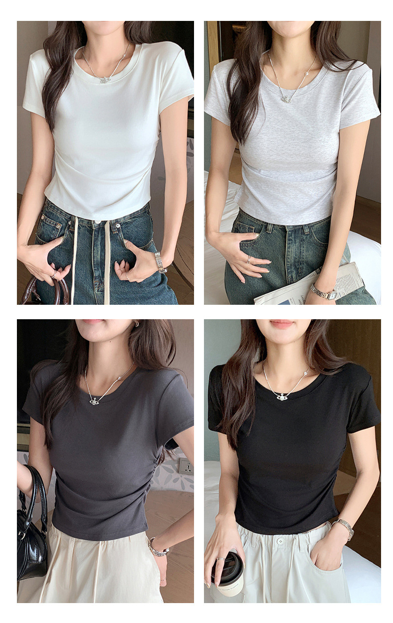 H239圆领短袖T恤女夏季外穿修身显瘦打皱设计辣妹打底衫上衣