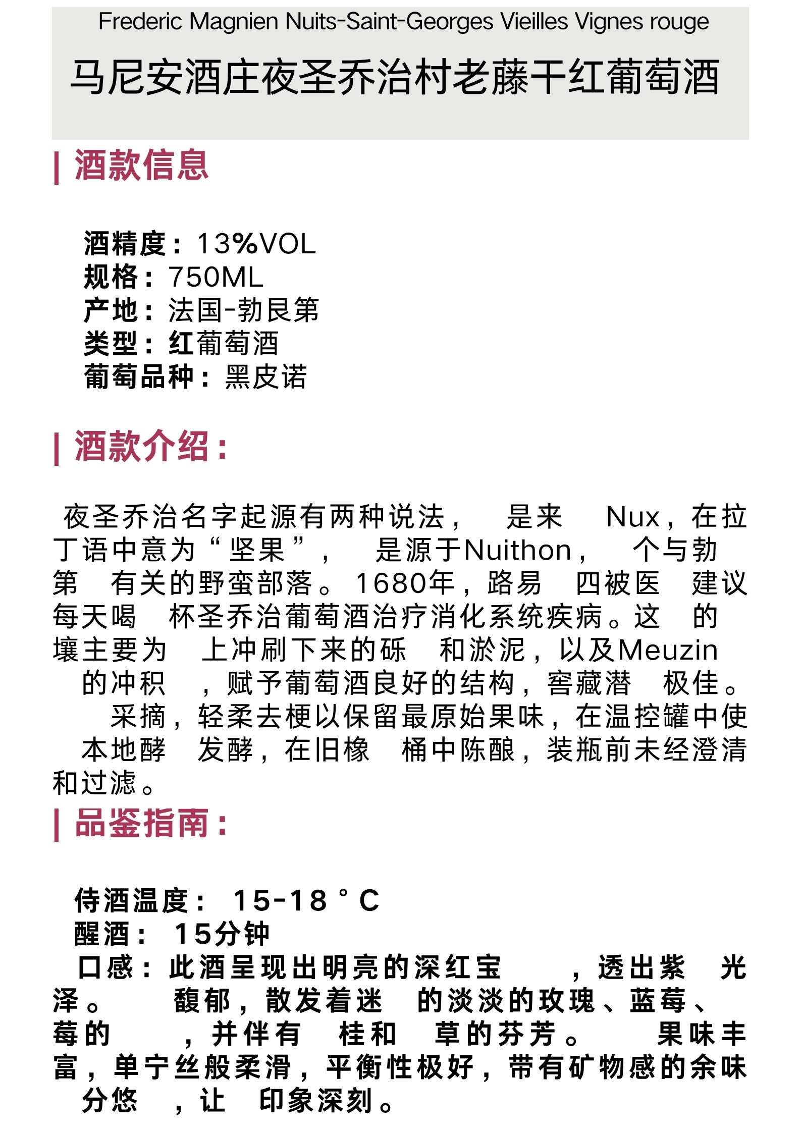 马尼安酒庄夜圣乔治村老藤干红葡萄酒 Frederic Magnien Nuits-Saint-Georges Vieilles Vignes rouge