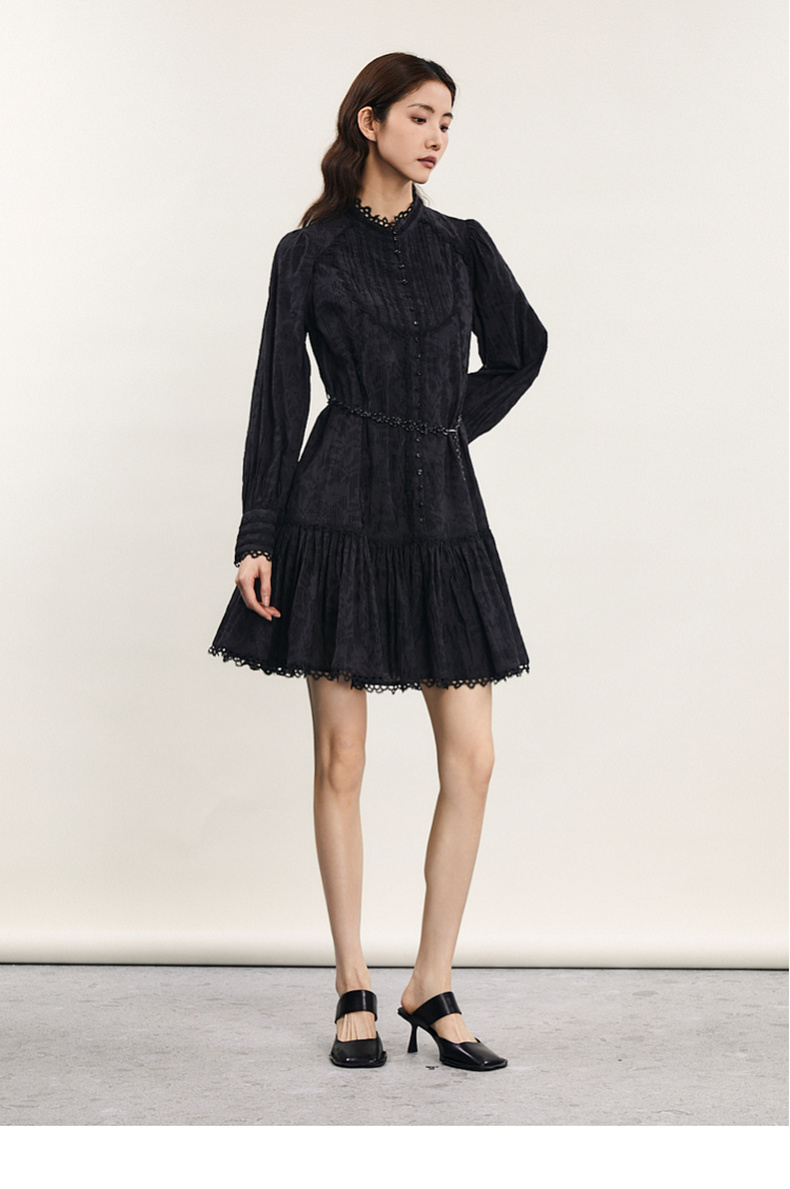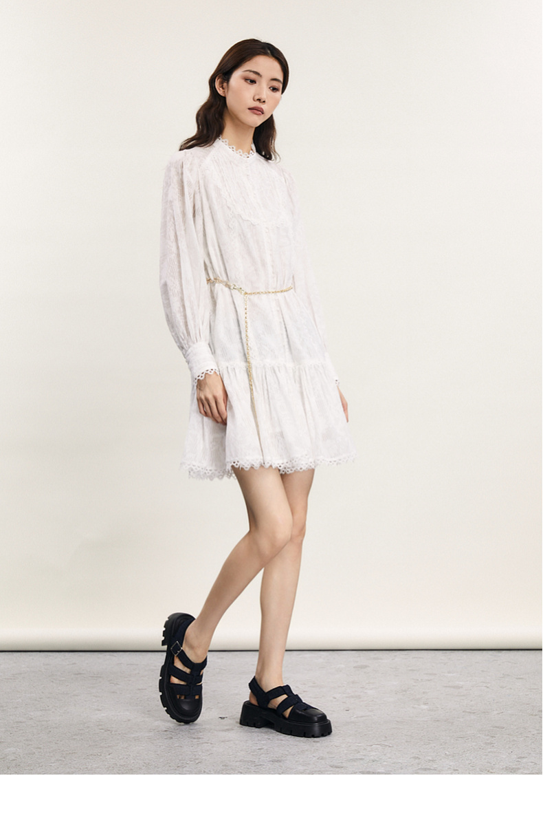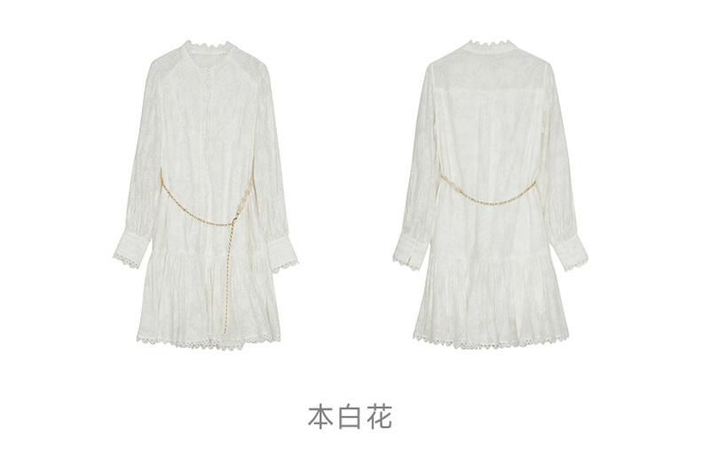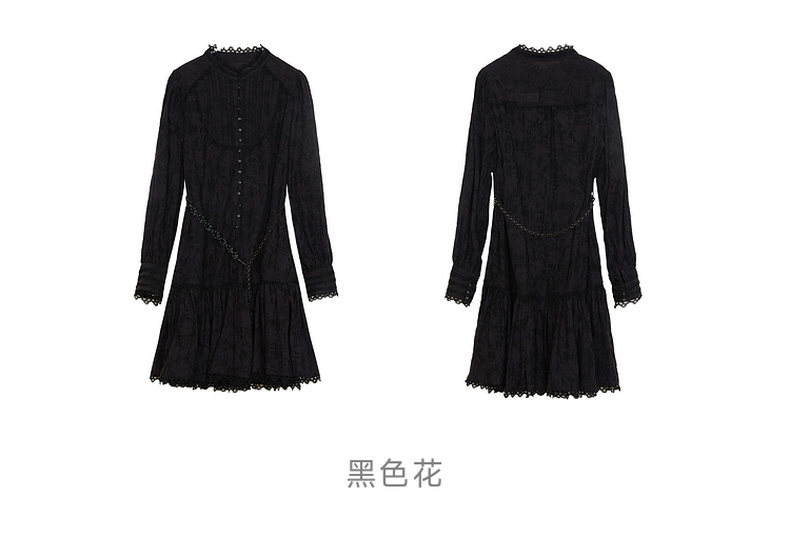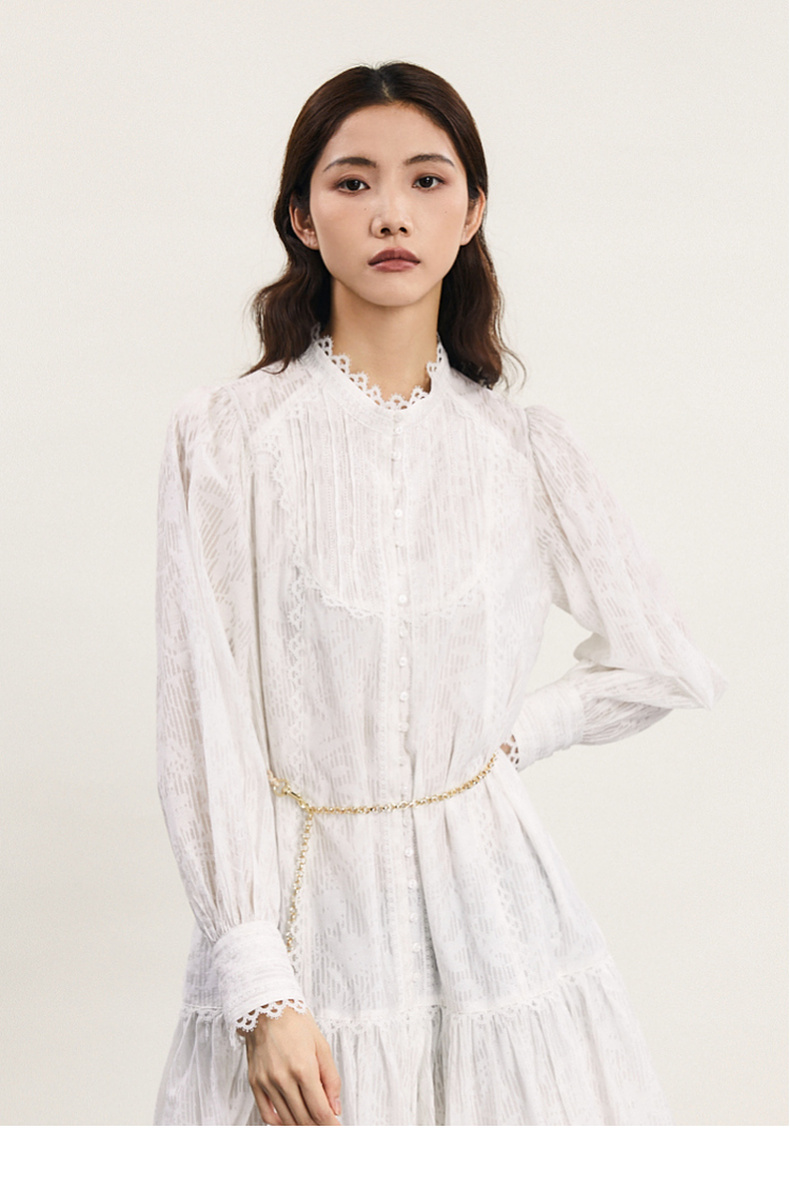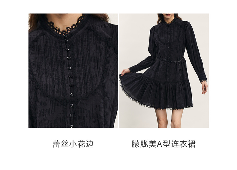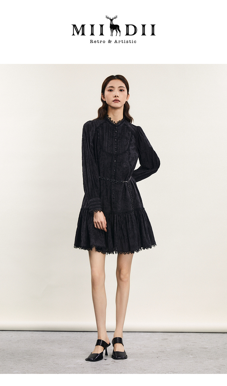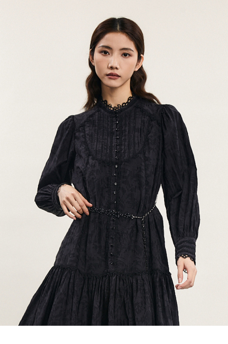 谜底连衣裙长袖2024春季新款复古文艺花边领提花中长裙241ML0144