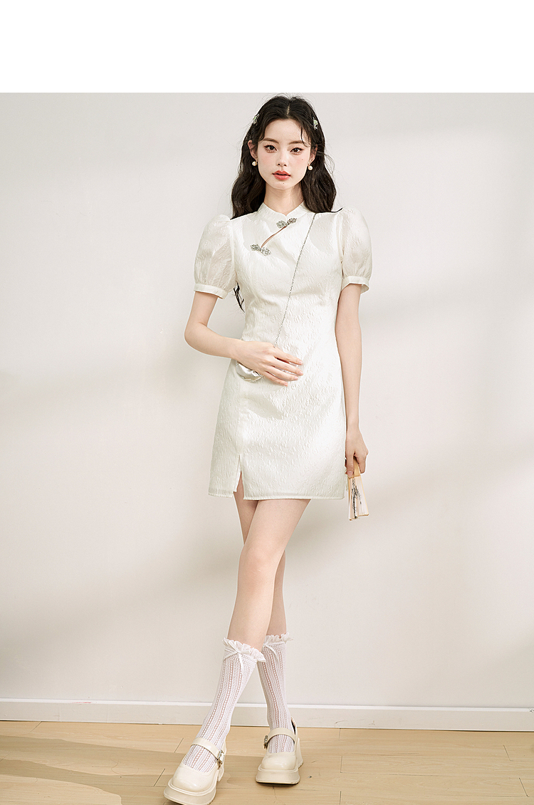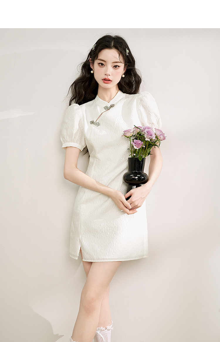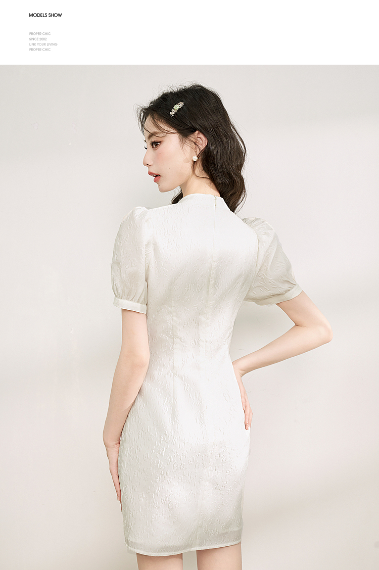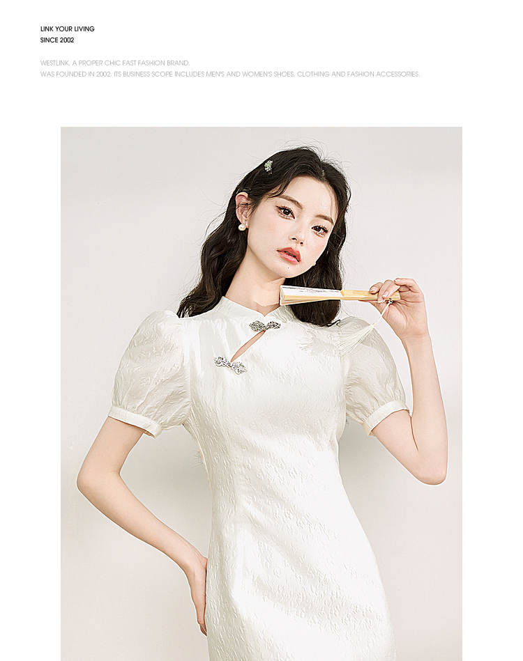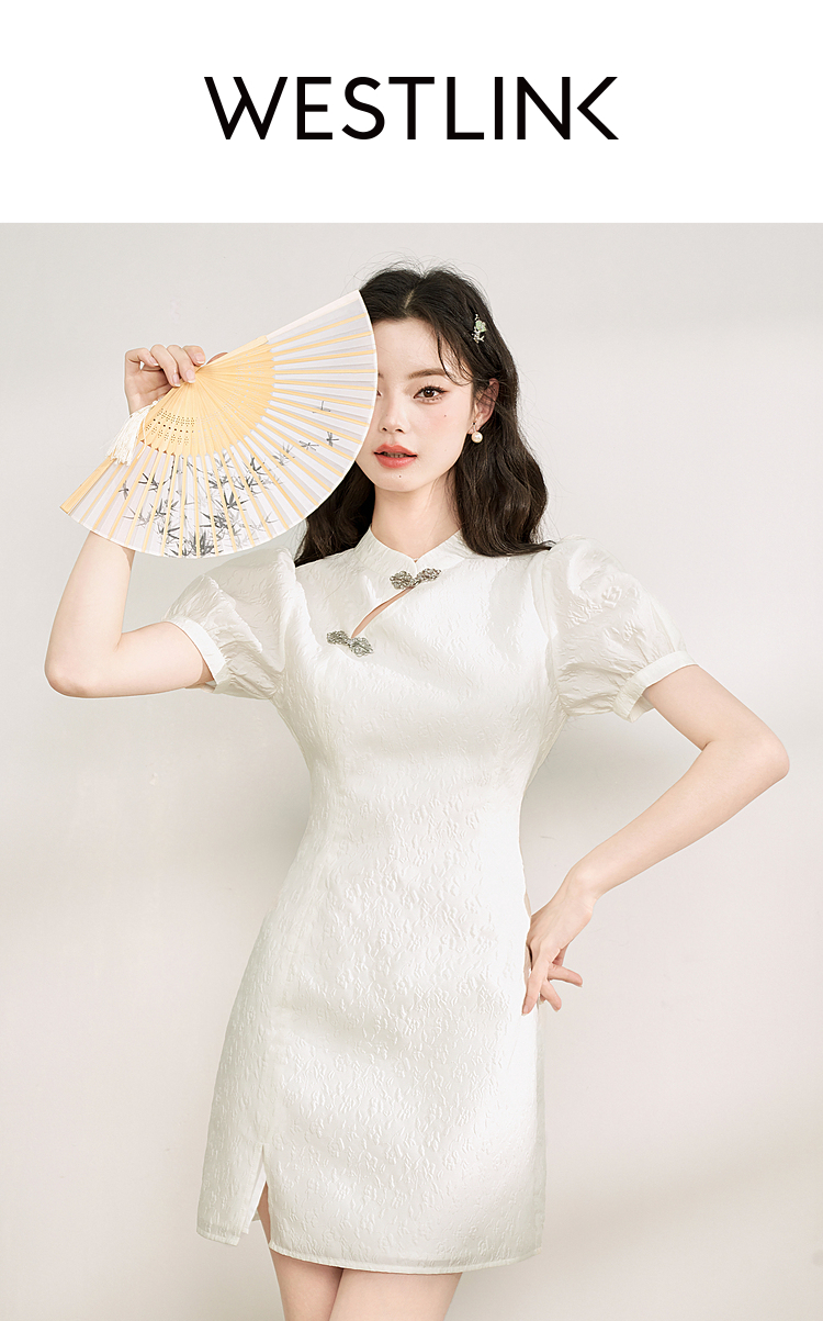 西遇新中式国风旗袍裙女2023夏新款泡泡袖开衩设计肌理感提花优雅V0031614