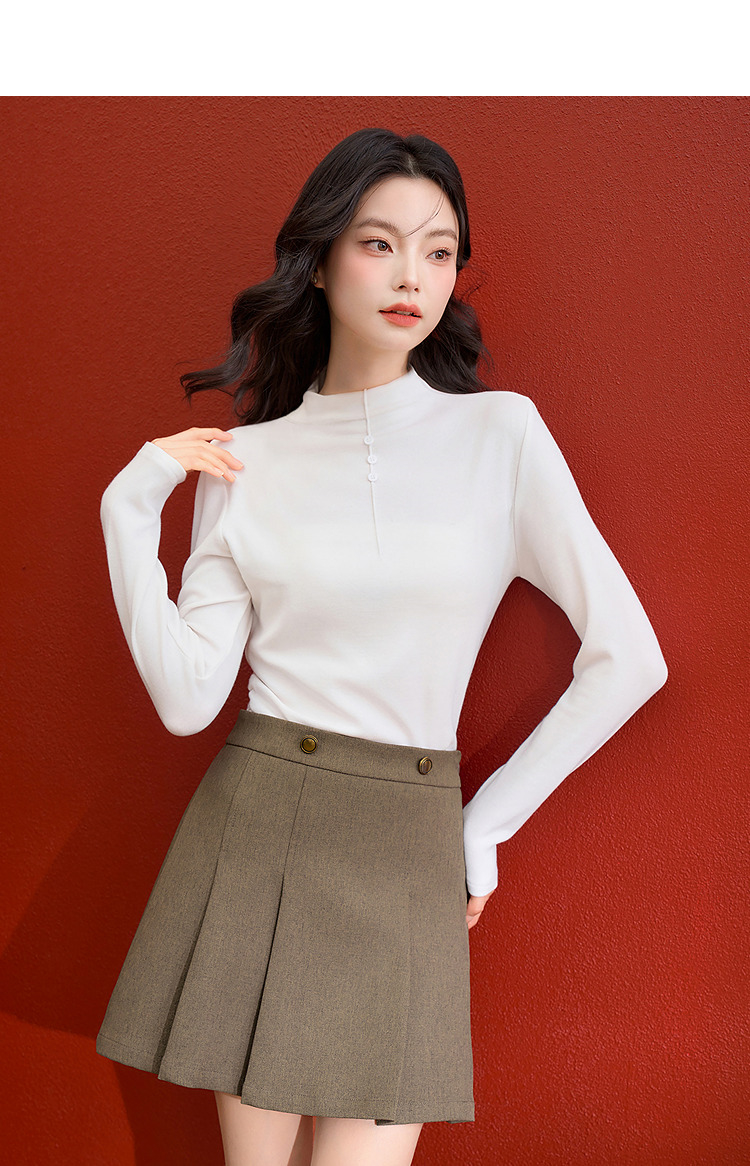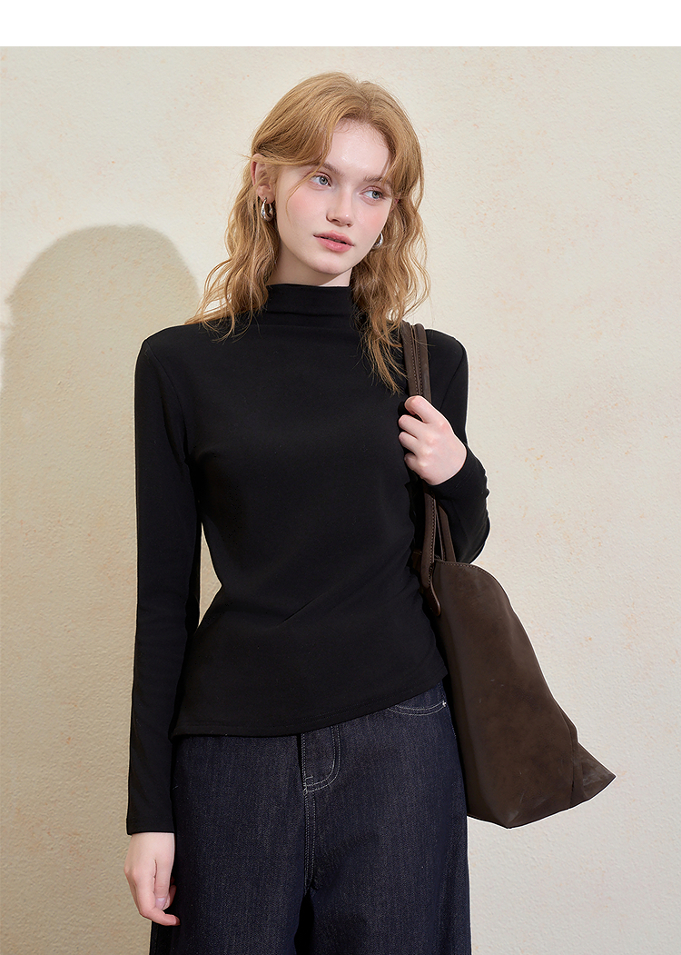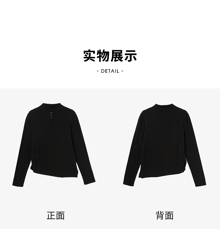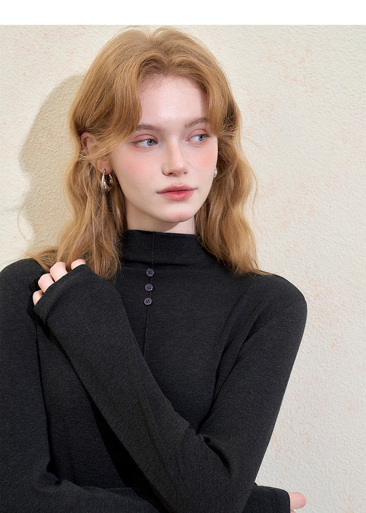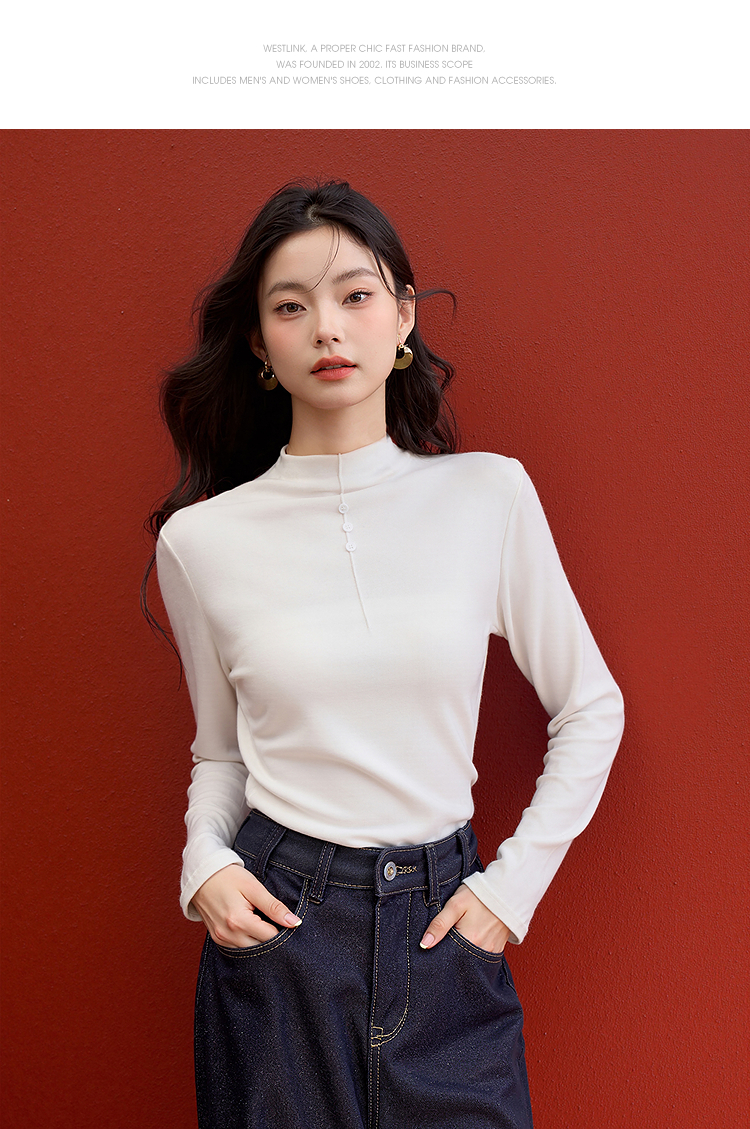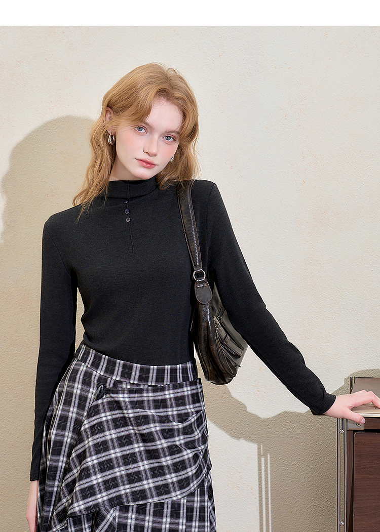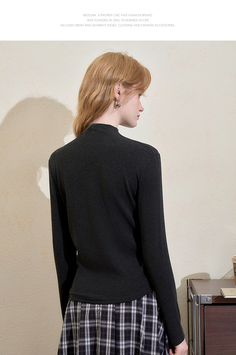 西遇半高领纽扣针织打底衫女冬季新款抽绳收腰显瘦长袖T恤H0055299