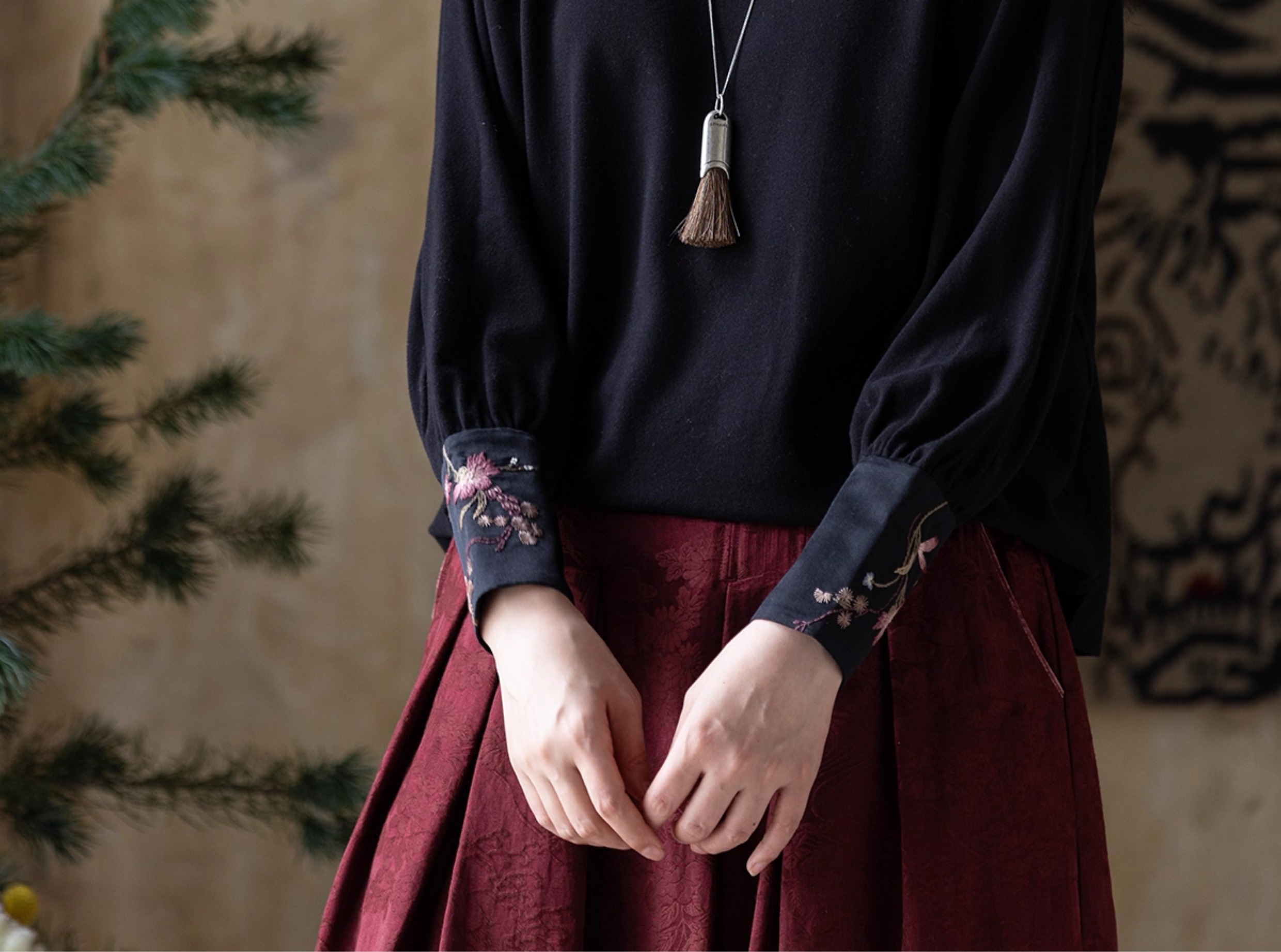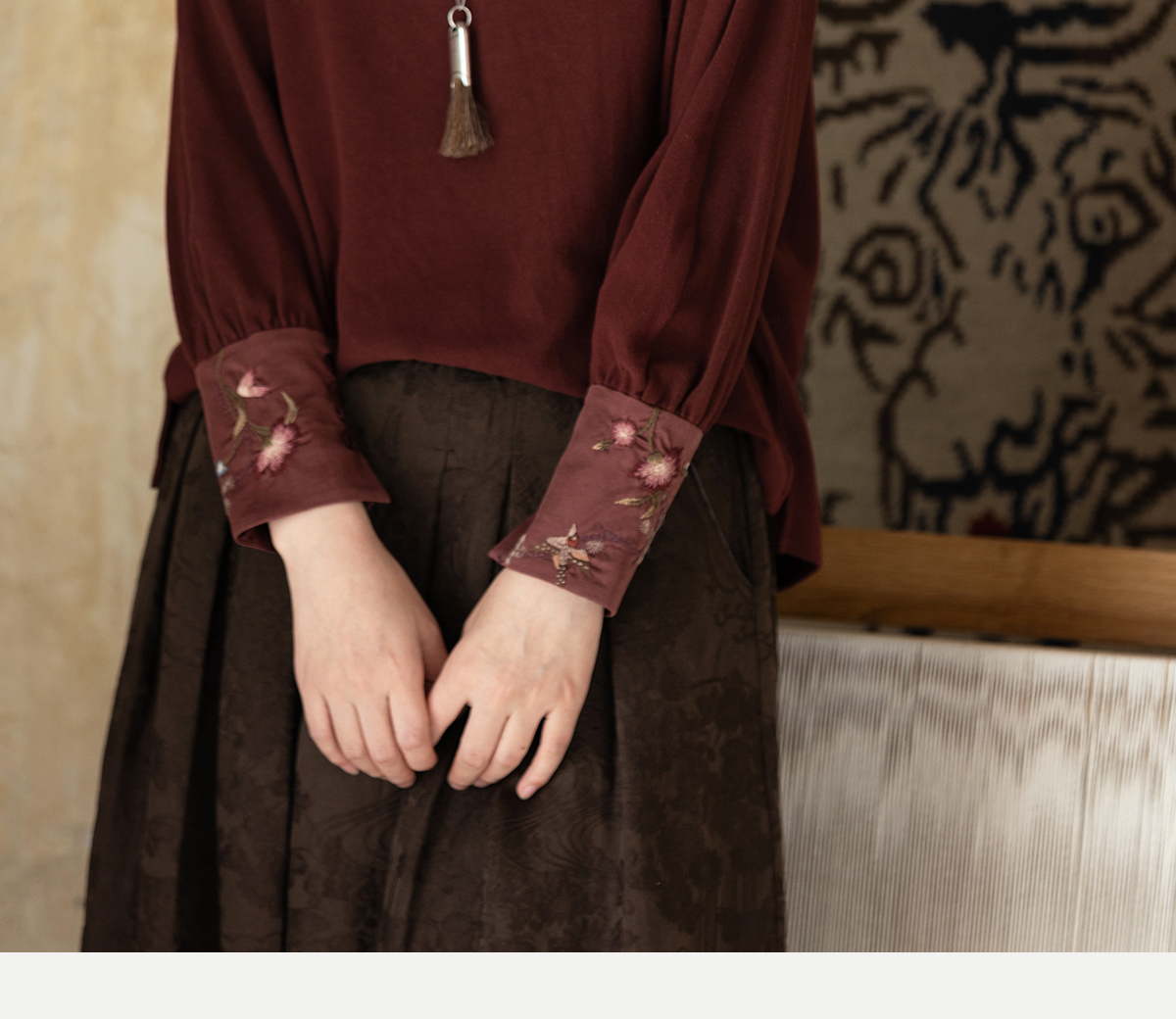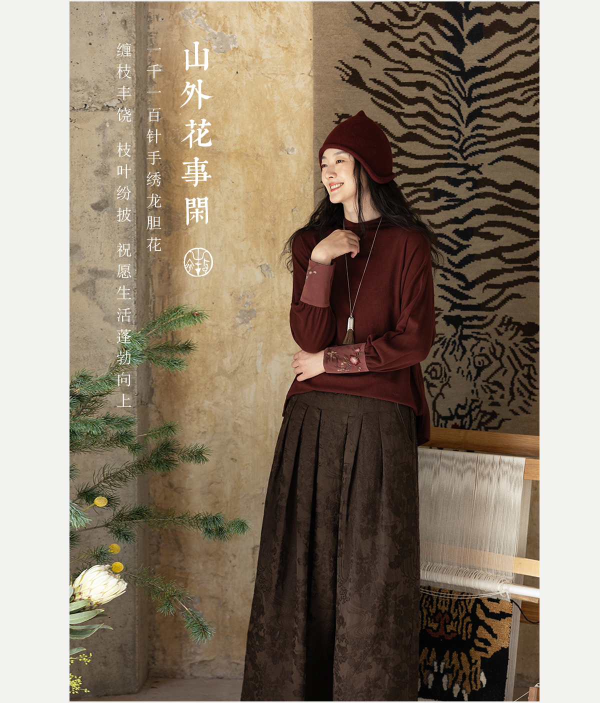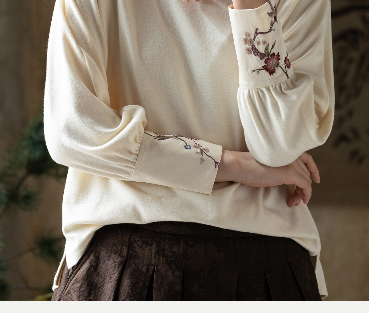 牧衣游原创棉混纺手工刺绣T恤女冬柔软亲肤简约百搭宽松上衣 檐铃