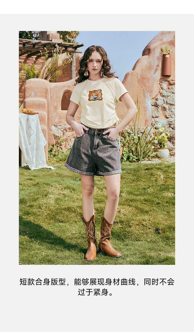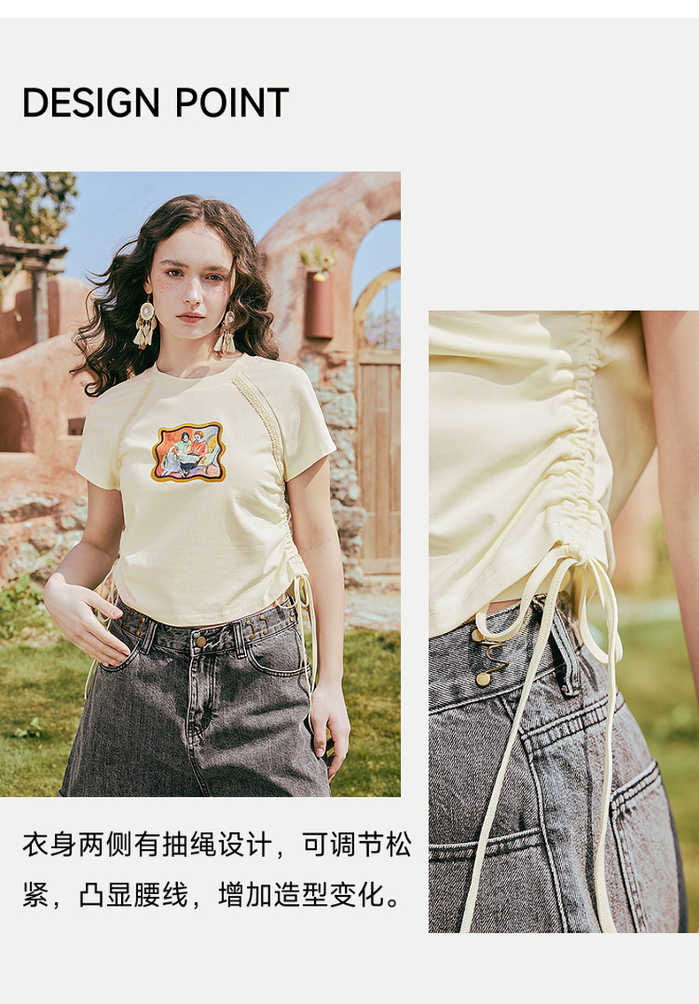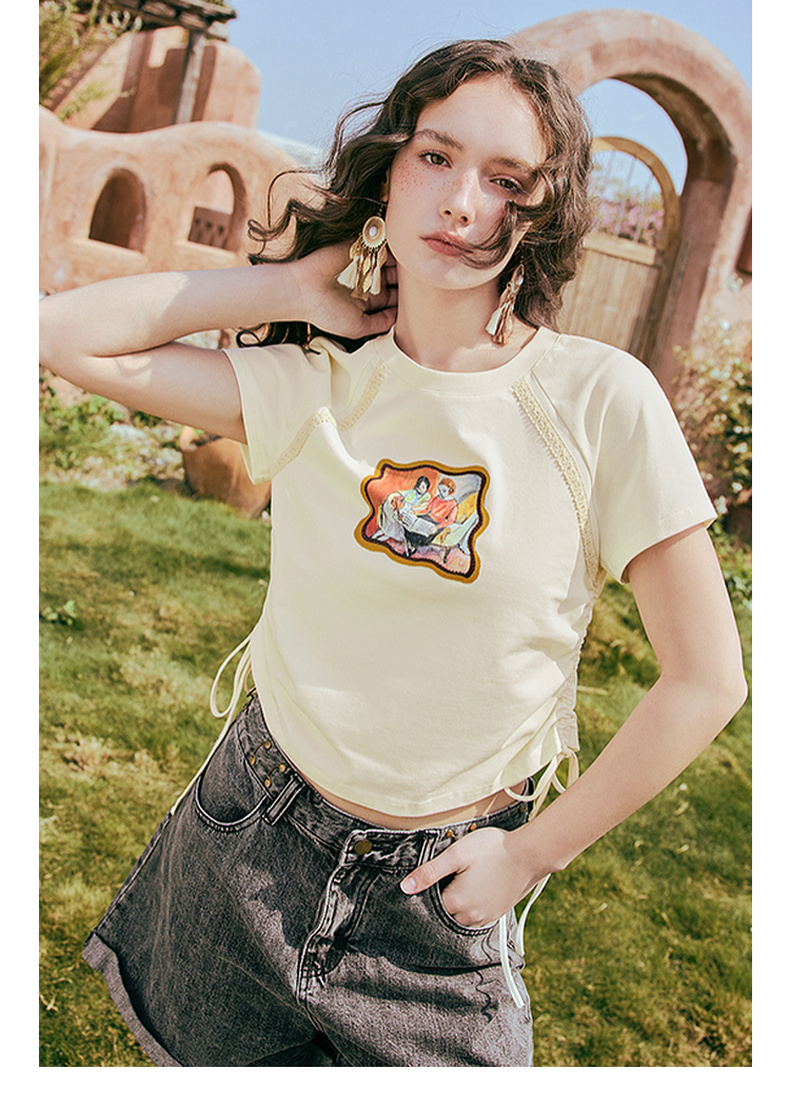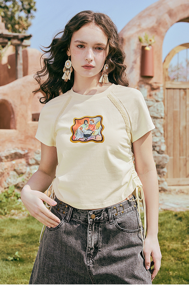 两三事 蜜框日记 2025夏季新款时尚印花刺绣抽绳短袖t恤女
