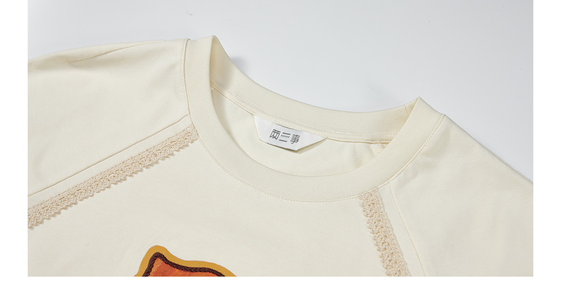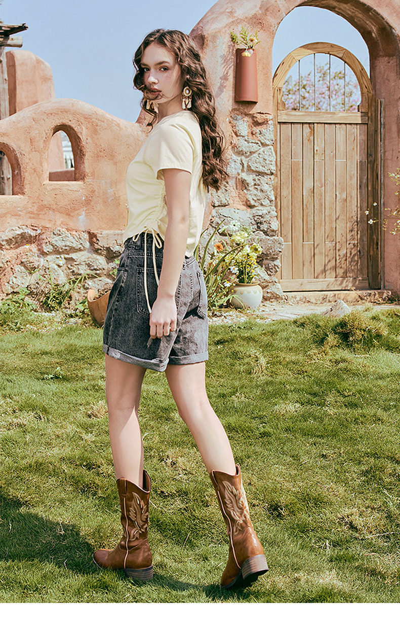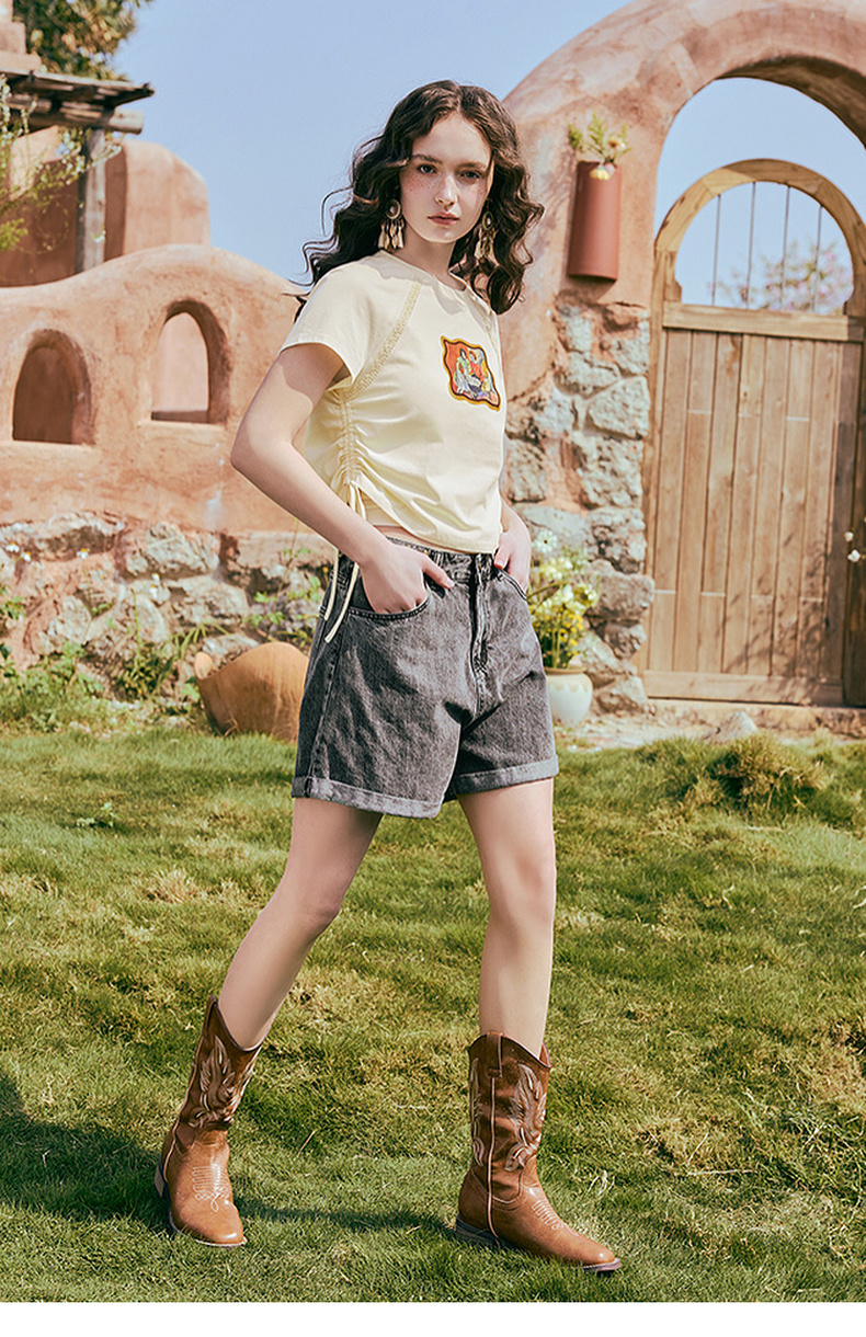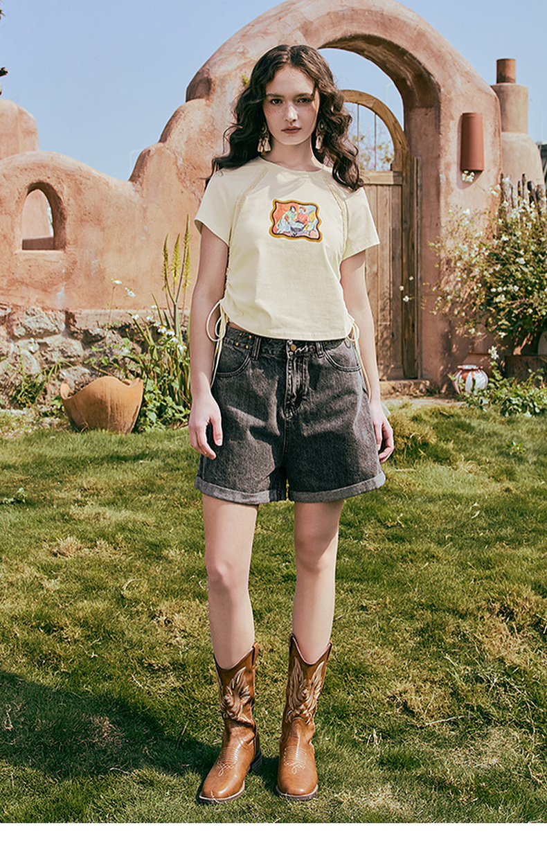 两三事 蜜框日记 2025夏季新款时尚印花刺绣抽绳短袖t恤女