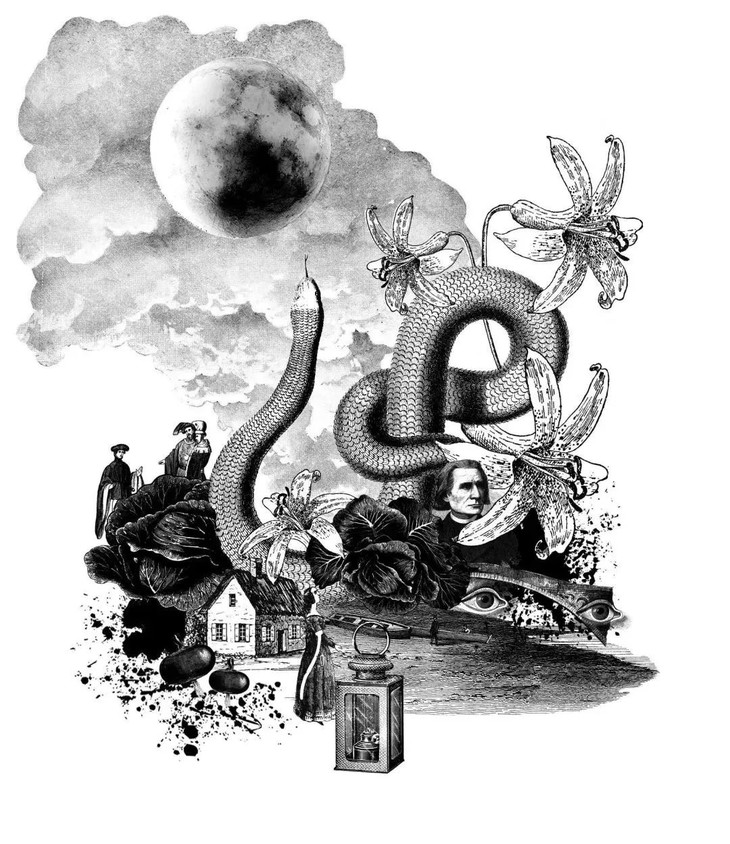1795年,德国哲学家歌德为回应挚友弗里德里克·席勒不久前的来信,写就了一篇《青蛇与美丽的百合》的故事;围绕河流、王子、青蛇、百合、神殿等元素展开,讲述了爱与死亡、牺牲与自由的主题,暗喻了外在世界感知与人类内在理性塑造的“理想人”概念之间的关系,也帮助席勒更好地表达其“美在自由”的哲学观点。