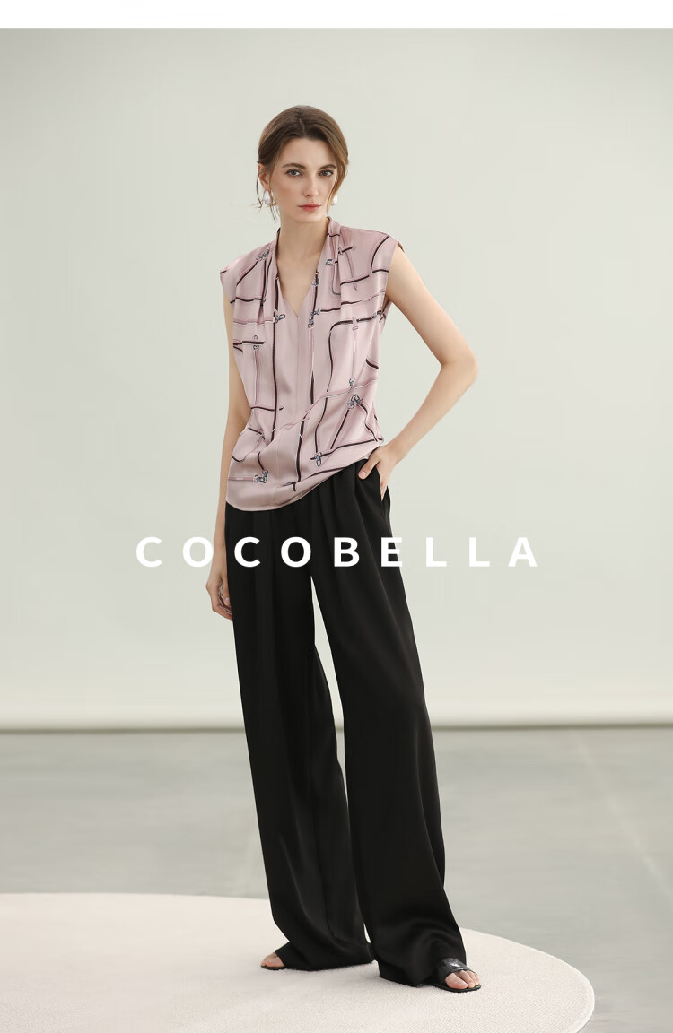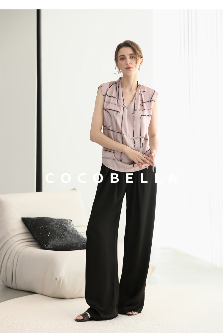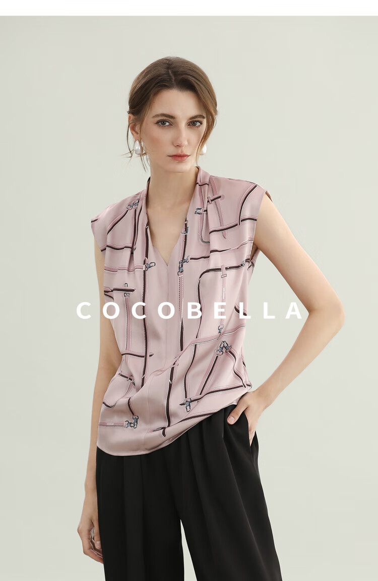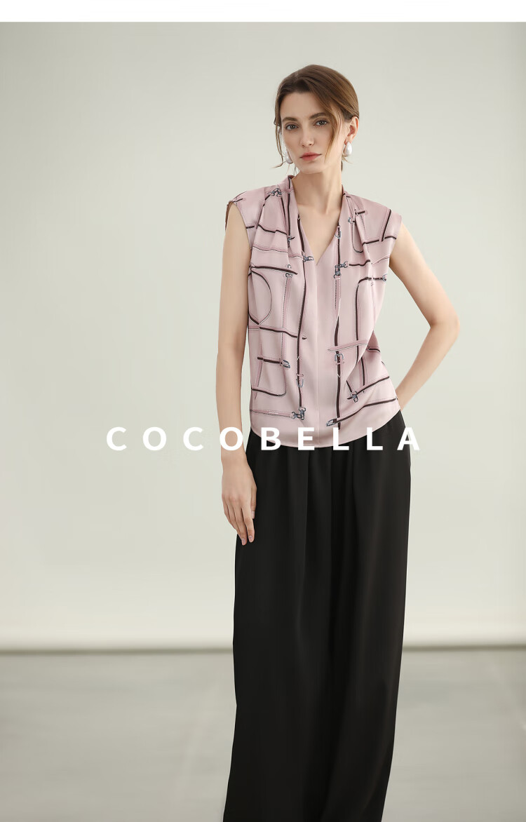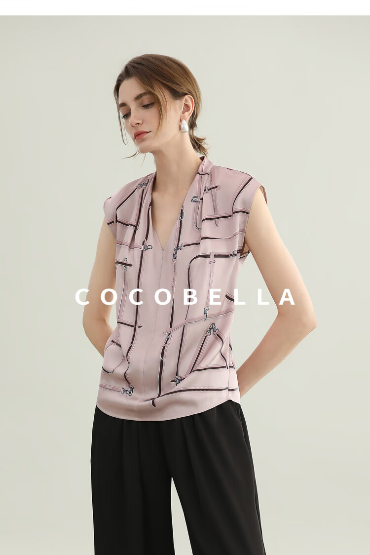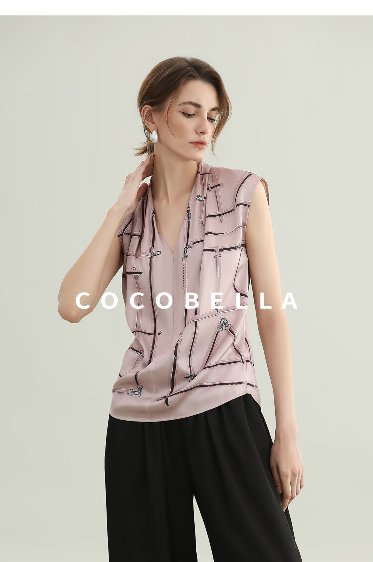 COCOBELLA樱花粉定位印花缎面无袖衬衫女V领捏褶上衣SR3102-3