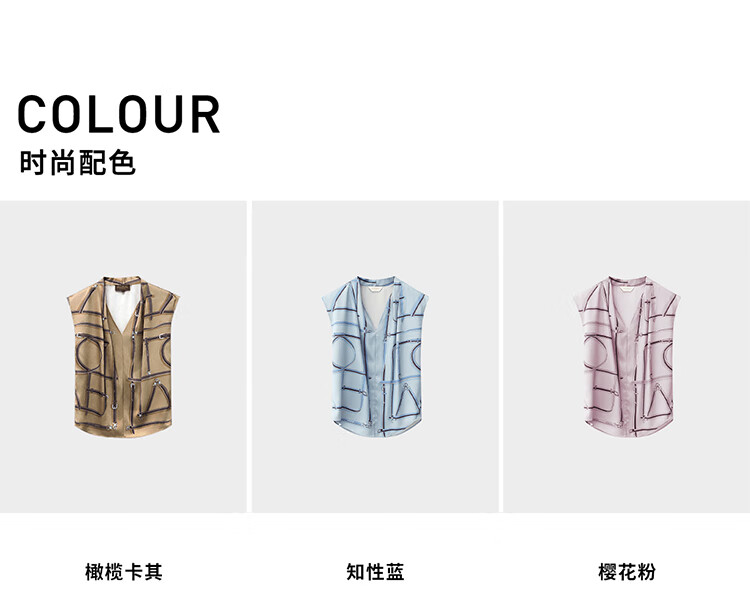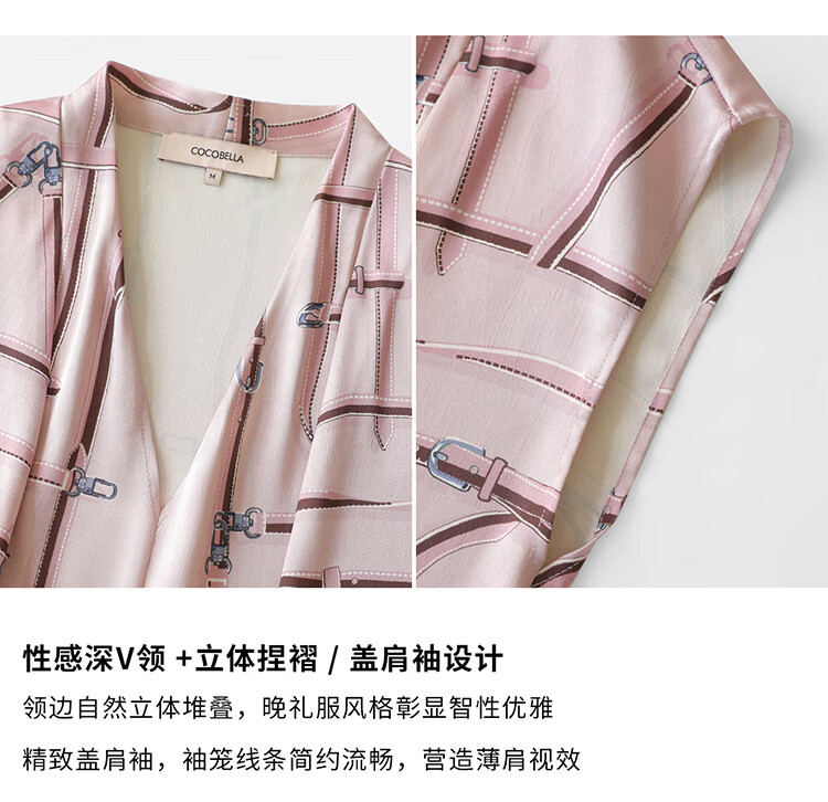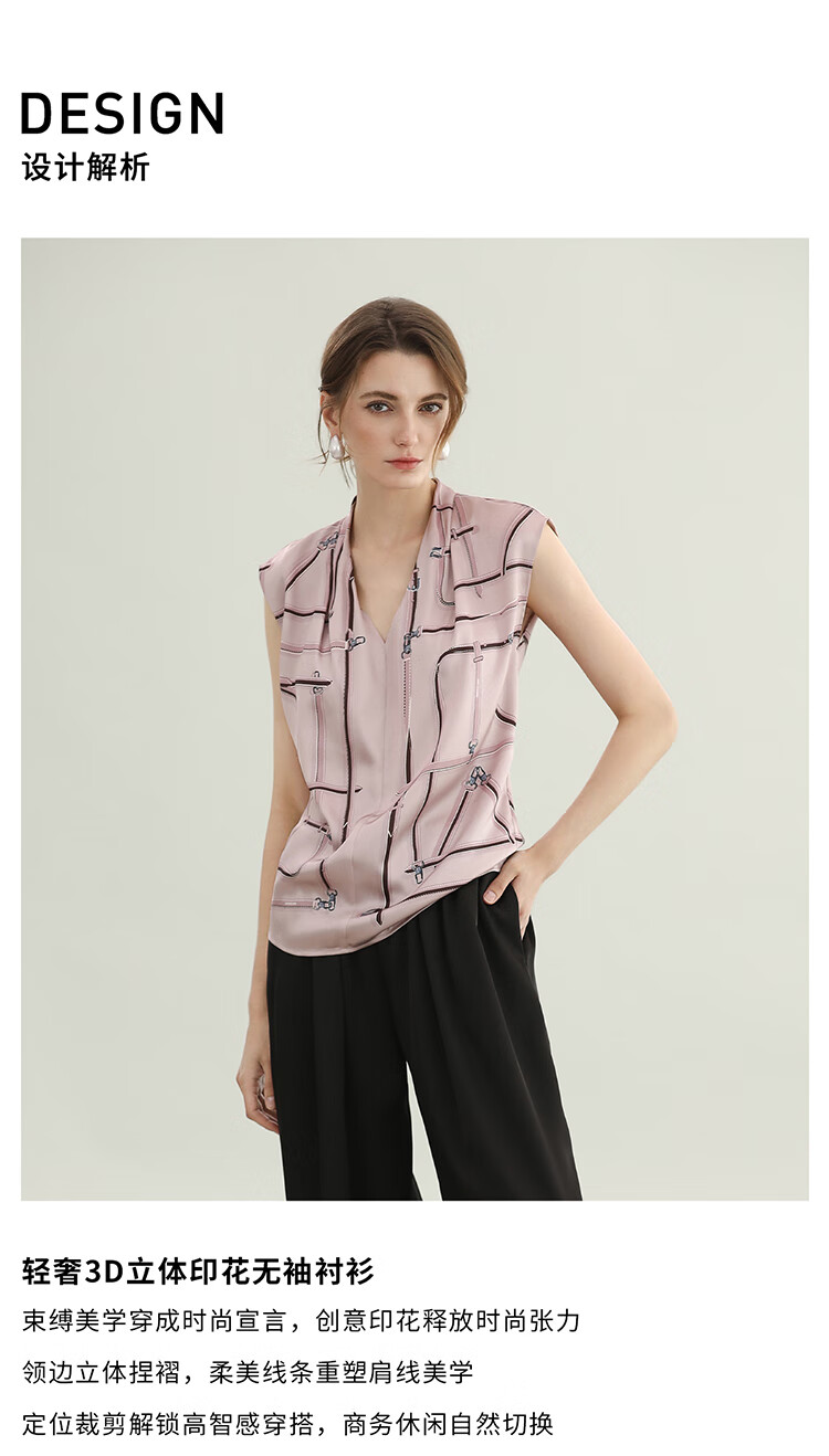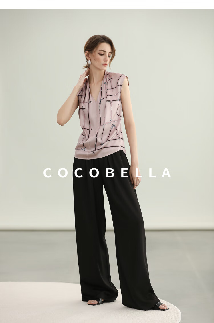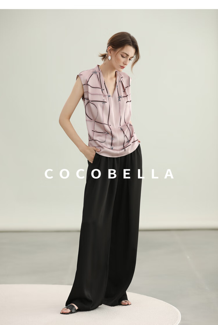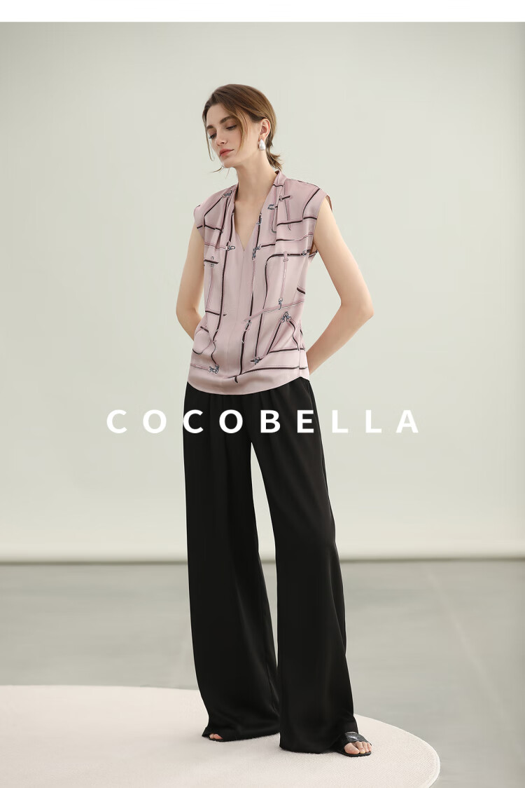 COCOBELLA樱花粉定位印花缎面无袖衬衫女V领捏褶上衣SR3102-3