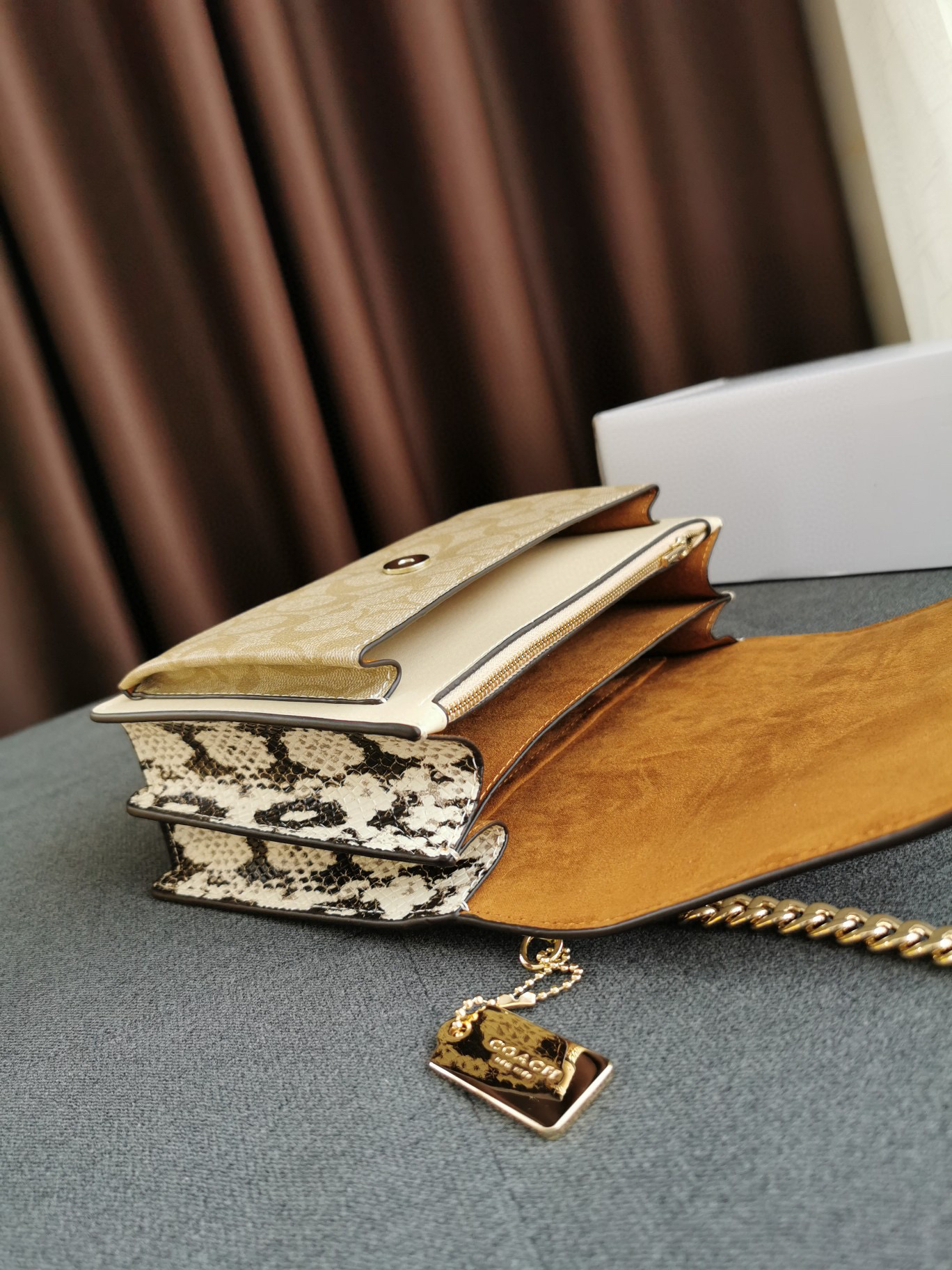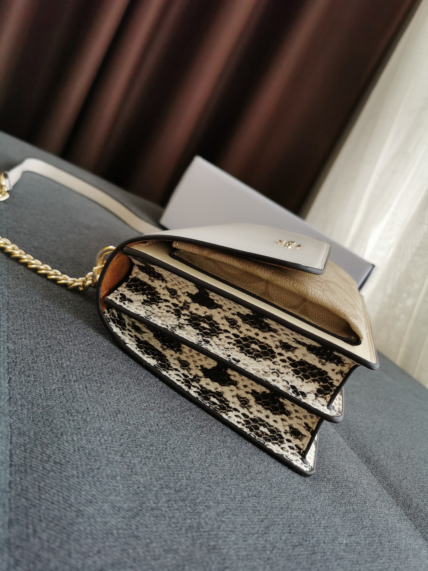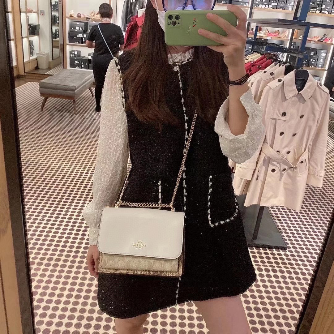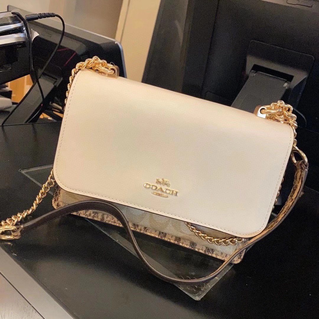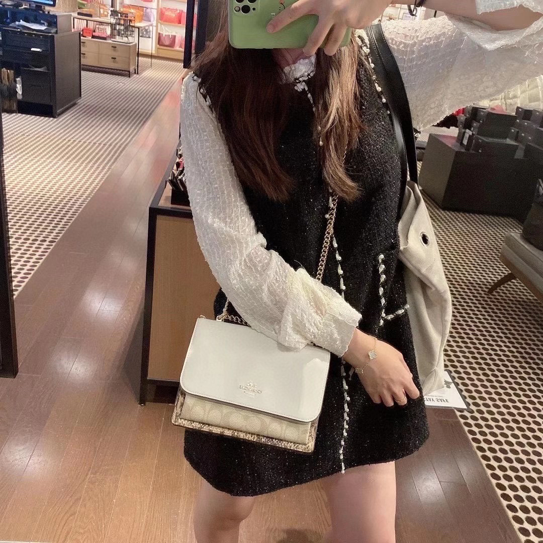 coach经典山茶花的配色,风琴包的包型,外配铆钉,翻盖黑色的光滑小🐂皮,丰富的细节及蛇皮压纹的侧边,简直让人爱不释手啊
