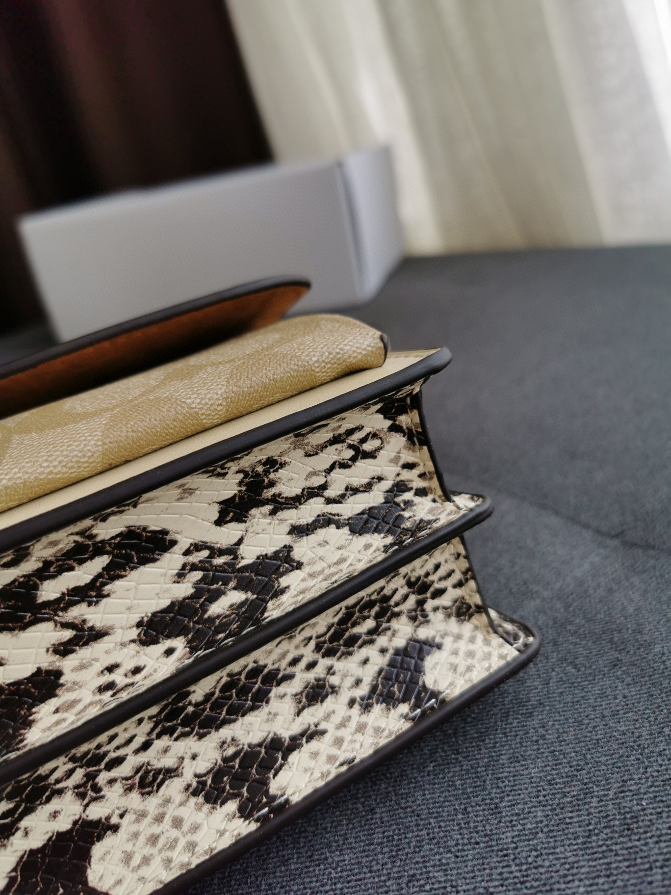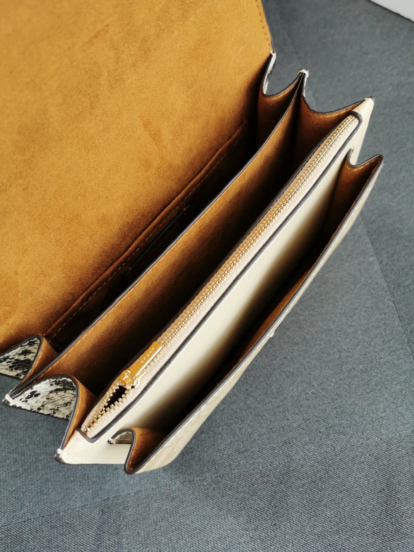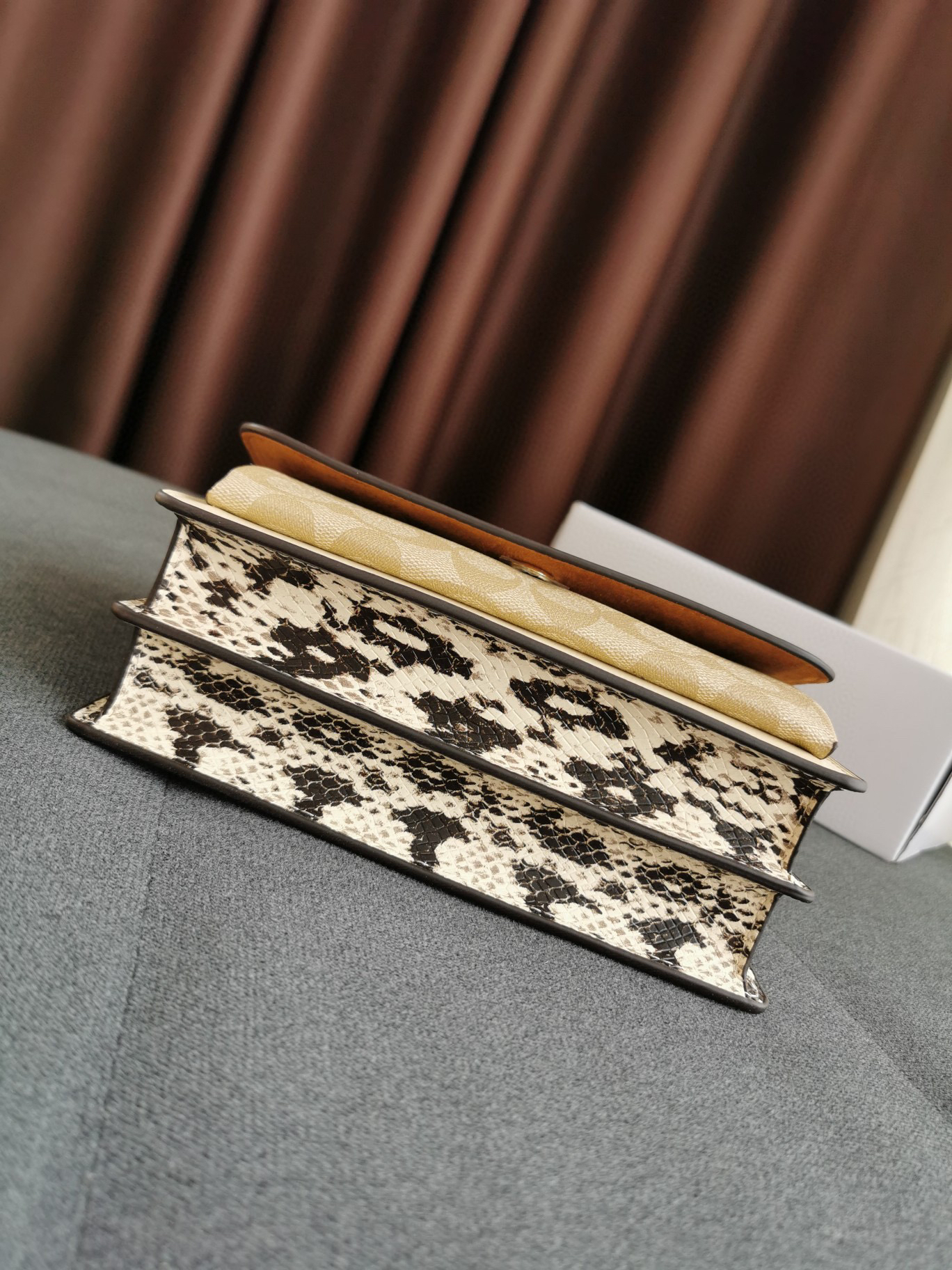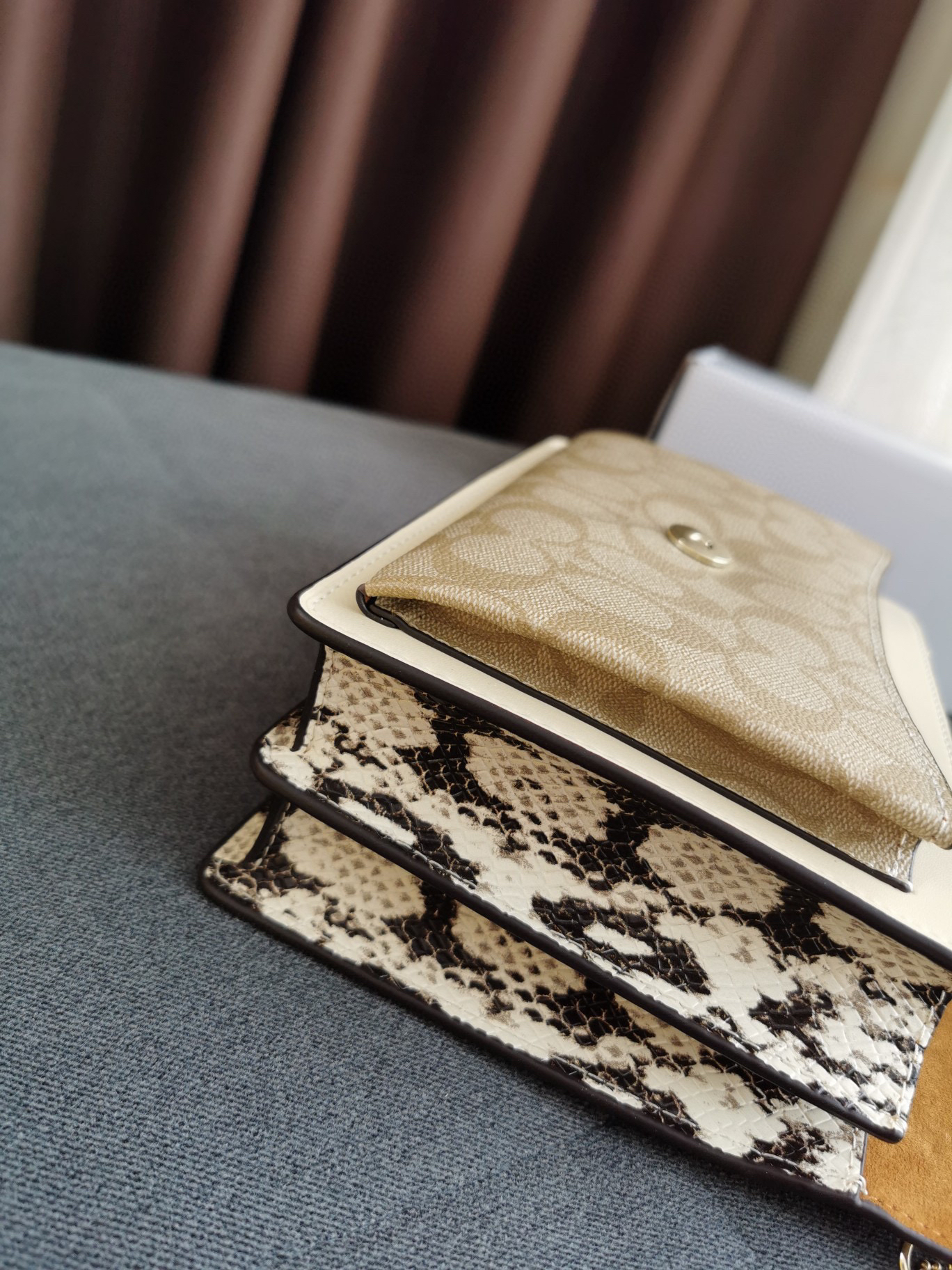 coach经典山茶花的配色,风琴包的包型,外配铆钉,翻盖黑色的光滑小🐂皮,丰富的细节及蛇皮压纹的侧边,简直让人爱不释手啊