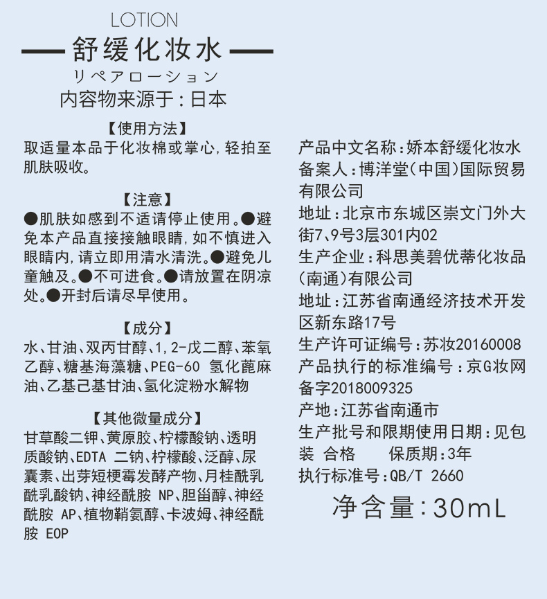 娇本舒缓化妆水