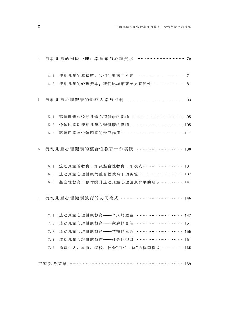 本书聚焦城市化进程中流动儿童群体的心理健康与教育议题,以“描述—解释—预测—控制”为逻辑主线,系统考察其心理发展规律与教育干预路径。本书突破传统对流动儿童“问题视角”的局限,兼顾其消极心理与积极品质的双向剖析,既深入探讨相对剥夺感等风险因素的负面影响,亦挖掘幸福感、心理资本等积极品质的内在保护机制。通过整合家庭、学校、社区等多维环境与个体因素的交互作用,揭示流动儿童心理发展的影响机制,并基于实证研究提出“整合性教育干预”模式及其实践启示。最后,创新性构建个人—家庭—学校—社会“四位一体”的协同教育模式,旨在为促进流动儿童心理健康发展提供兼具理论深度与实践价值的系统性解决方案。本书为教育工作者、政策制定者及研究者提供了重要参考,助力推动教育公平与社会和谐进程。