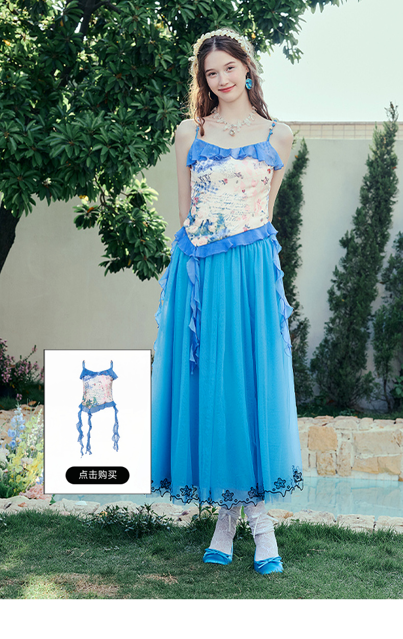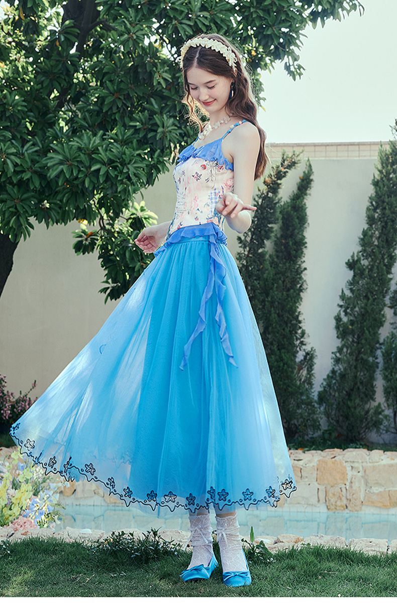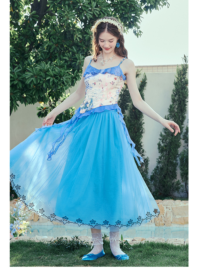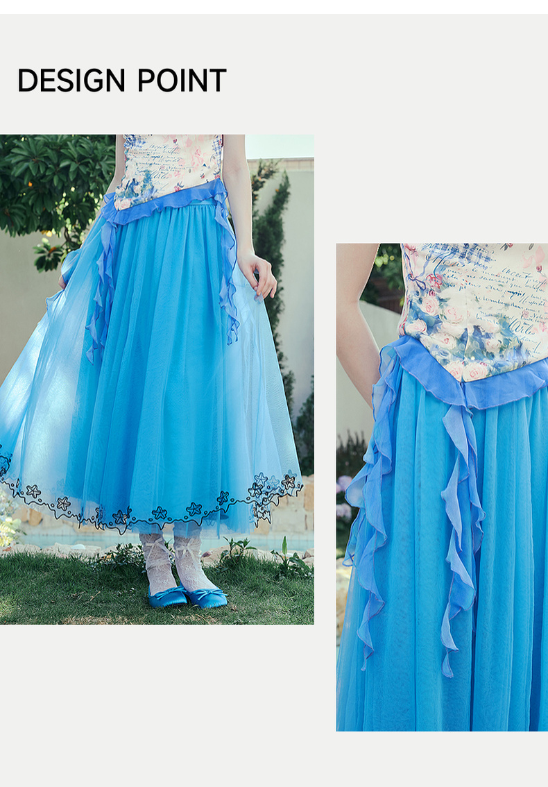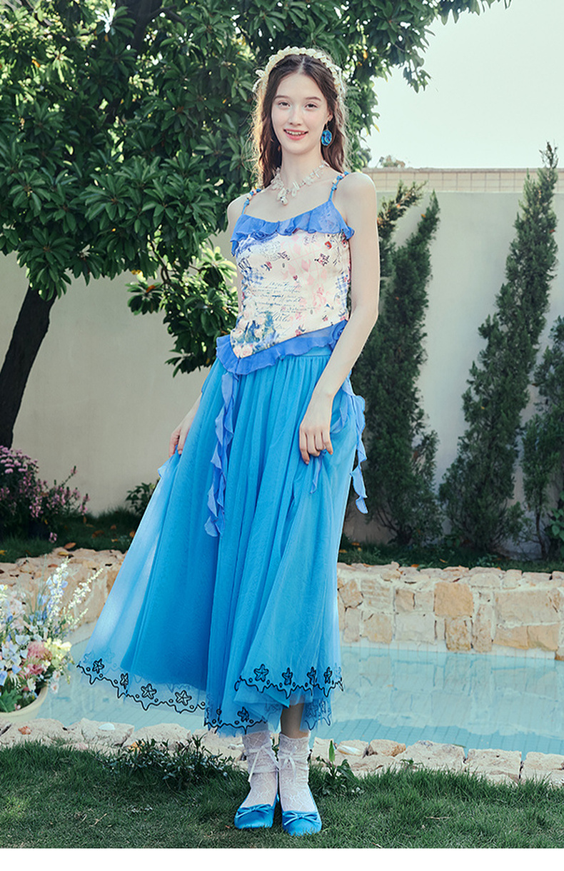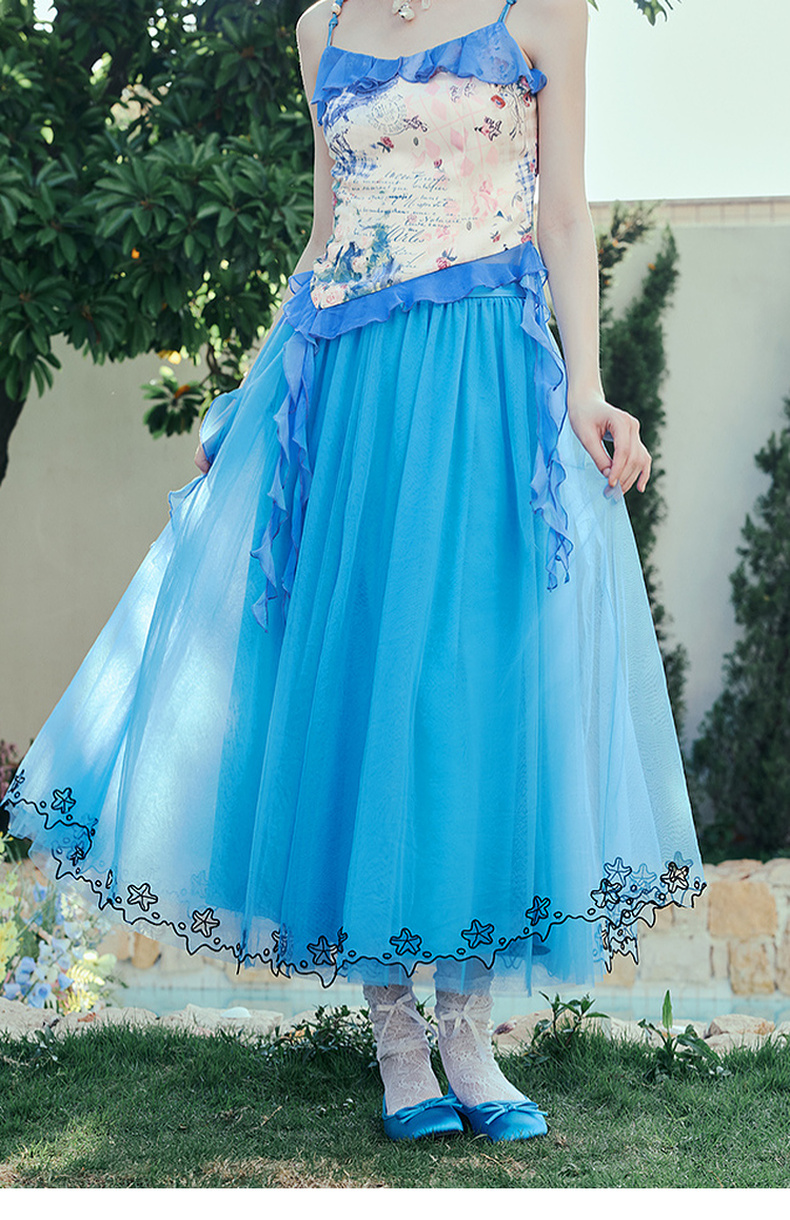 两三事冰蓝幽泊2025夏季新款甜美绣花边裙摆多层网纱公主裙半身裙