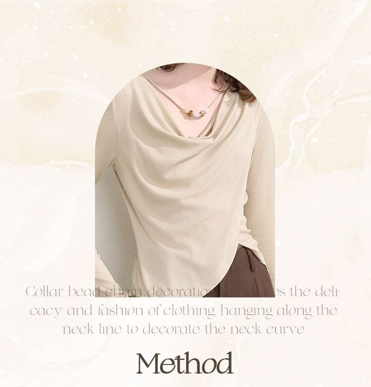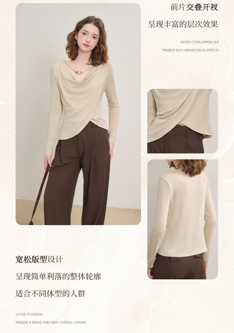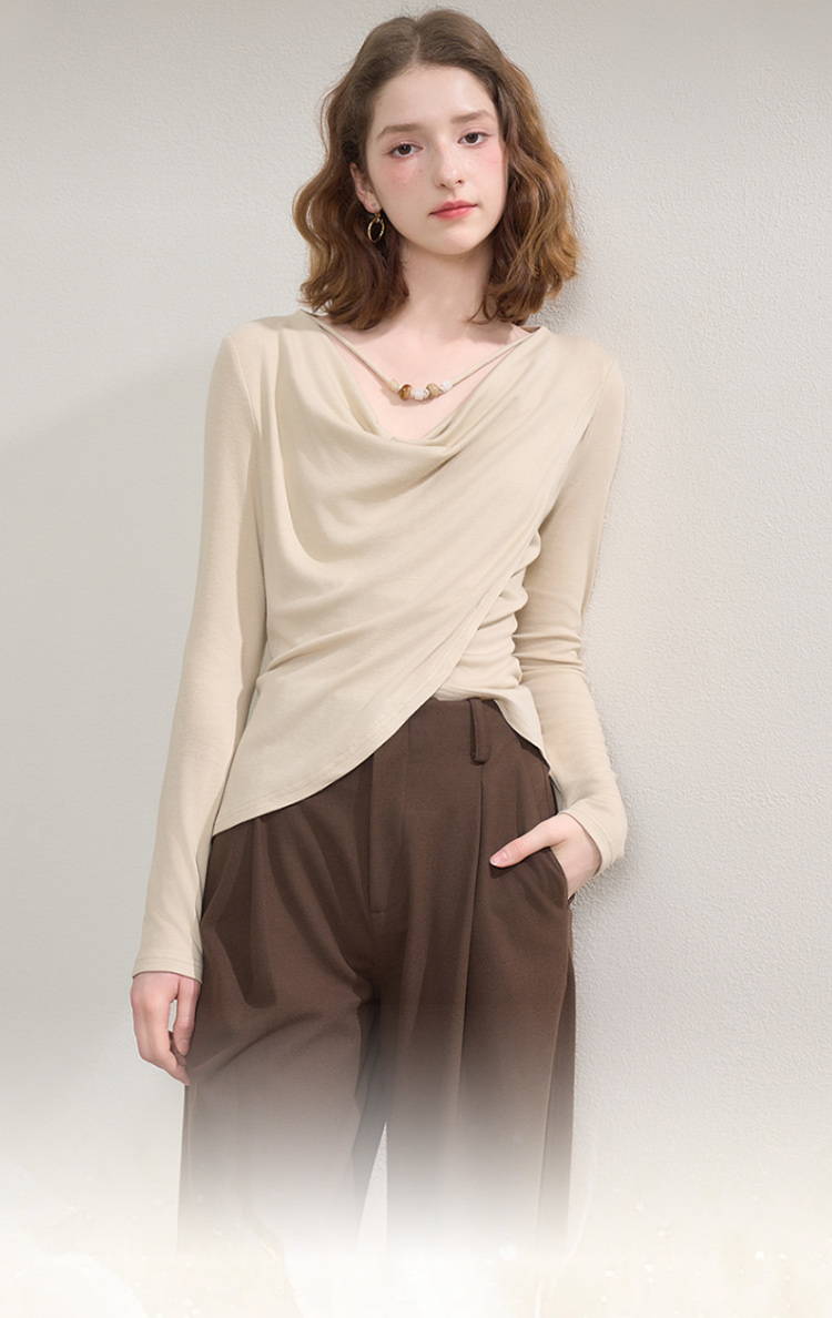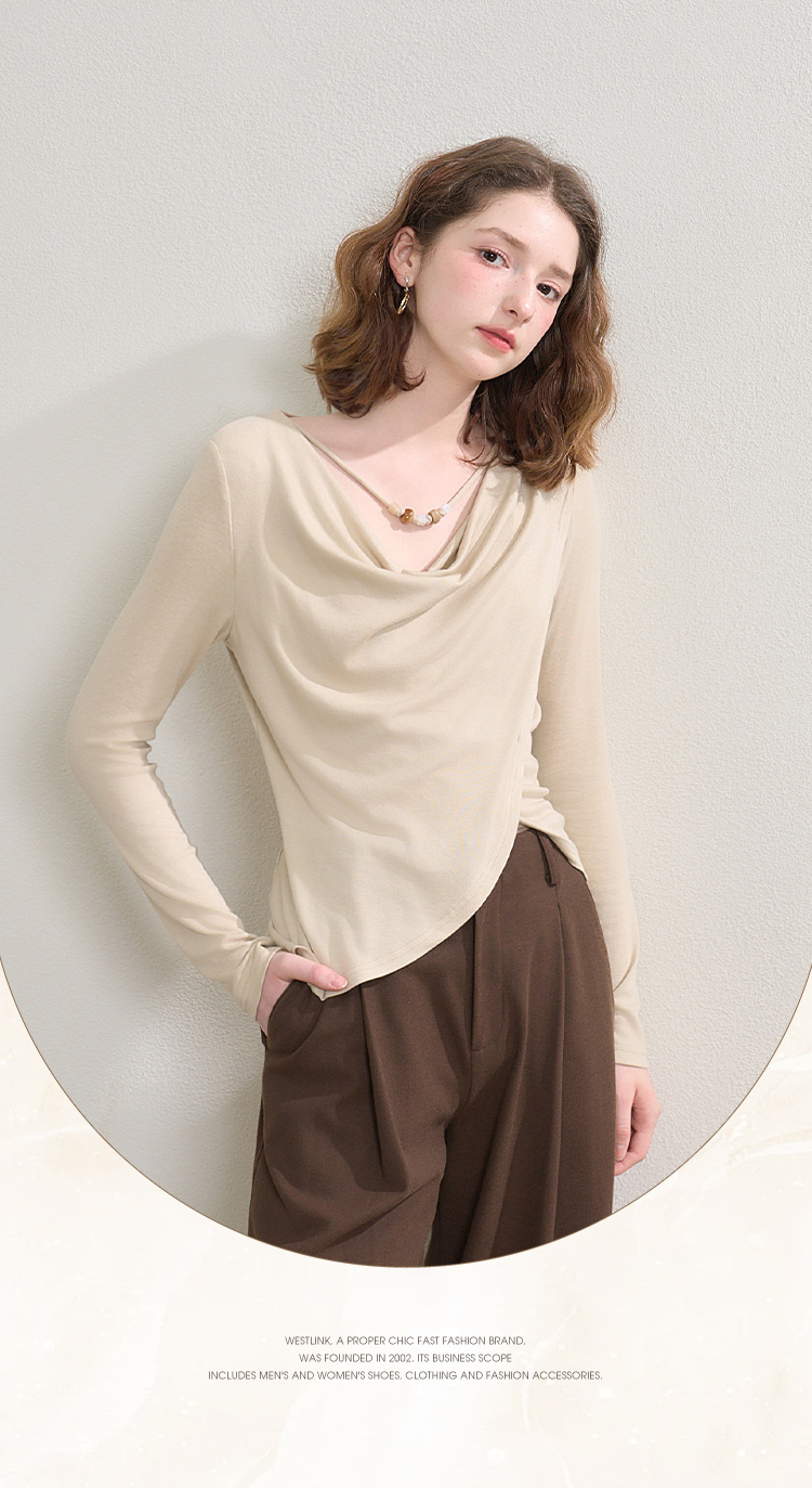 西遇串珠荡领不规则长袖T恤女秋季设计感收腰显瘦针织衫V2651147