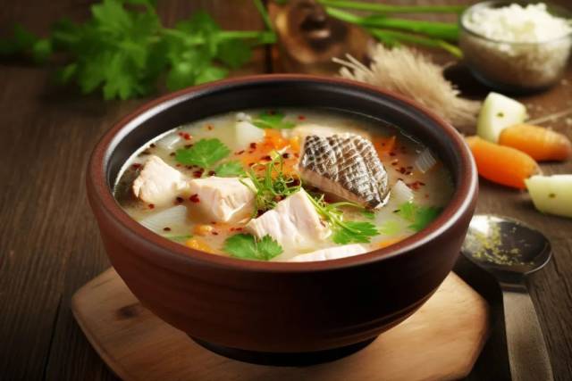 做法:在鲫鱼背处横切一刀,将1汤匙盐均匀地抹在鱼身上,往鱼腹塞入少许姜丝,腌制15分钟。把这些原料都放入锅中,加1汤匙料酒和4碗清水大火煮沸,改小火焖煮35分钟。