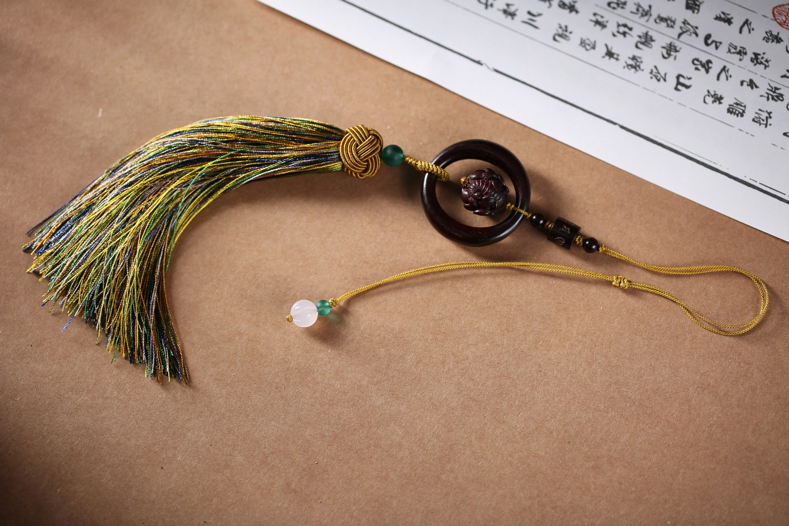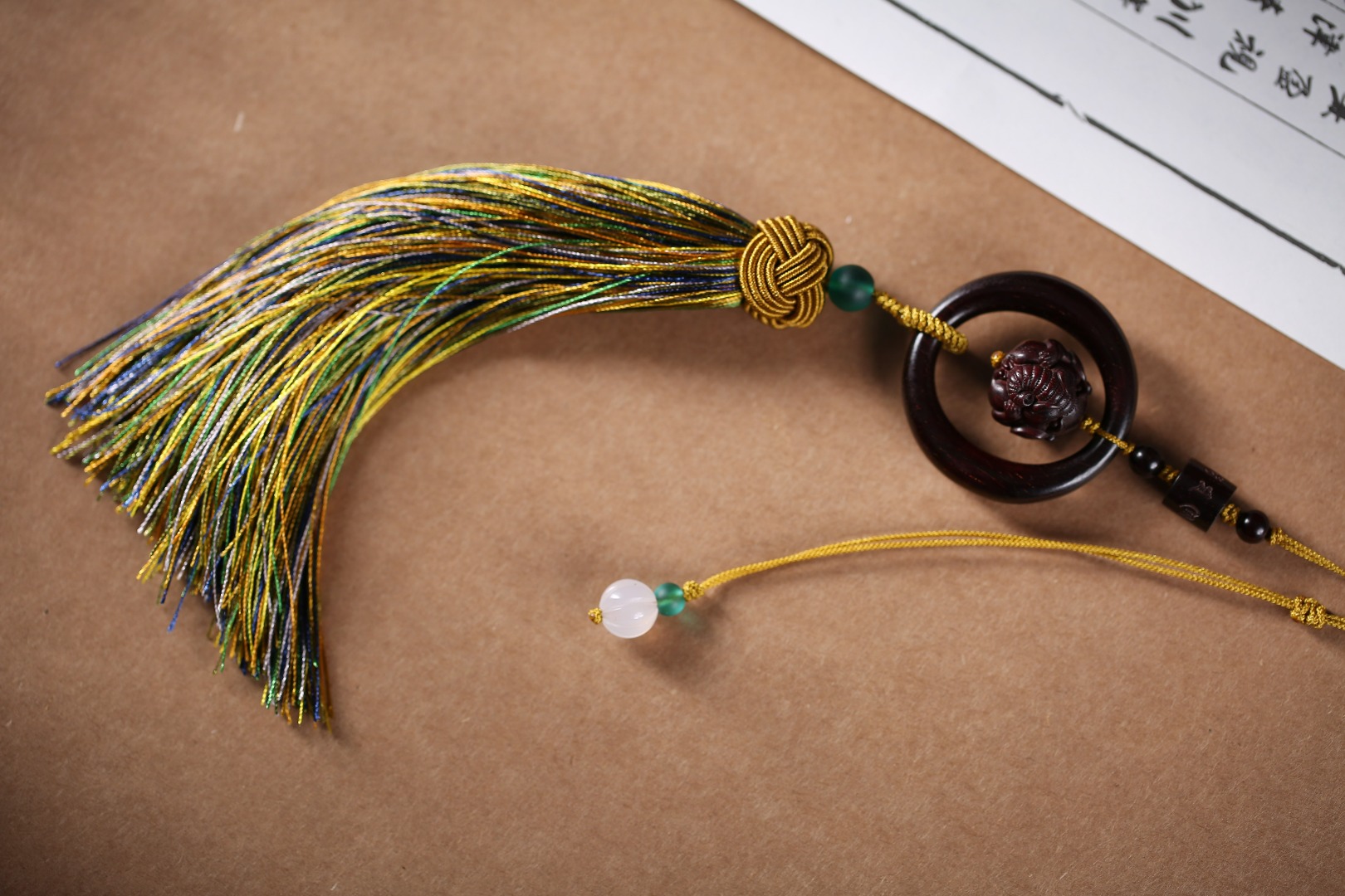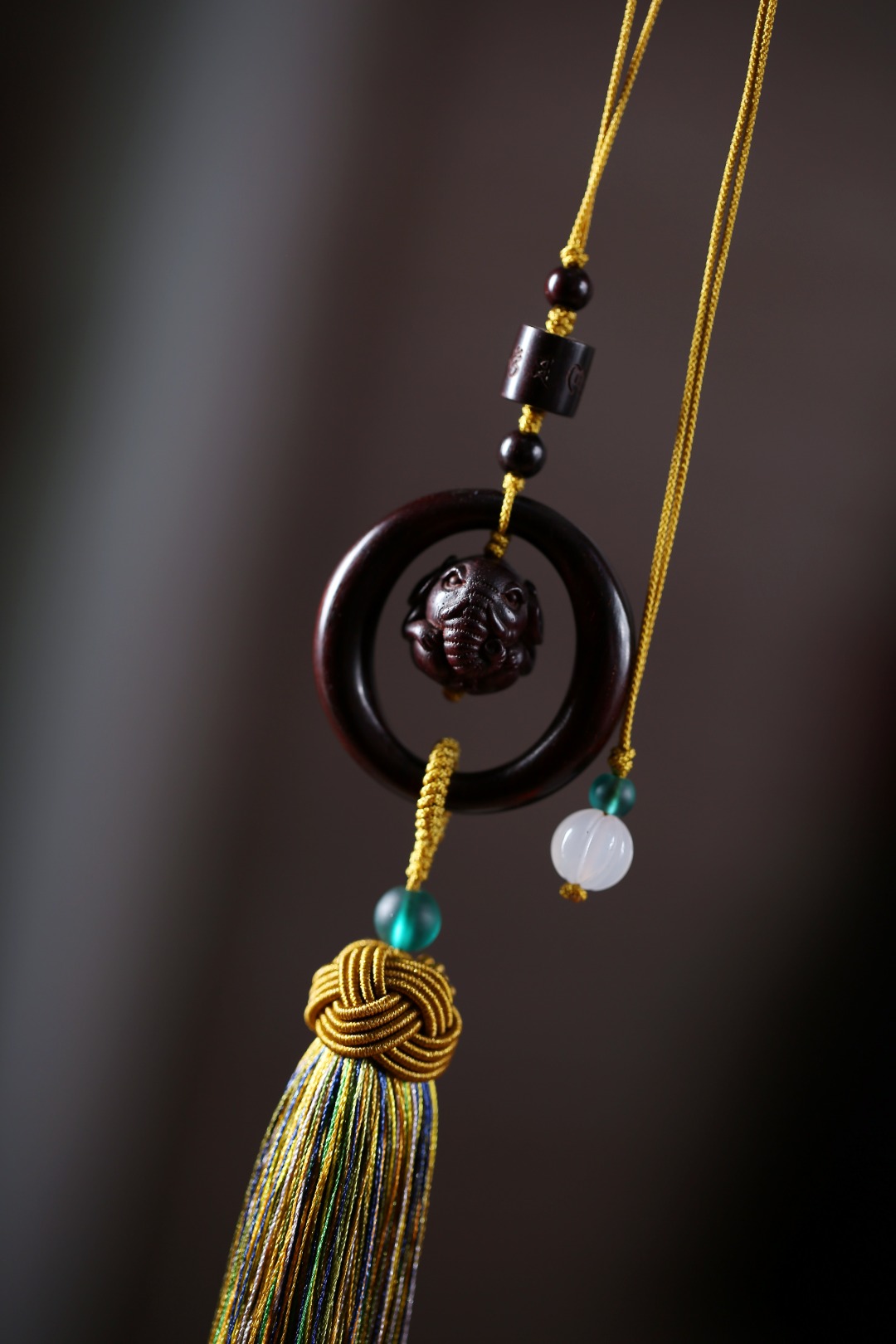 配件:紫檀大象/紫檀圆环/紫檀六字真言/琉璃绿/白玛瑙南瓜珠/五彩流苏(黄+蓝)