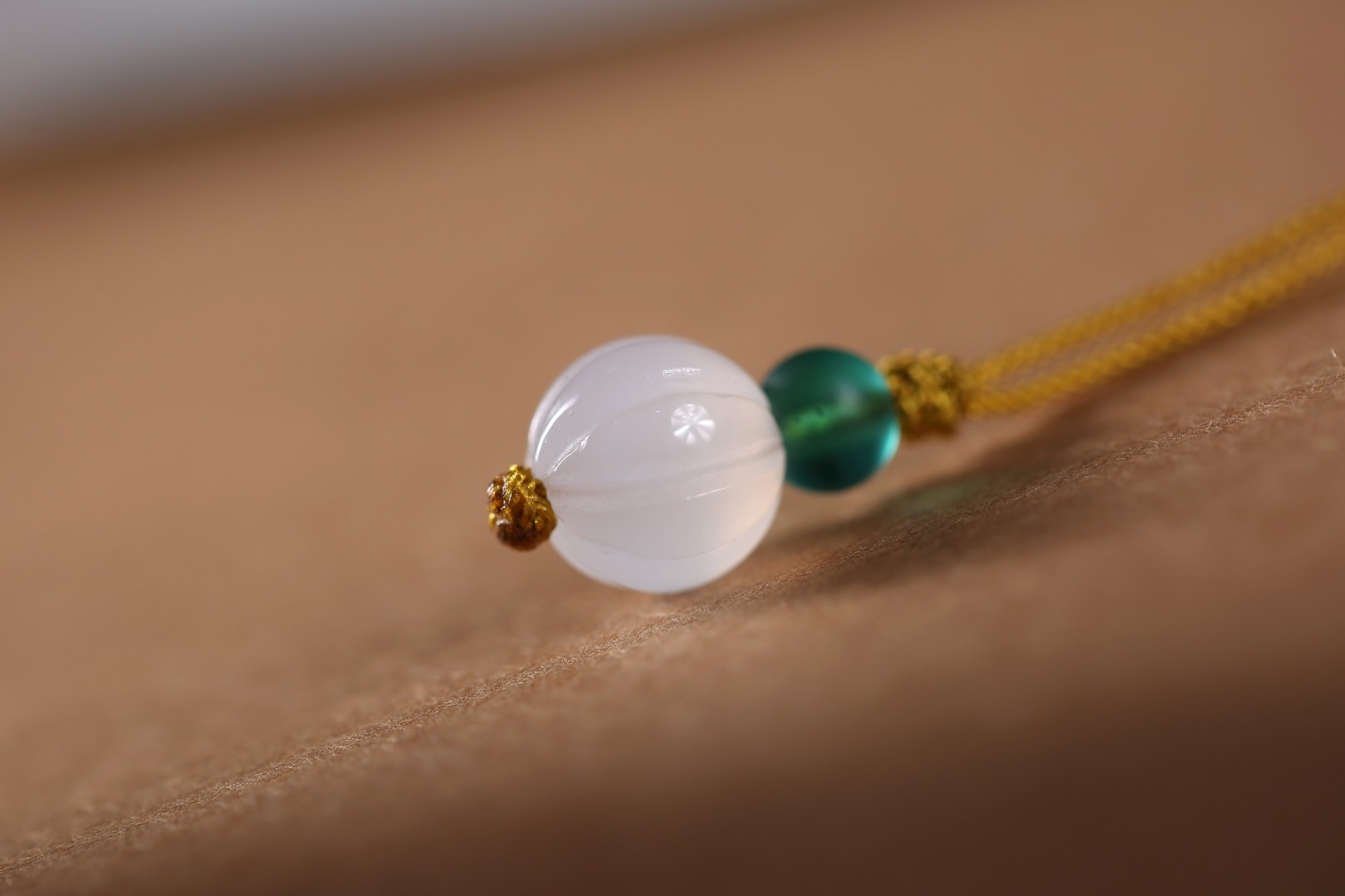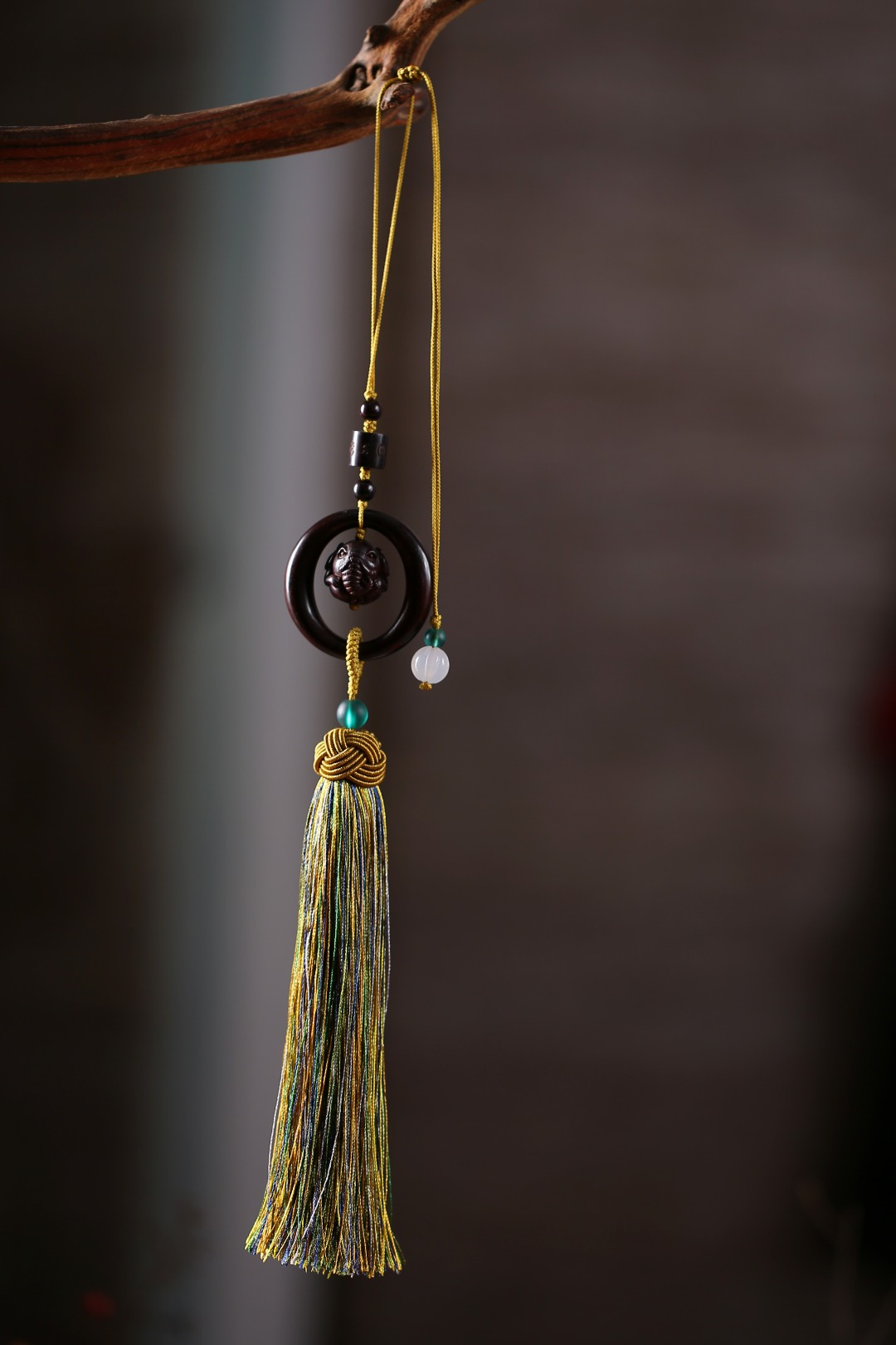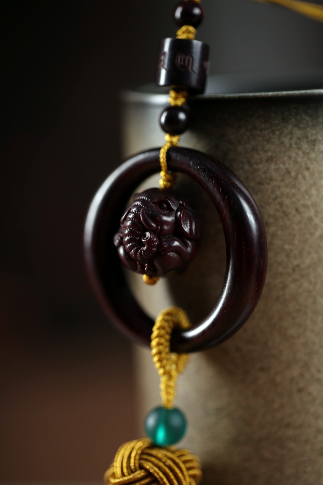 配件:紫檀大象/紫檀圆环/紫檀六字真言/琉璃绿/白玛瑙南瓜珠/五彩流苏(黄+蓝)