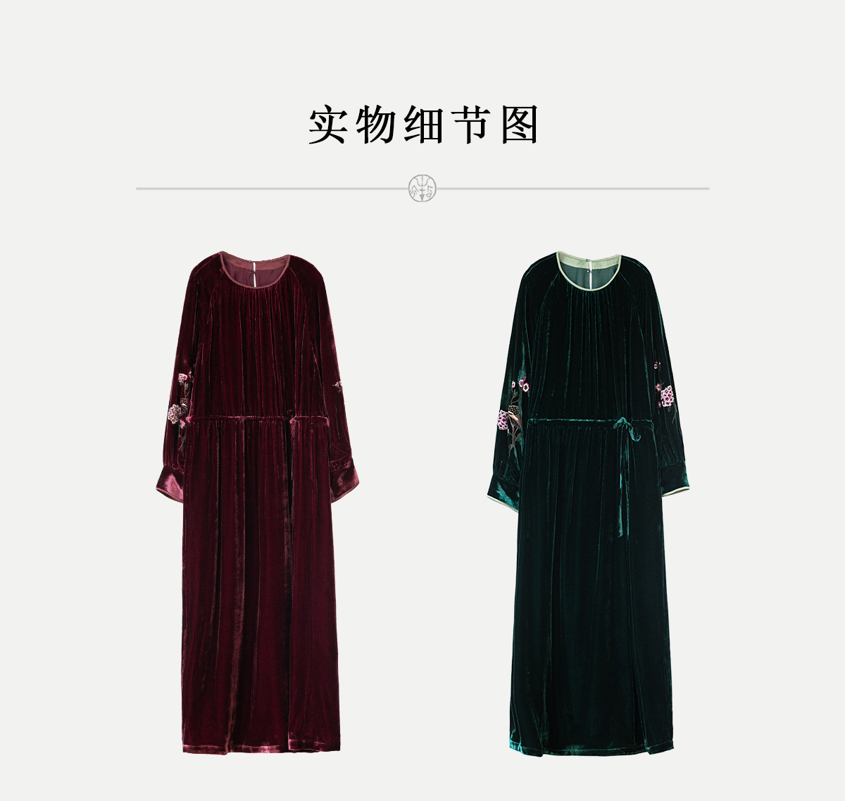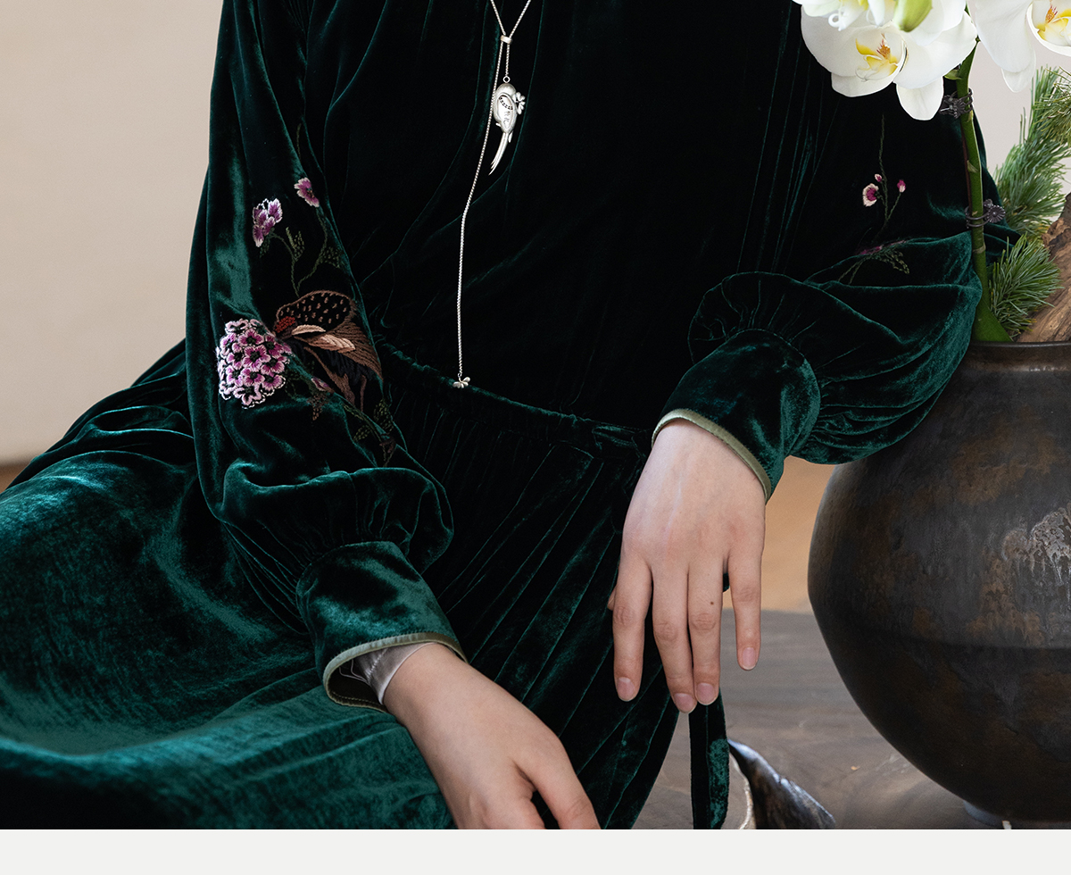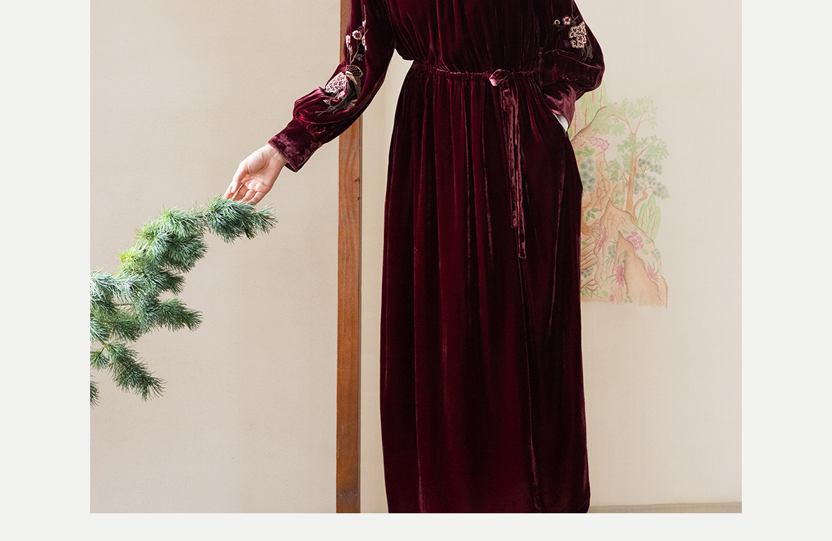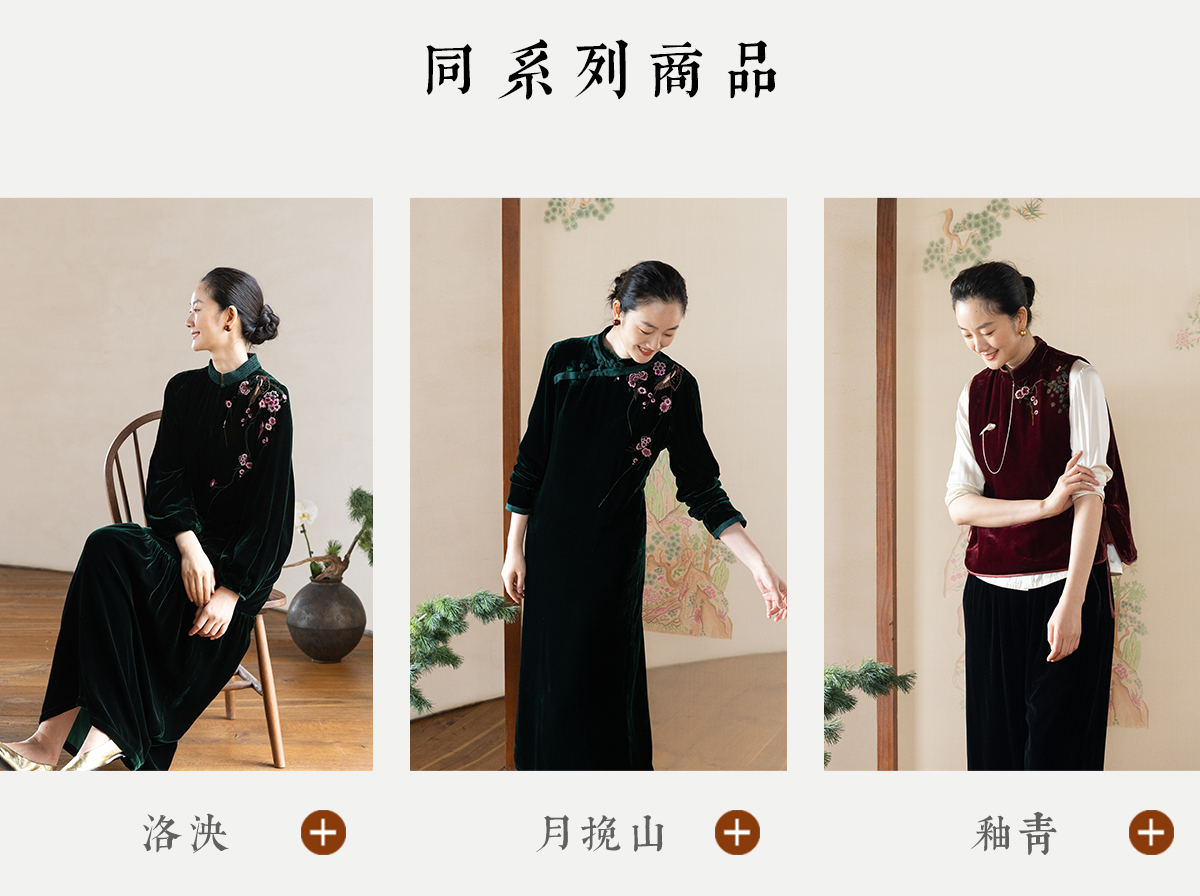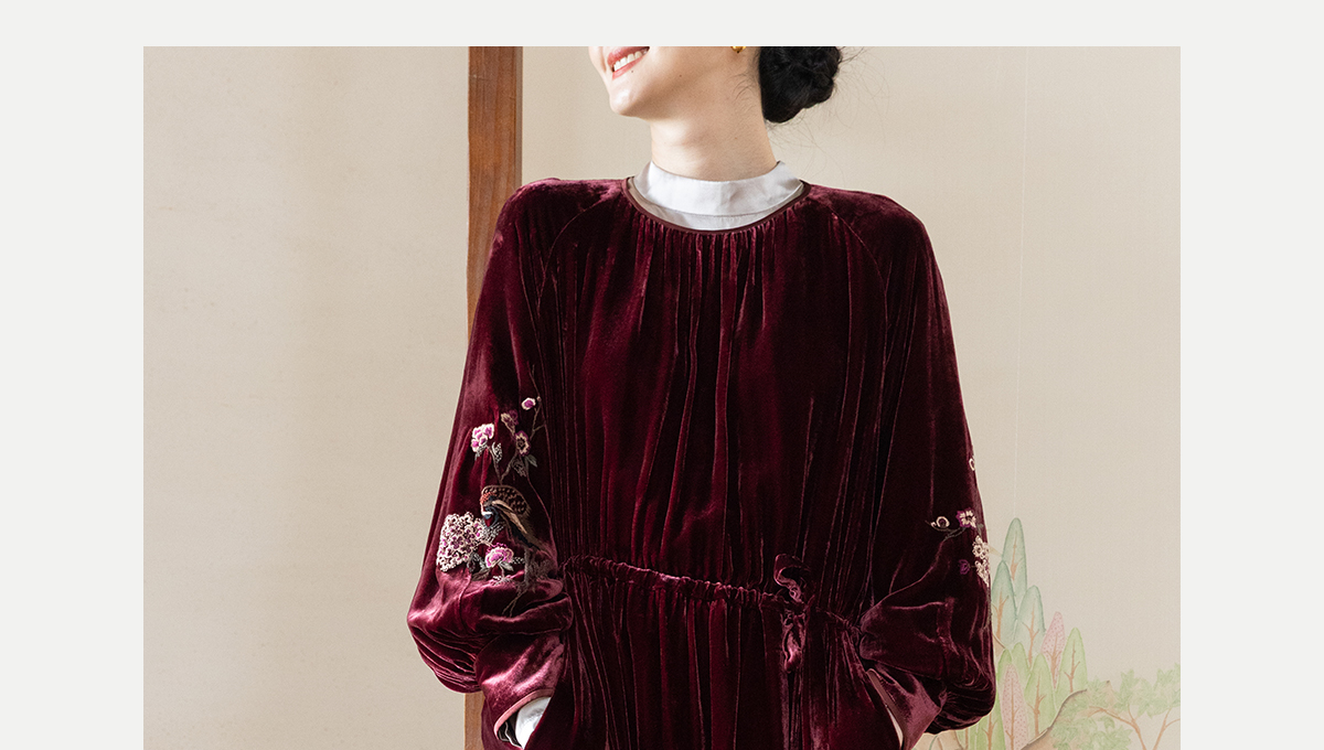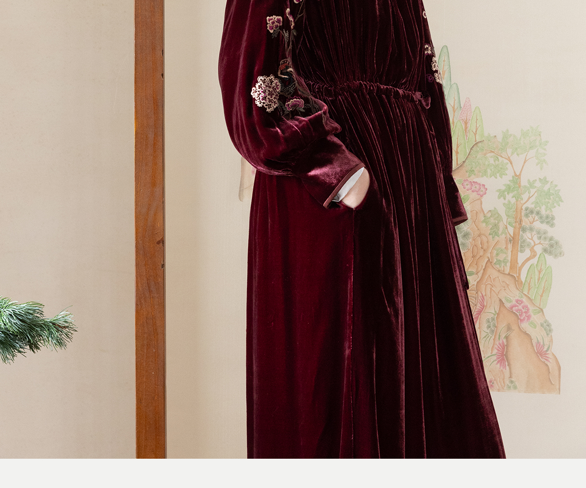 牧衣游原创 丝绒手工刺绣连衣裙新款宽松气质圆领中式长裙 月谣