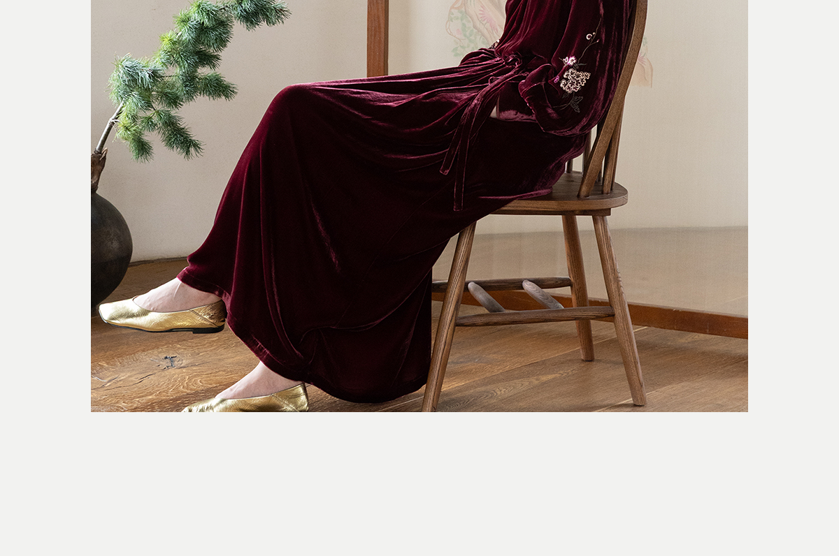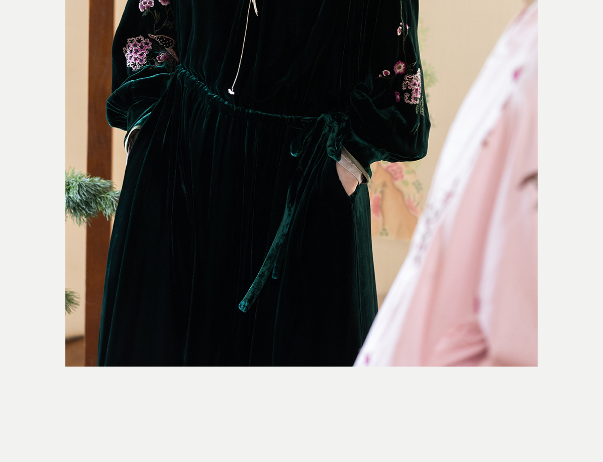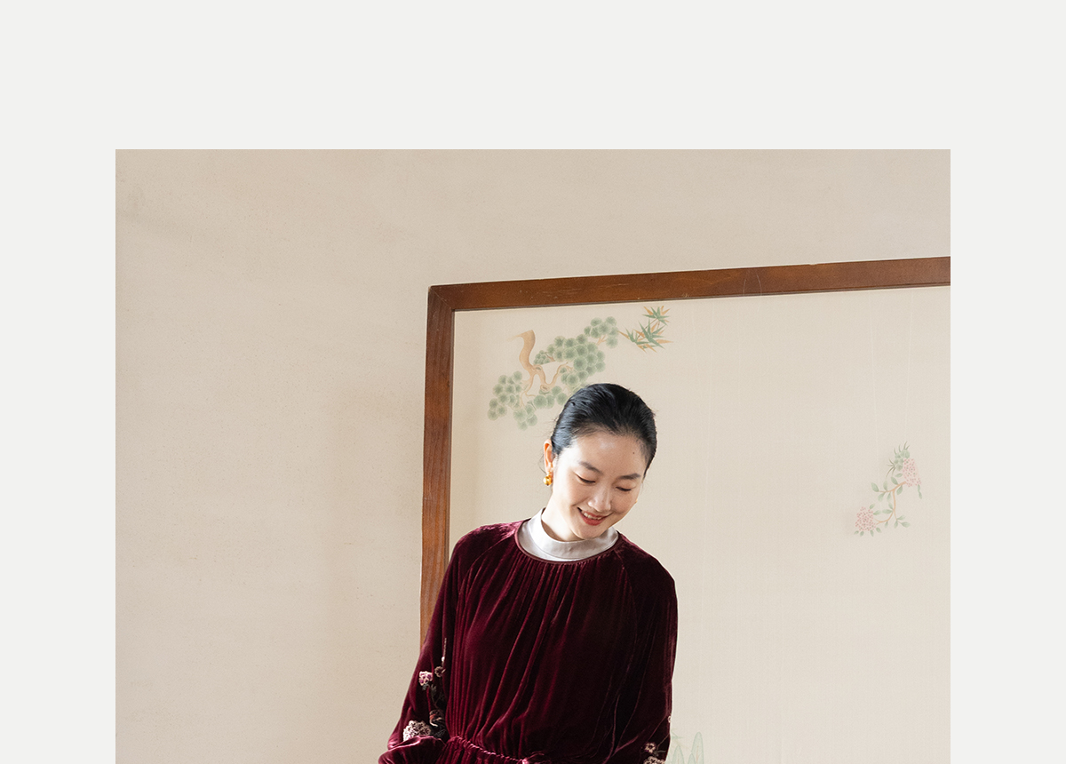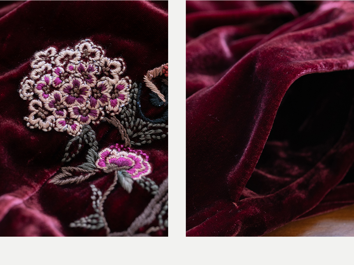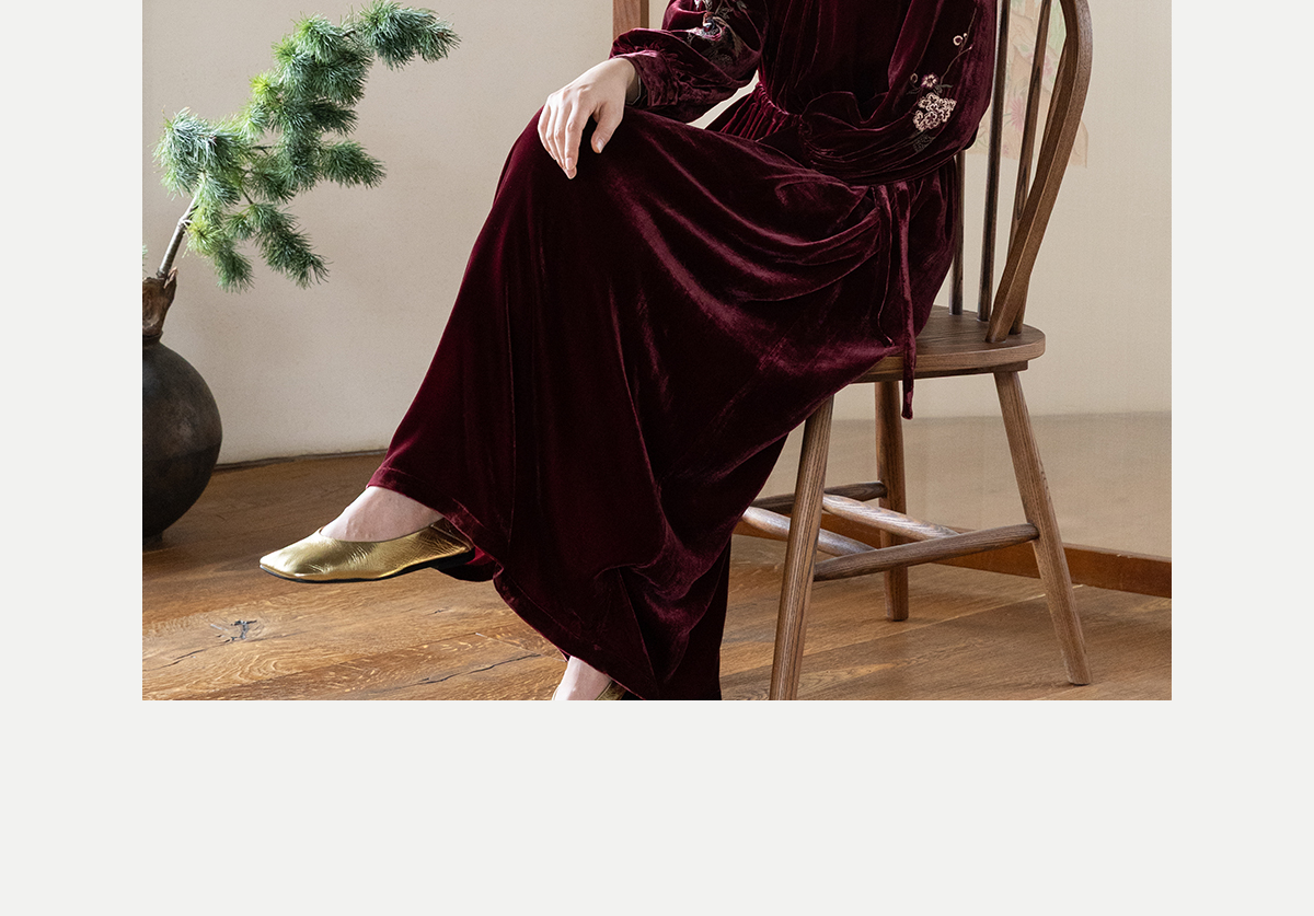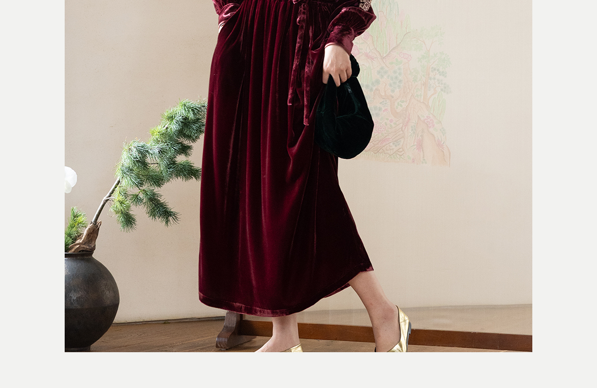 牧衣游原创 丝绒手工刺绣连衣裙新款宽松气质圆领中式长裙 月谣