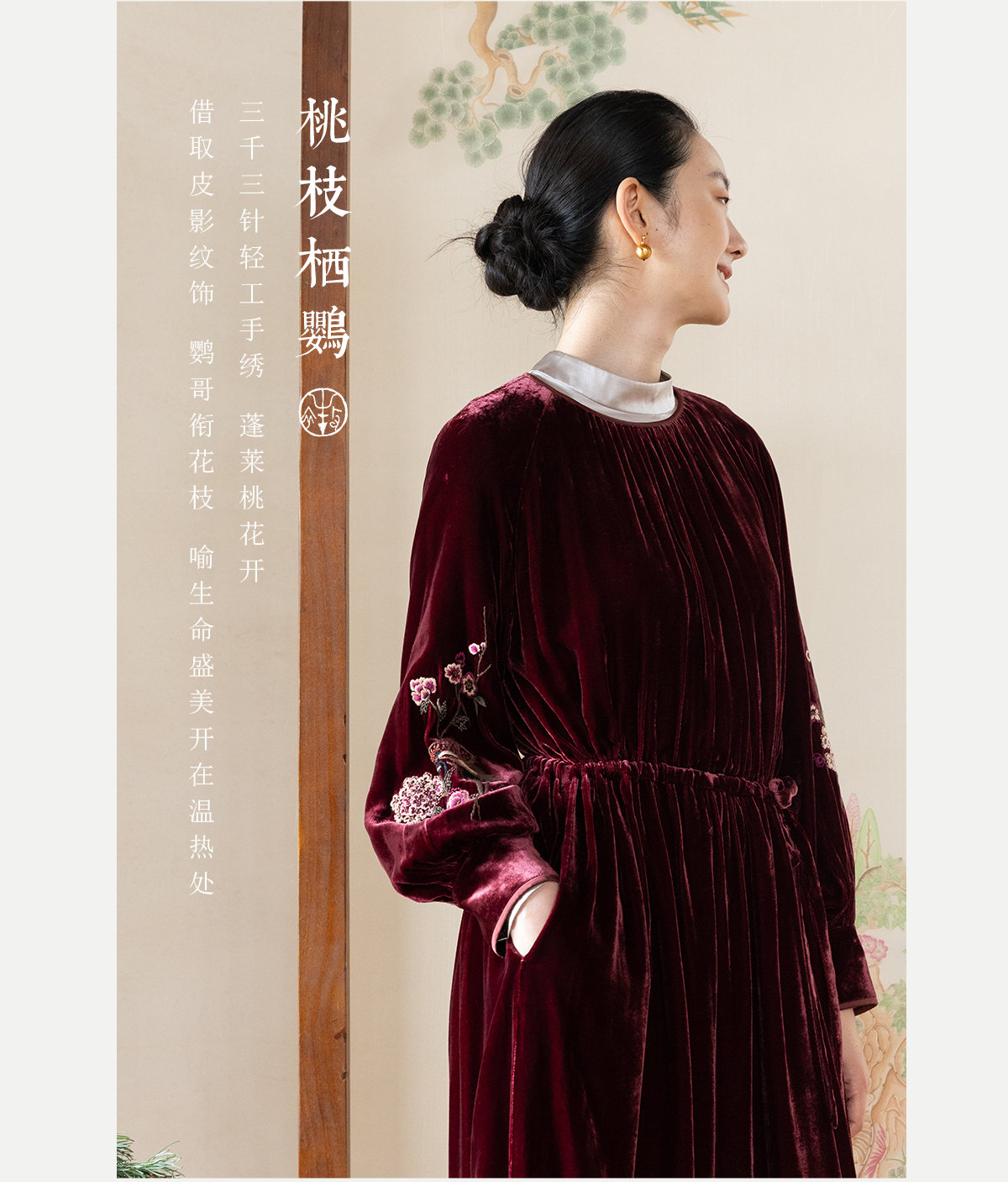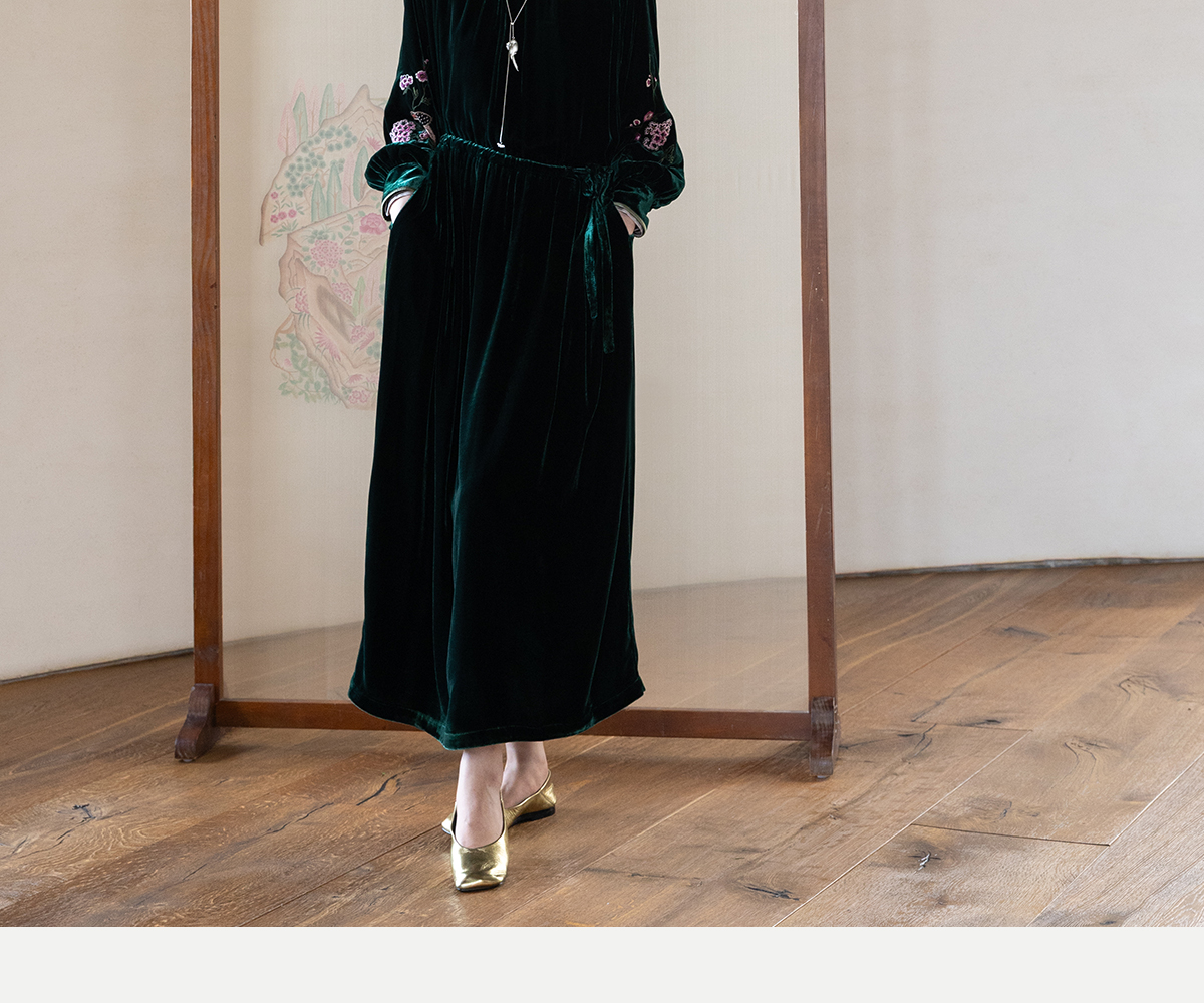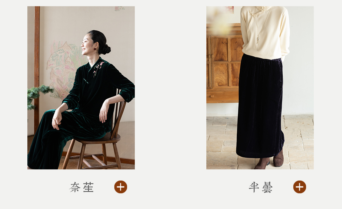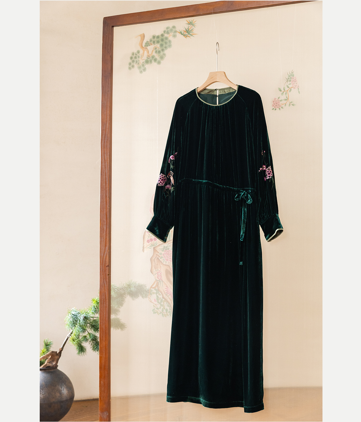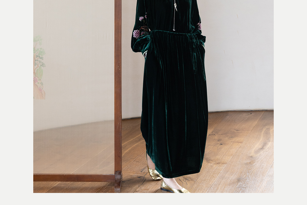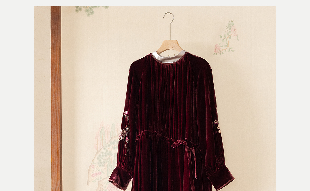 牧衣游原创 丝绒手工刺绣连衣裙新款宽松气质圆领中式长裙 月谣