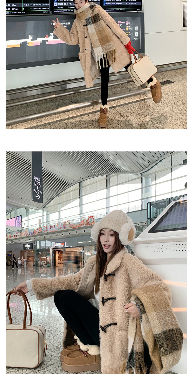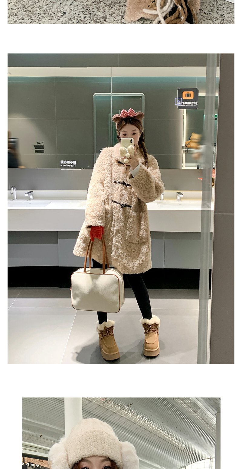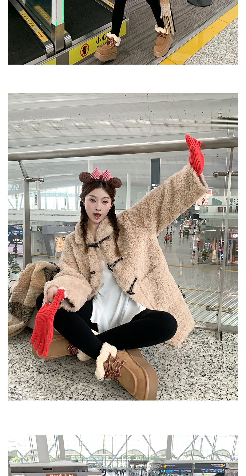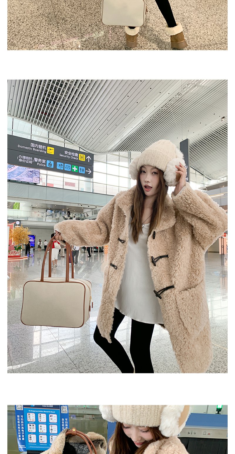 <曾小咸推荐>杏色翻领毛毛牛角扣中长款外套