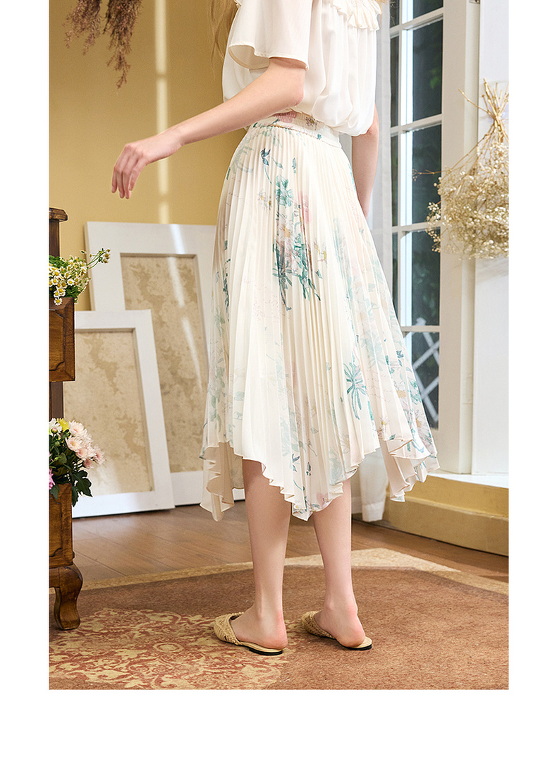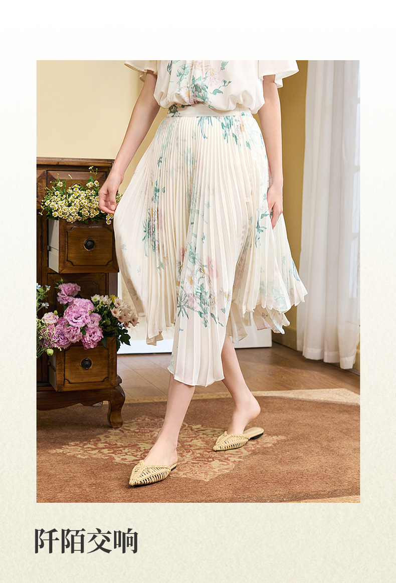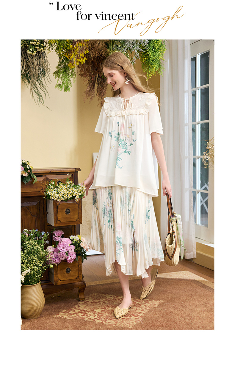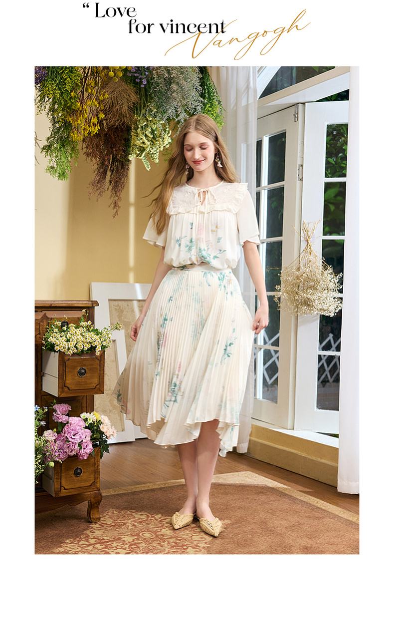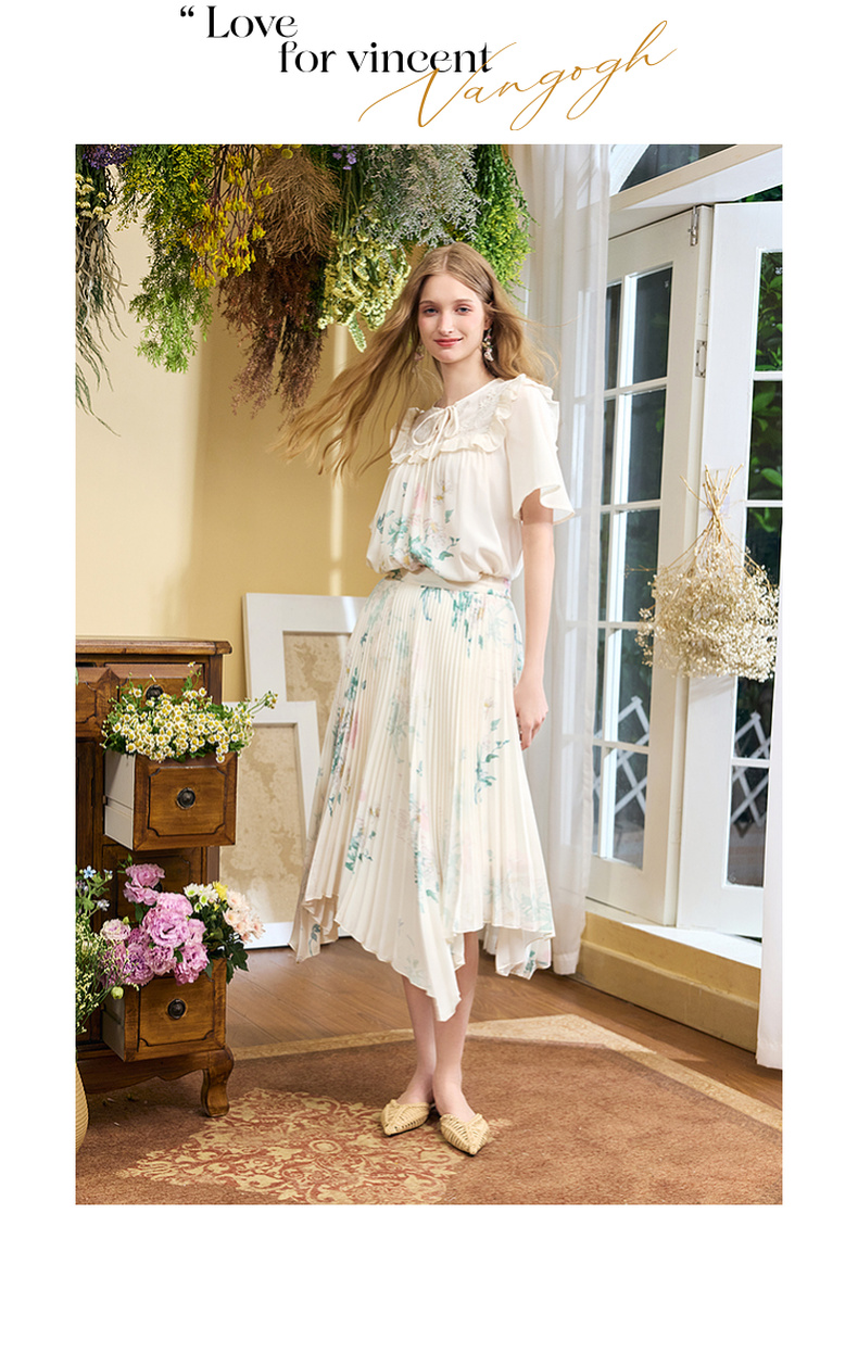 两三事梵高文艺阡陌交响2024夏季新款碎花印花不规则百褶裙半身裙